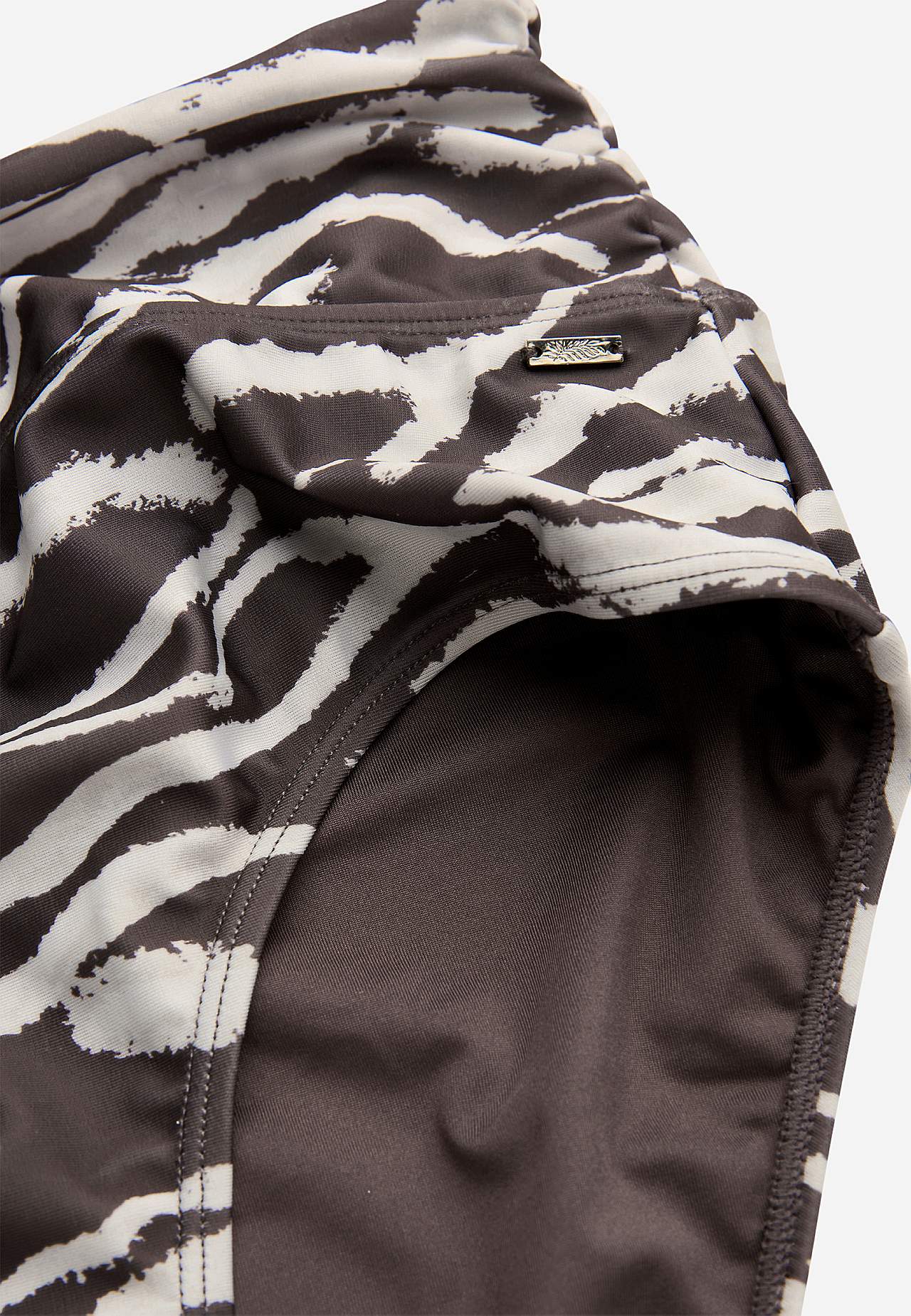 Gemustertes Bikinihöschen aus recyceltem Polyester. Einstellbare Höhe in der Taille mit faltbarer Kante perfekt für jeden Stil. Kräuselungen an der Seitennaht. Vollständig gefütterte Innenseite sowohl vorne als auch hinten.