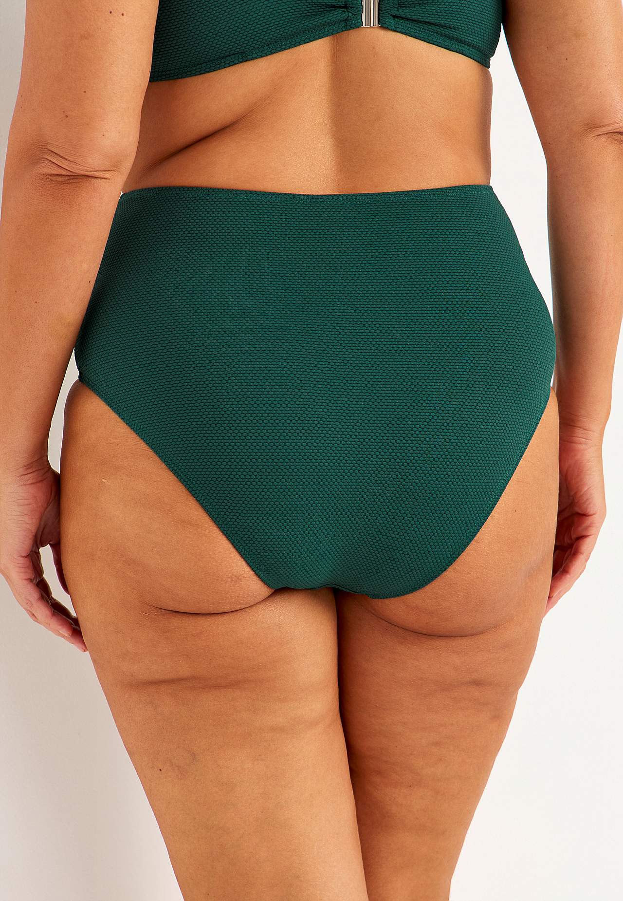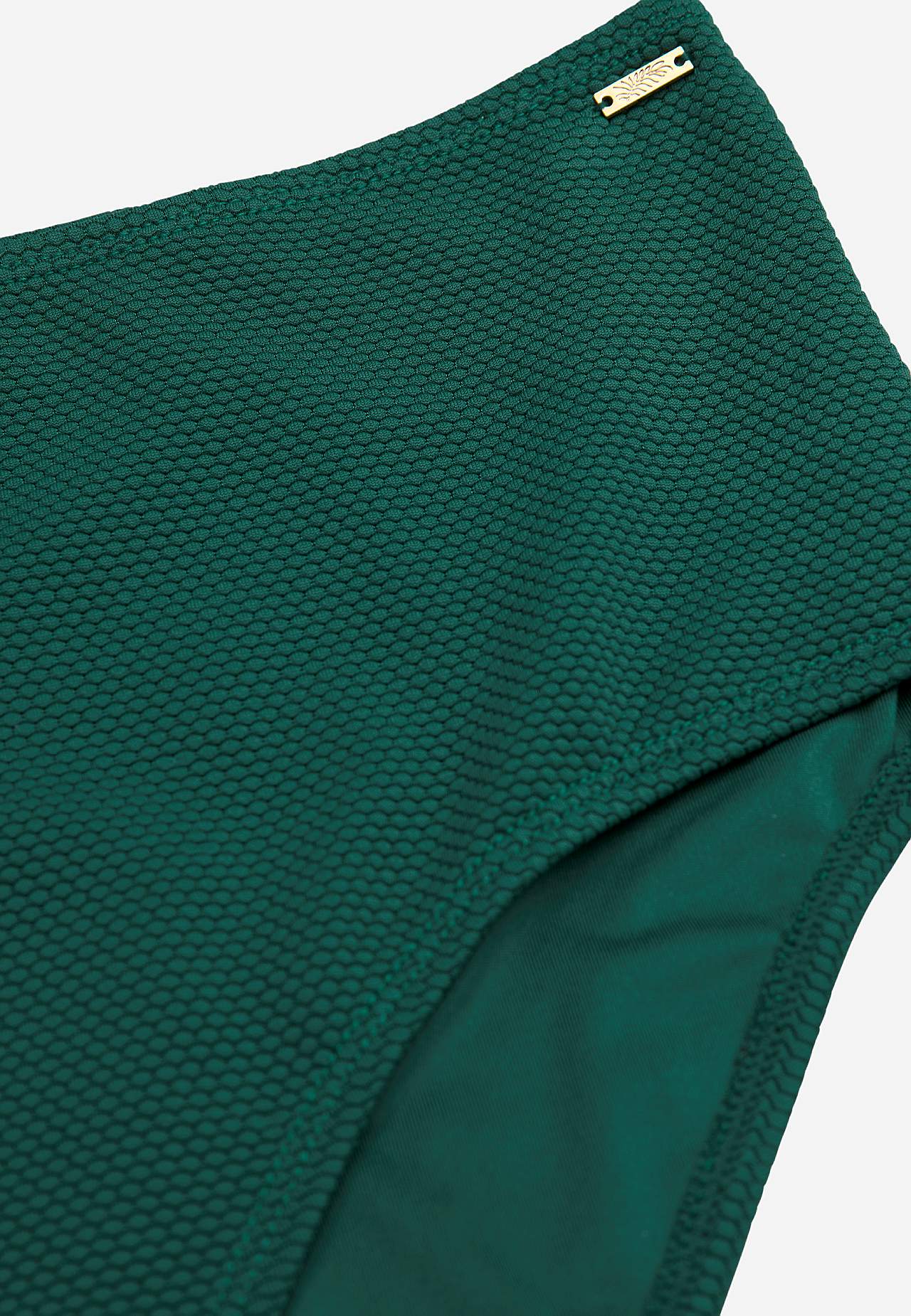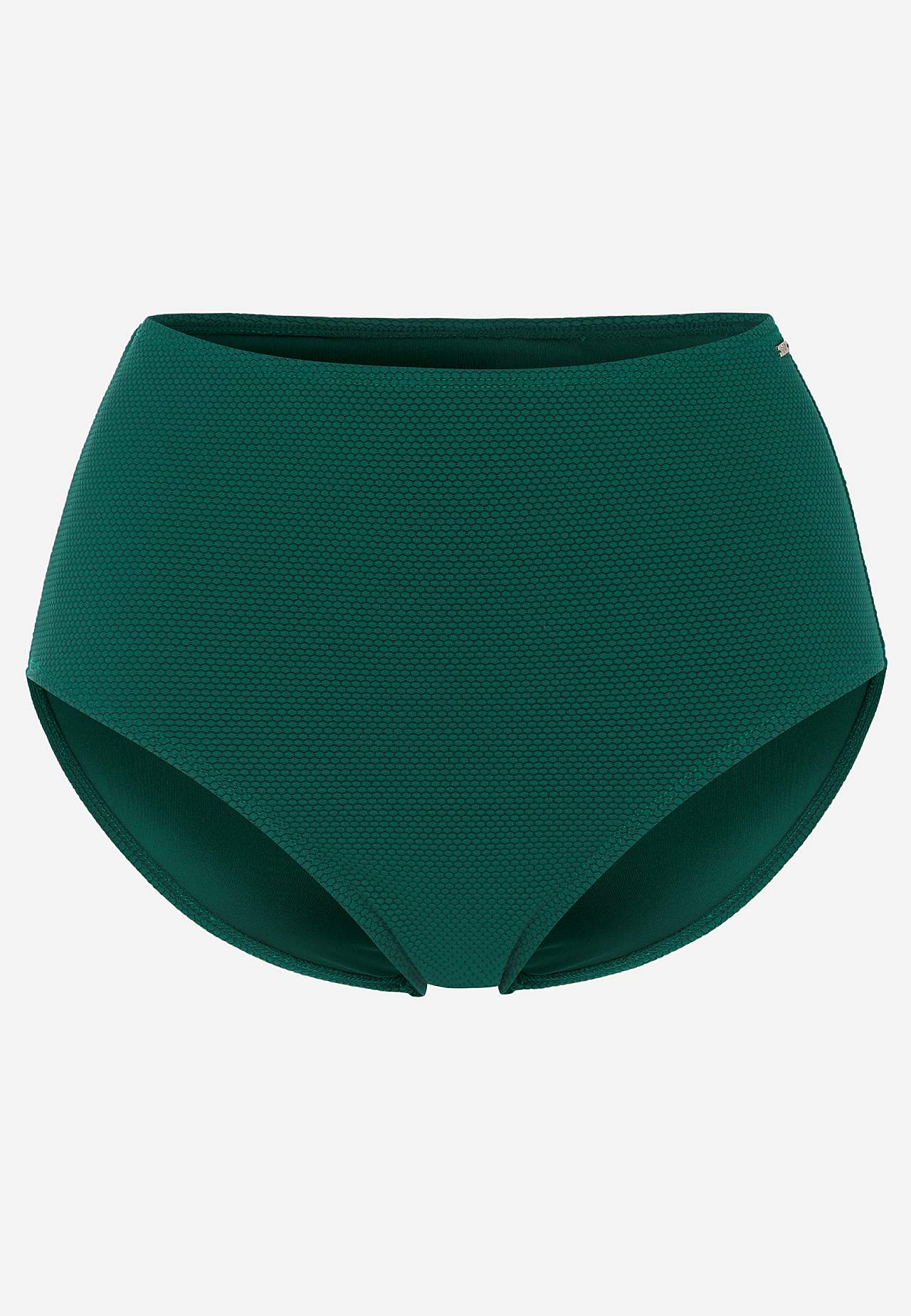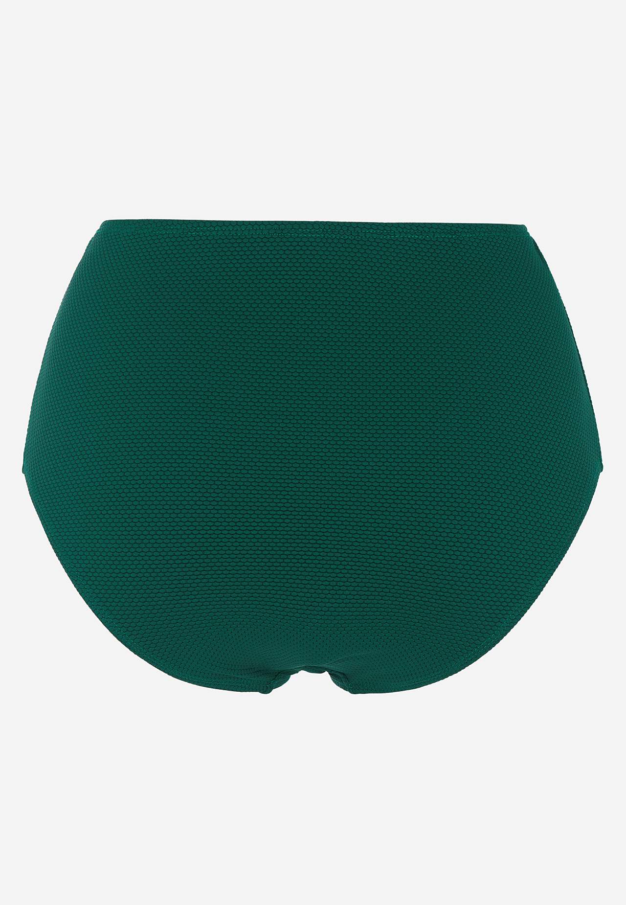 Bikini-Unterteil aus recyceltem Polyester mit einem Strukturmuster. Hoher Bund mit weichem Gummiband. Vollständig gefütterte Innenseite.
