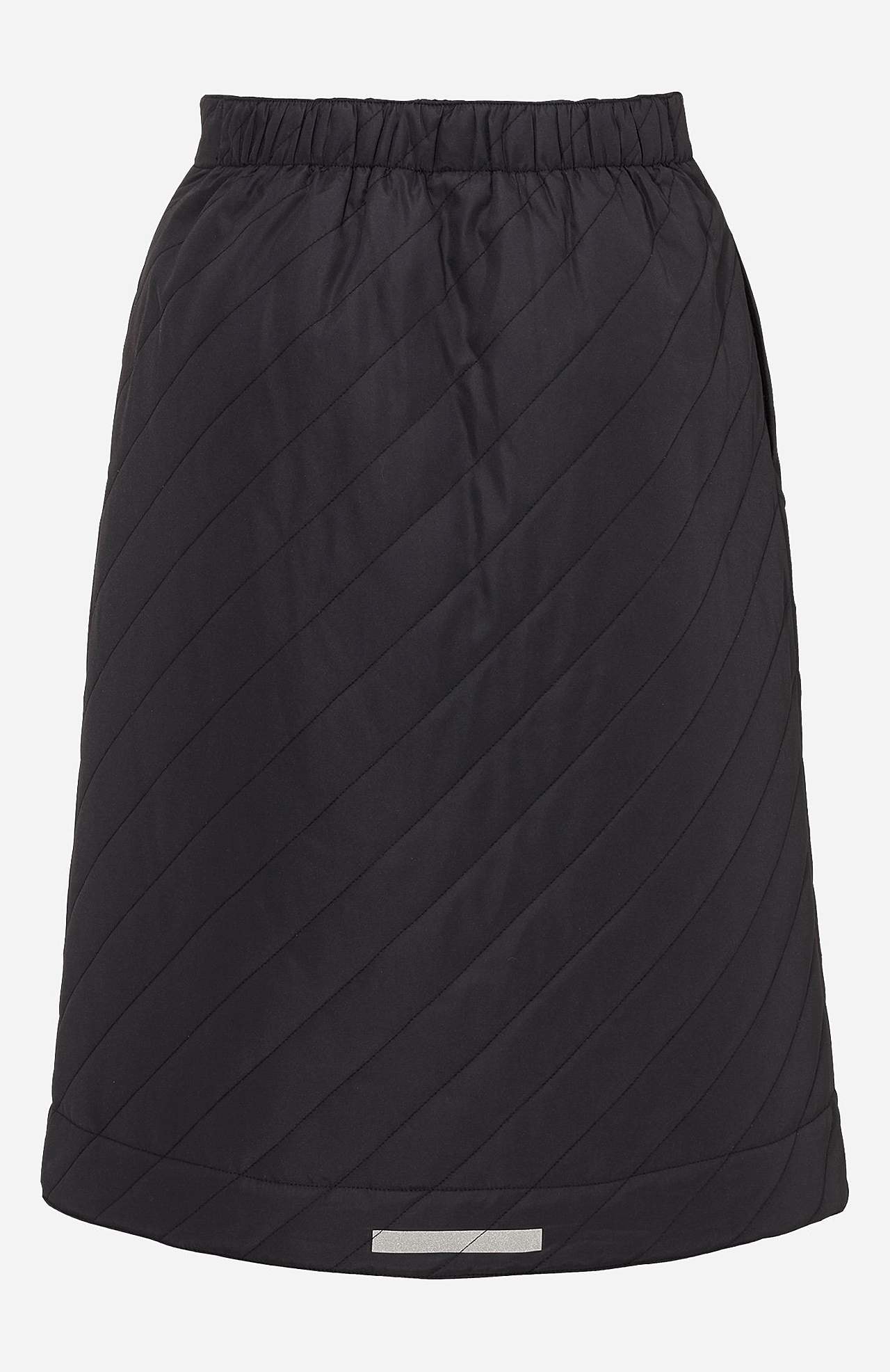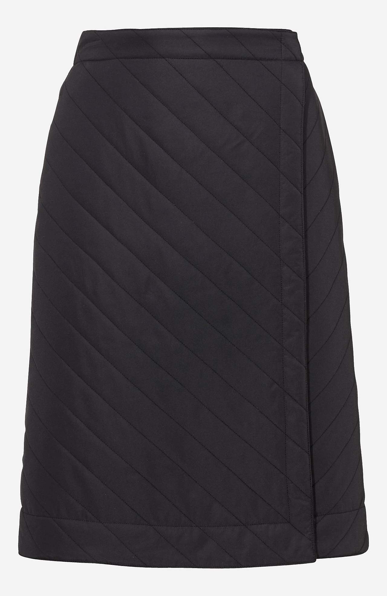 Wattierter, gesteppter Überrock mit Eingrifftaschen. Wickelschnitt vorne, wird mit Druckknöpfen in der Taille geschlossen. Gummizug in der Taille hinten. Reflexprint hinten. Fleecefutter. Länge ca. 70 cm in allen Größen.