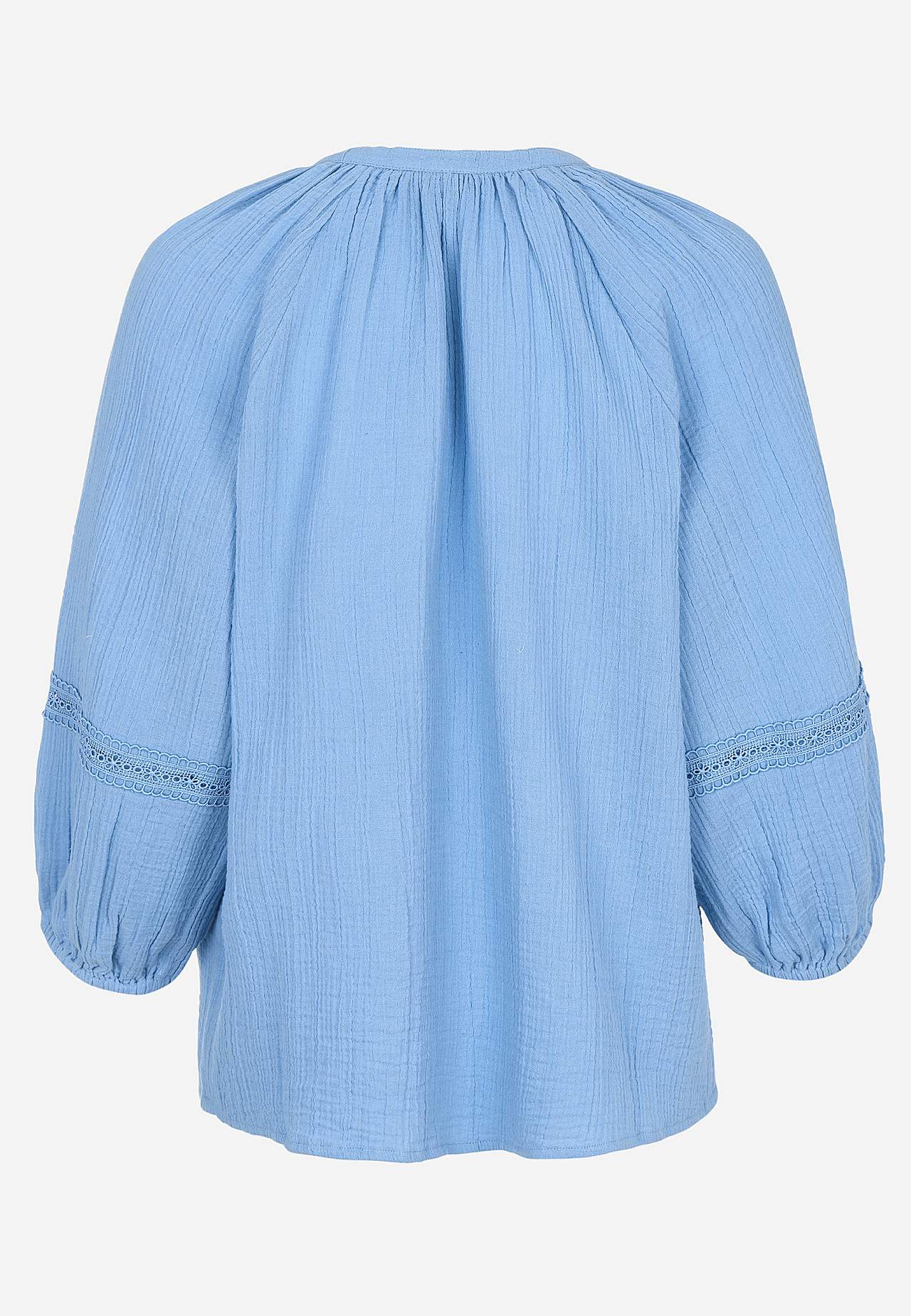 Luftige Bluse mit netten Spitzenbesätzen an den Ärmeln. Gewebtes Material aus süßer Baumwollgaze mit Struktur. Lockere Passform. Runder Ausschnitt mit kleinem V-Ausschnitt. Schließknöpfe vorne. 3/4-lange, breite Raglanärmel mit Puff und Gummiband an den Manschetten. Fein detaillierte Spitzenverzierung entlang der Raglannaht... Mehr erfahren
