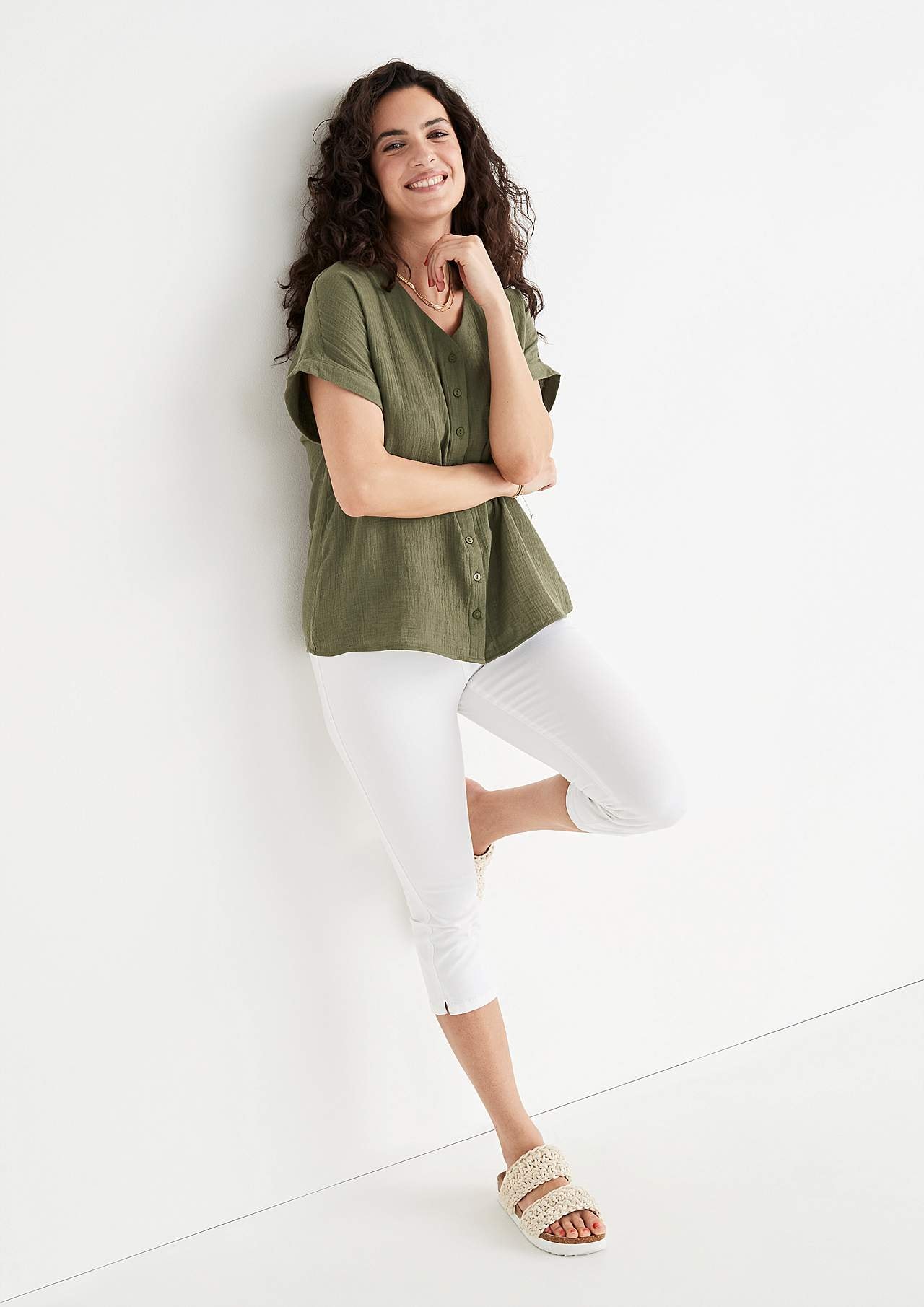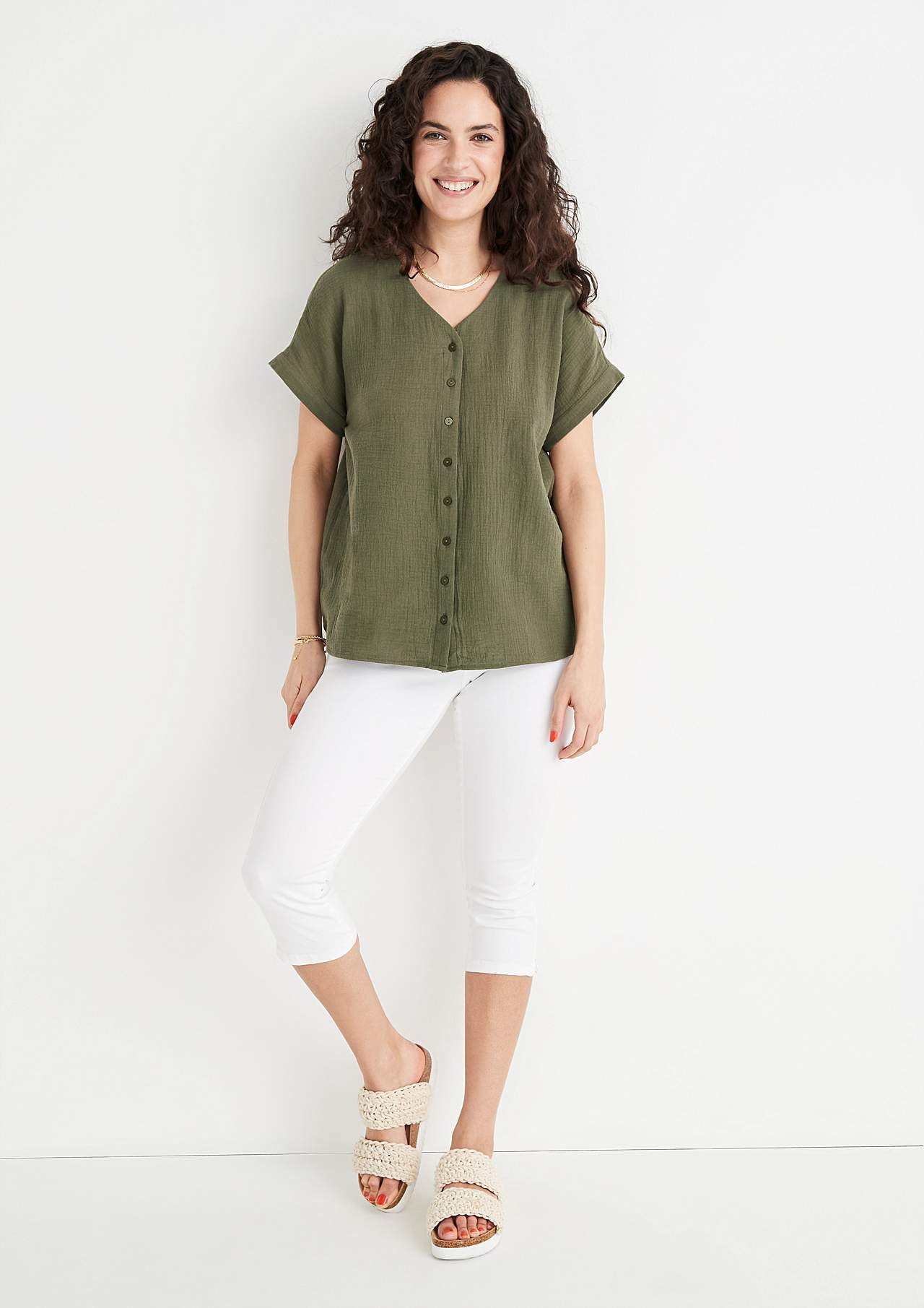 Bluse mit kurzen Ärmeln und einem V-Ausschnitt. Wunderschön luftige Doppelgaze mit waffelartiger Textur. Durchgeknöpftes Modell. Lässige Passform. Die Länge hängt von der Größe ab und beträgt ca. 66-81 cm (von der Schulter gemessen).