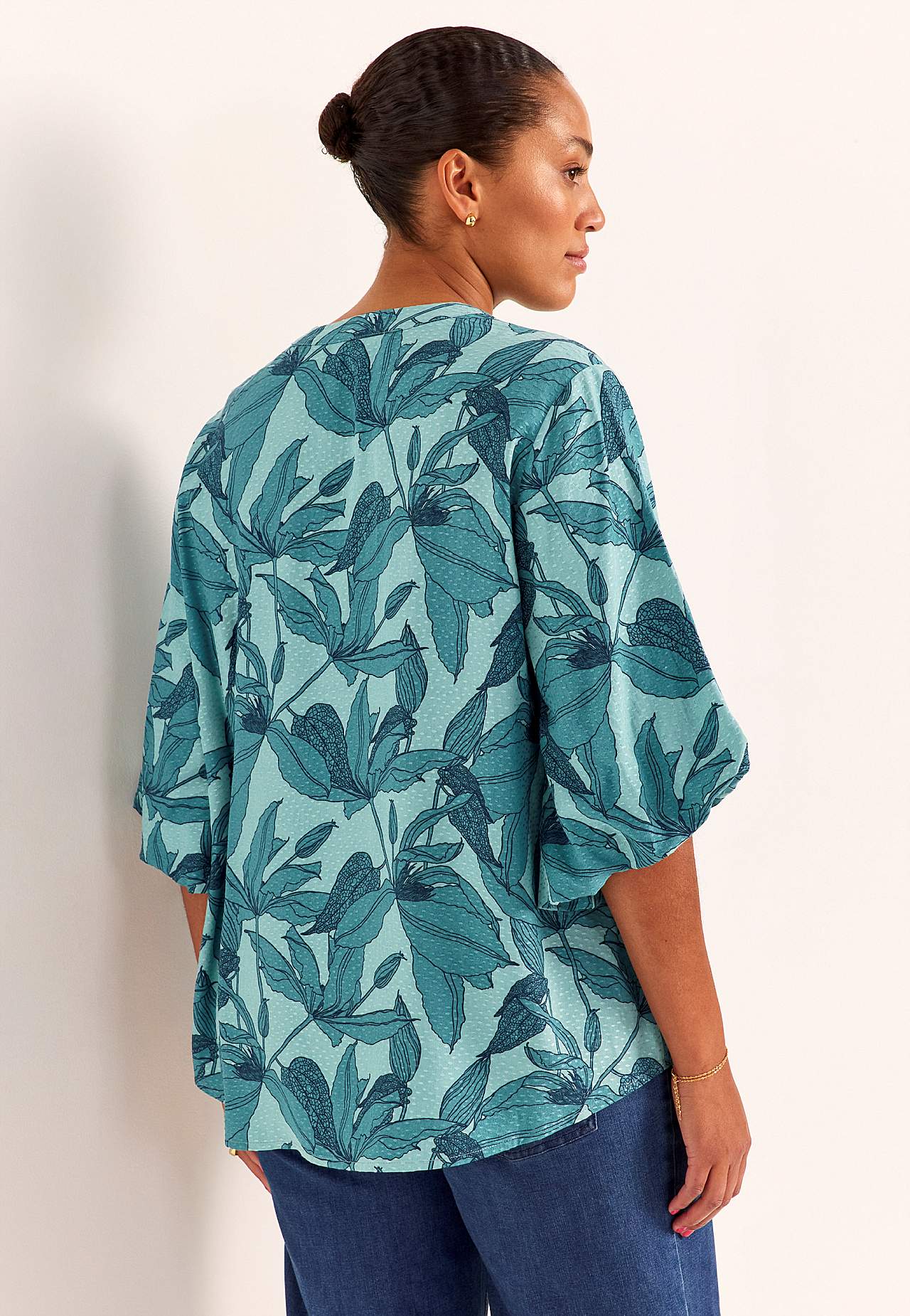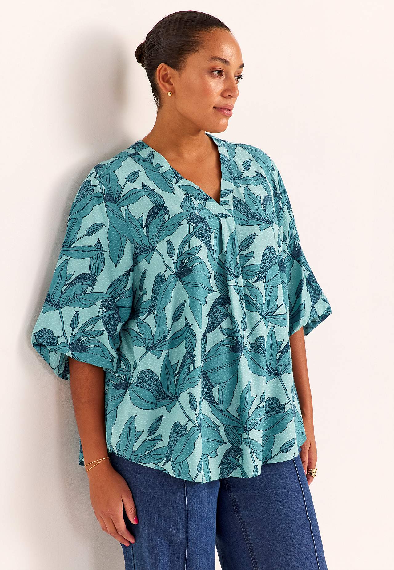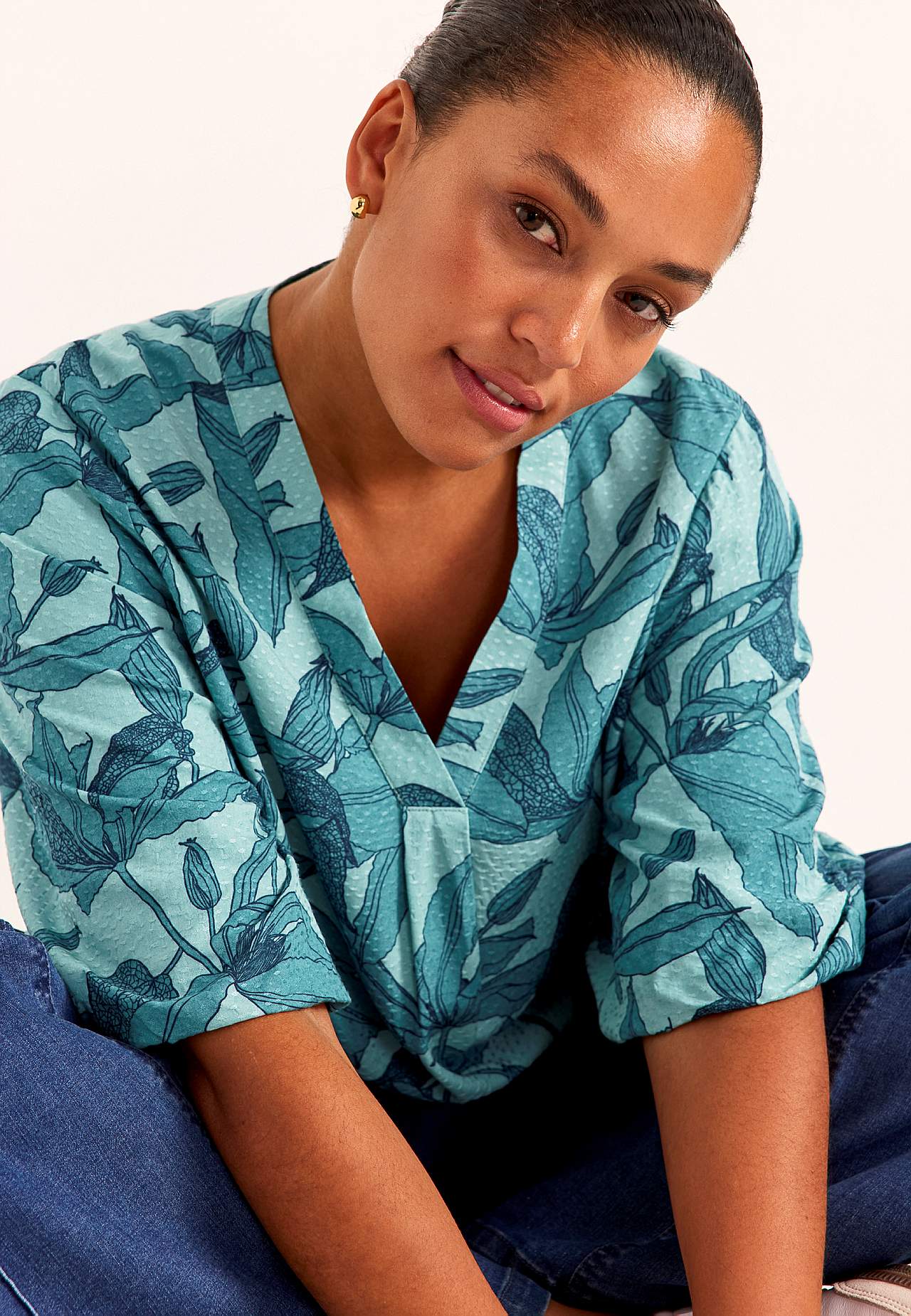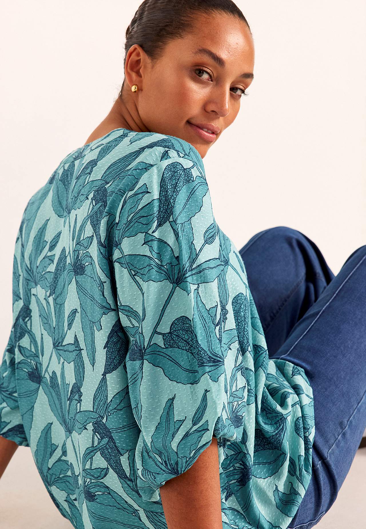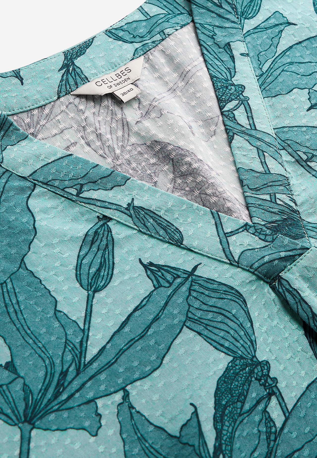 Party-Bluse aus Viskose mit süßem Faltenwurf. Dobby-Gewebe mit einem einzigartigen Webmuster. Sehr weich, mit schöner Textur und schönem Glanz. Druck im gleichen Farbton mit einem Blumen-Muster. Normale Passform mit etwas breiterem Unterteil. V-Ausschnitt mit einer Falte vorne. Runder Saum. Die Länge hängt von der Größe ab ... Mehr erfahren
