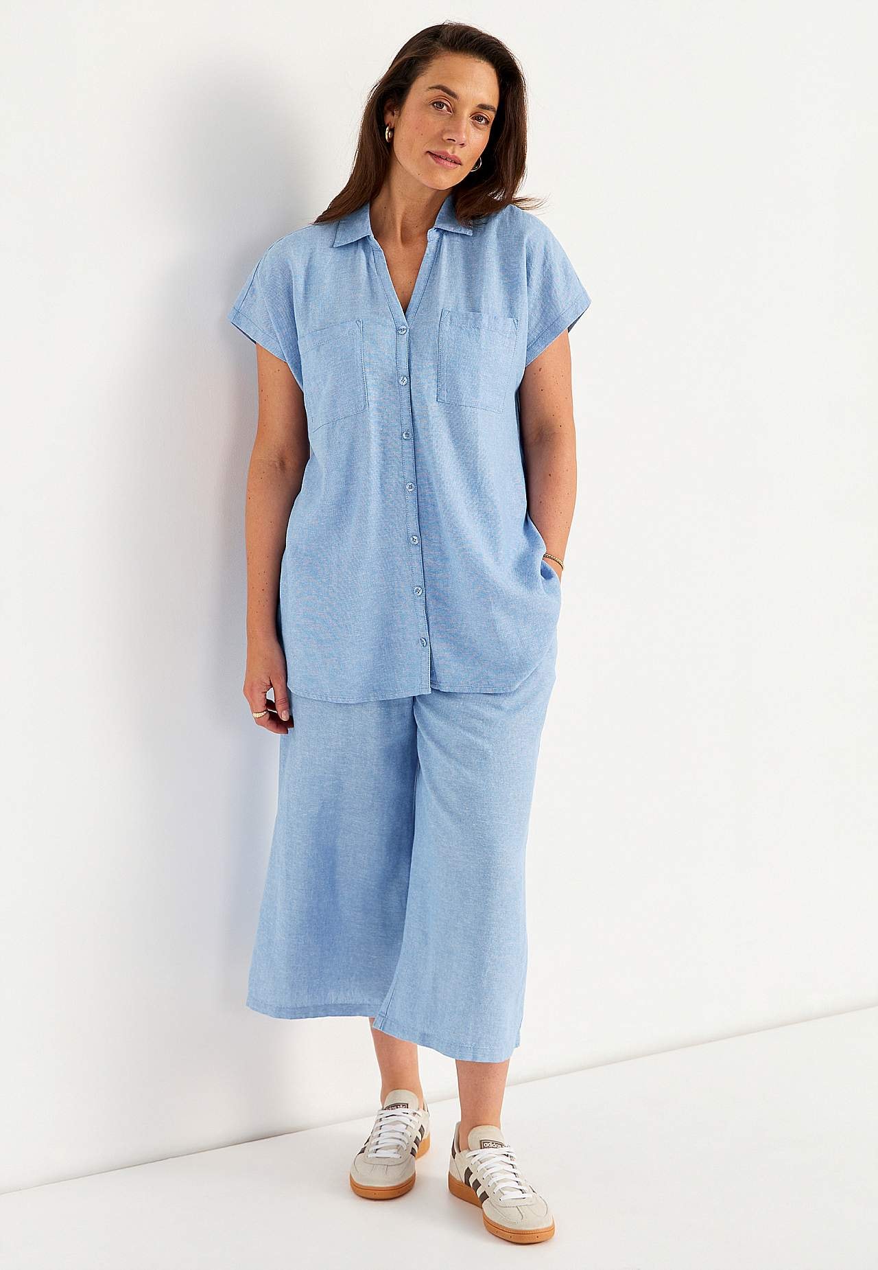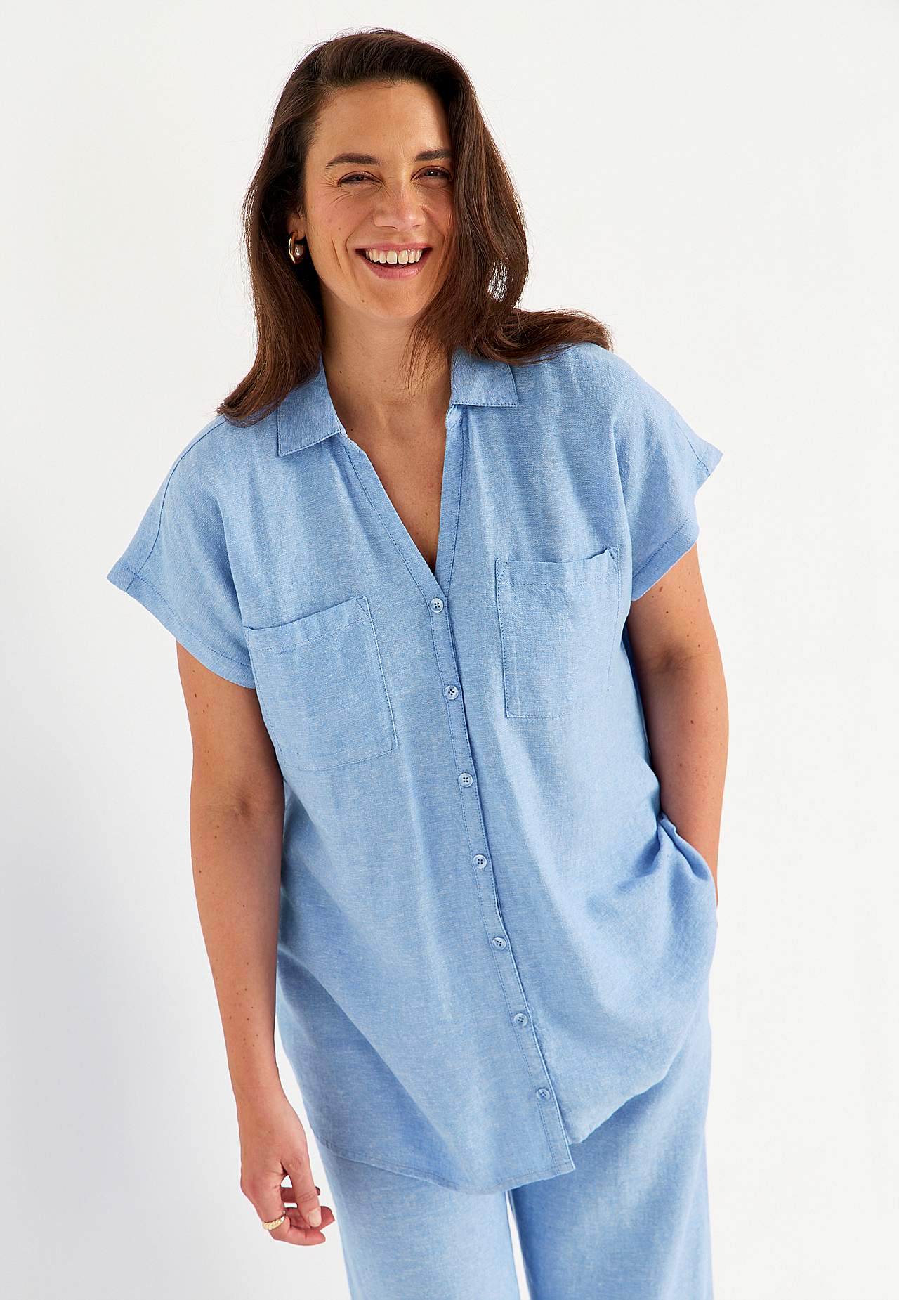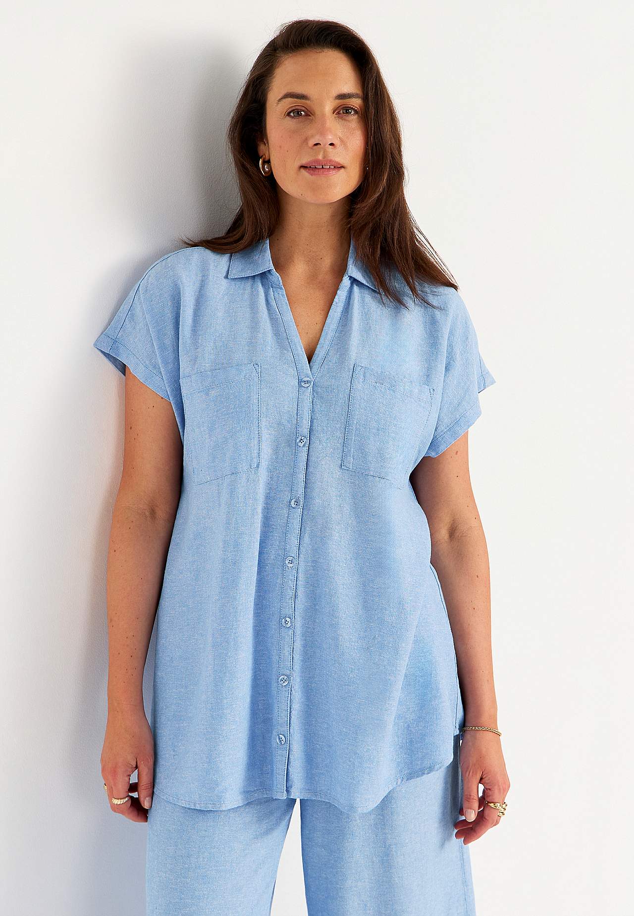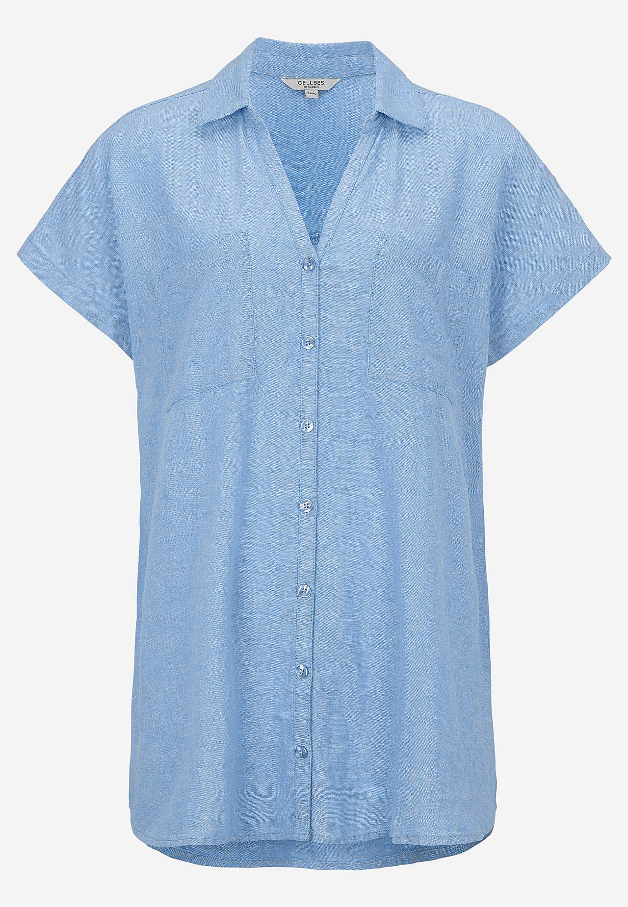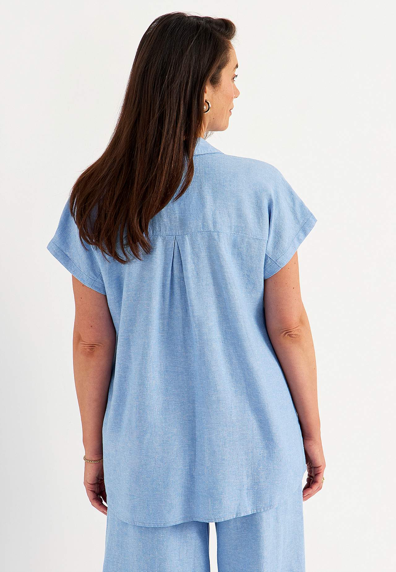 Gewebtes langes Hemd aus luftiger Leinen- und Viskosemischung. Weiches, etwas schwereres Material mit natürlicher Struktur. Lässige Passform. Brusttaschen. Passe hinten mit dekorativer Falte. Runder Saum. Die Länge hängt von der Größe ab und beträgt ca. 77-84 cm (von der Schulter gemessen).