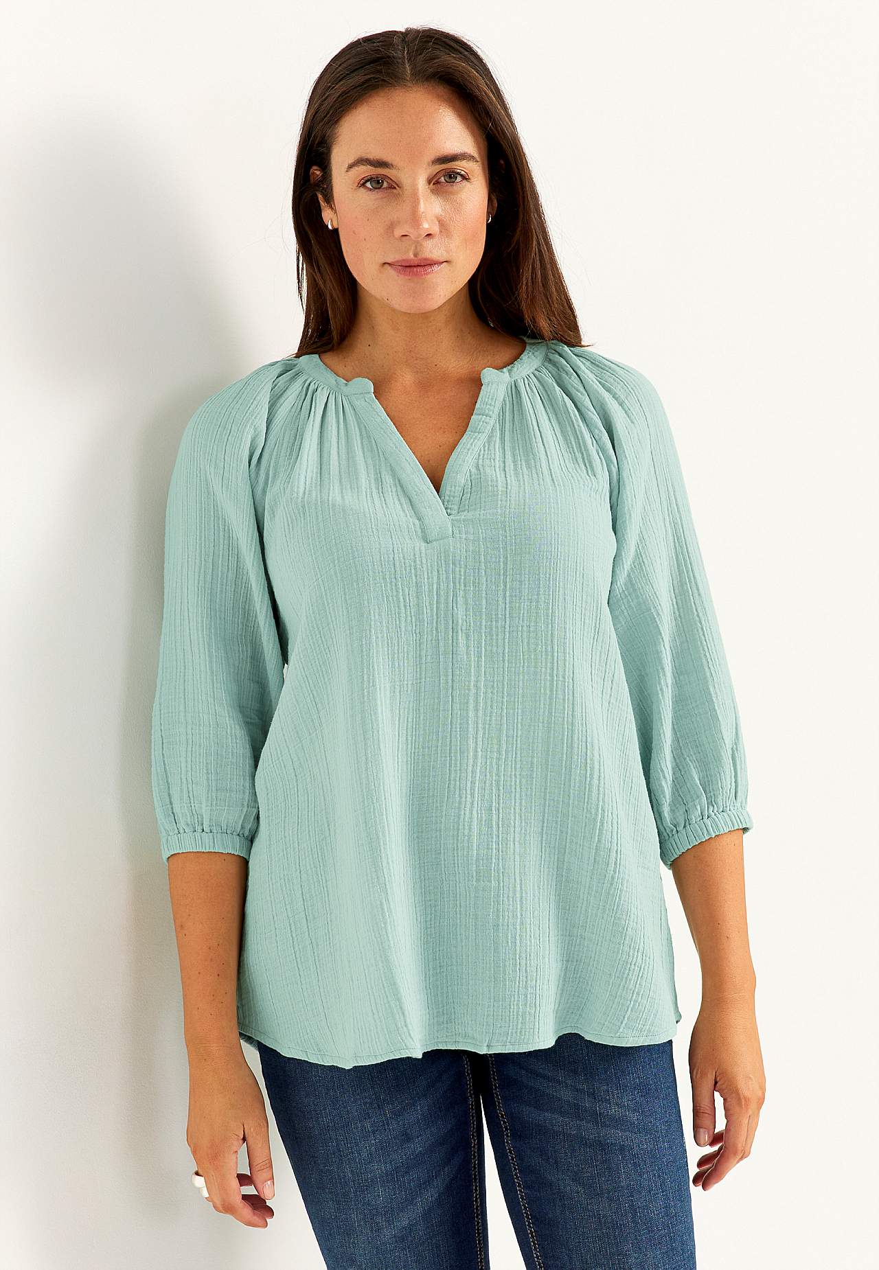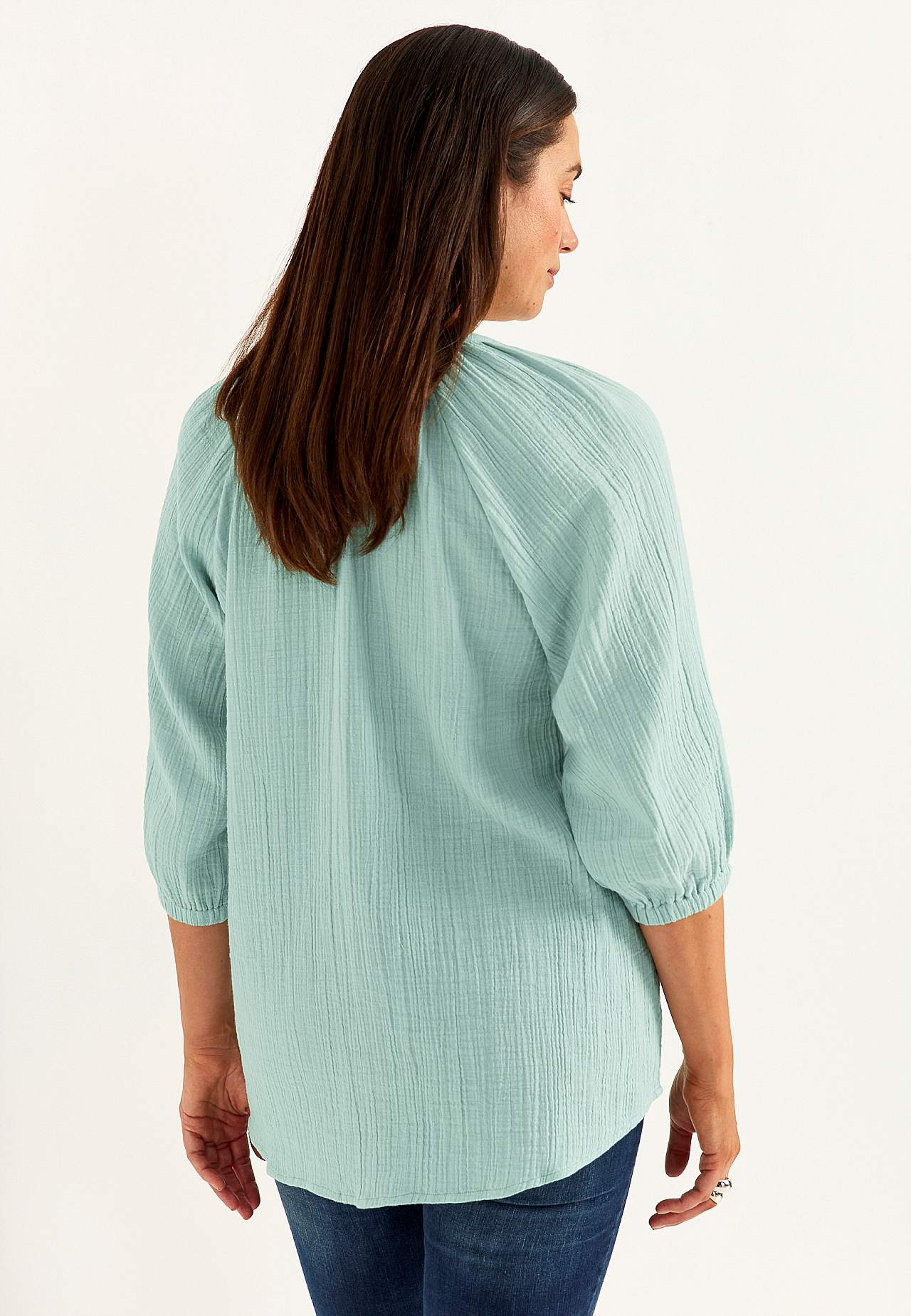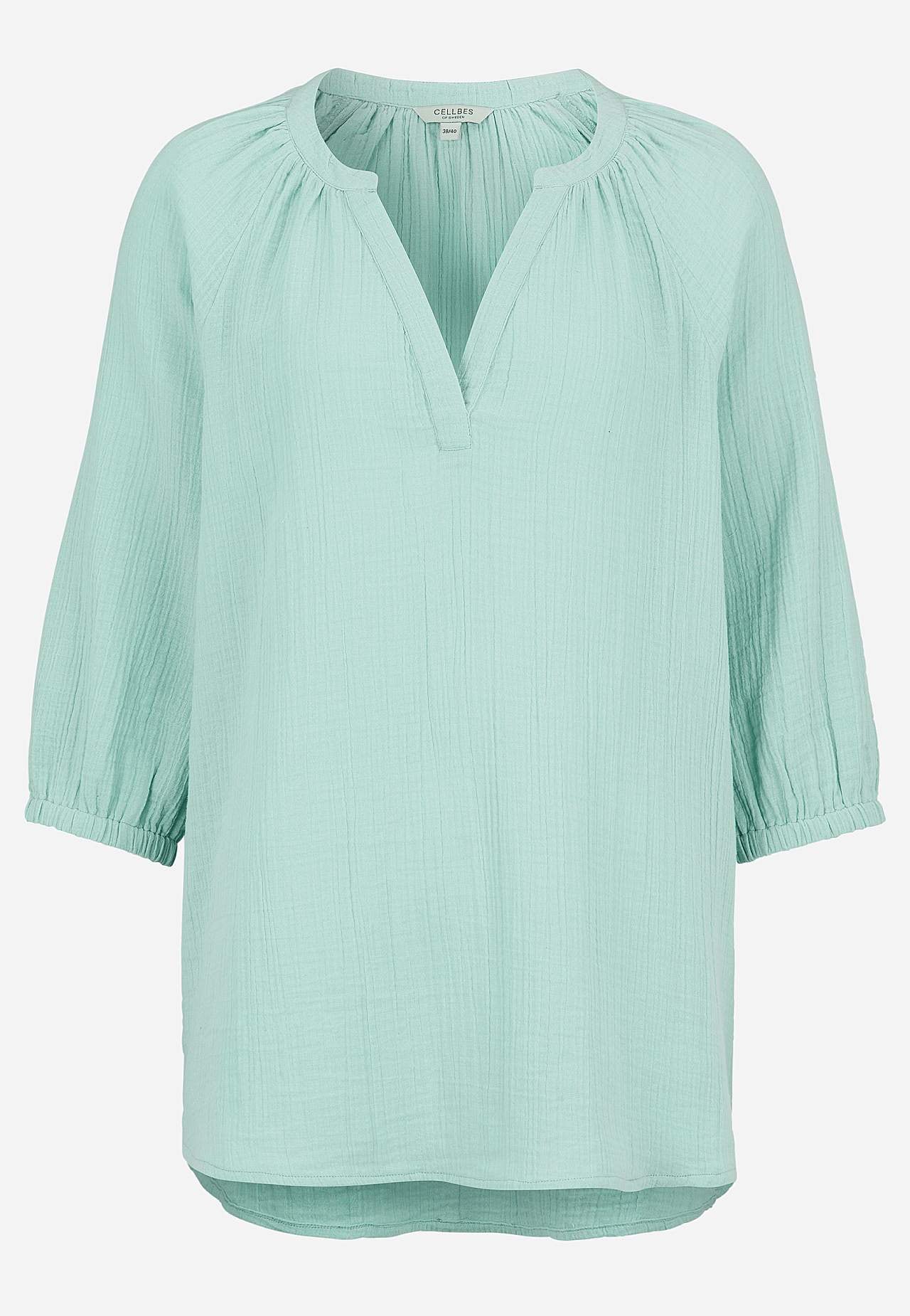 Tunika aus süßer Baumwollgaze mit natürlicher Struktur. Gewebtes, weiches Material mit kühlendem, luftigem Gefühl. Lockere Passform in leichter A-Linie. Überschnittener Ausschnitt mit V-Ausschnitt. Runder Saum etwas länger am Rücken. Die Länge hängt von der Größe ab und beträgt ca. 73-80 cm (von der Schulter gemessen).
