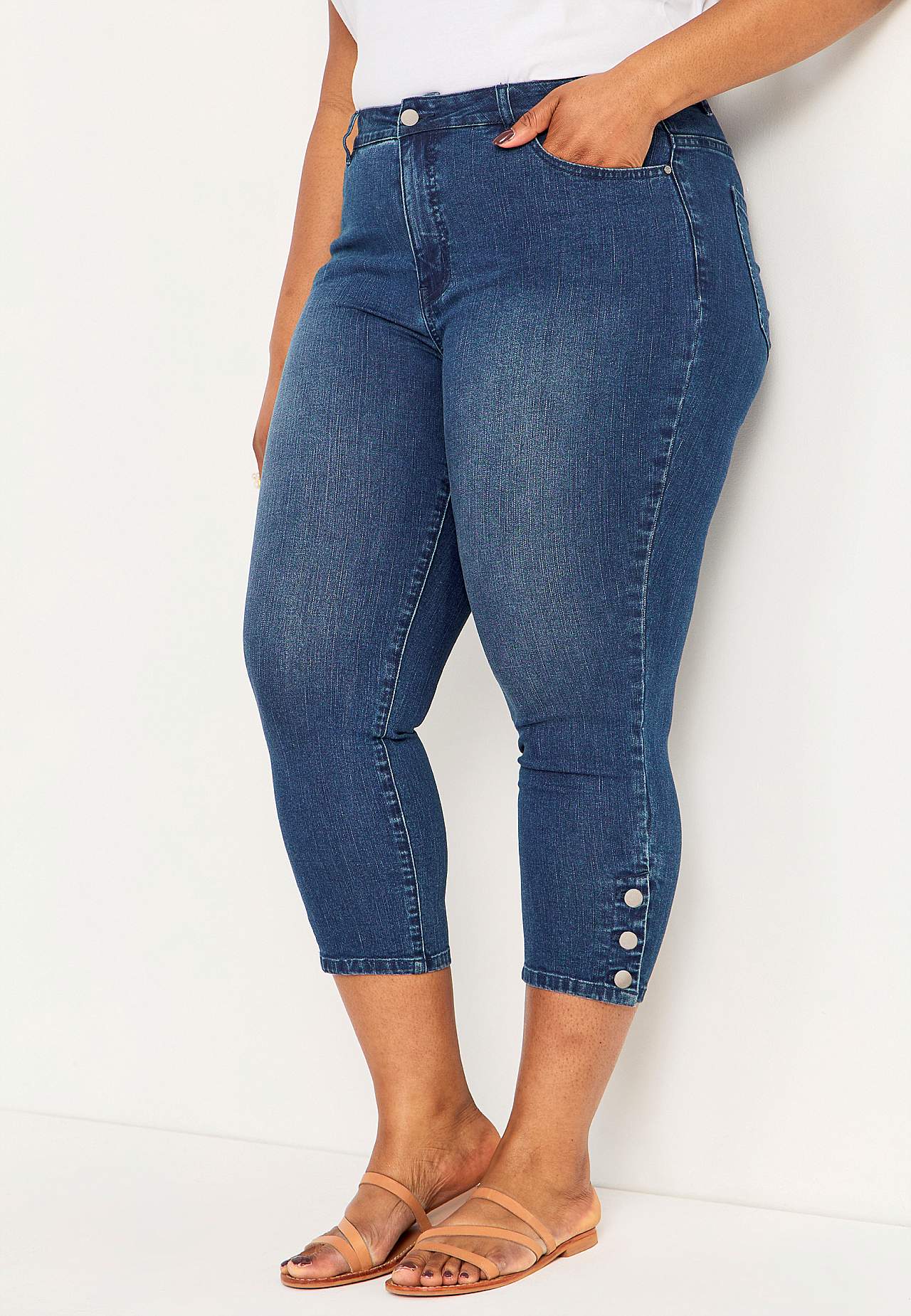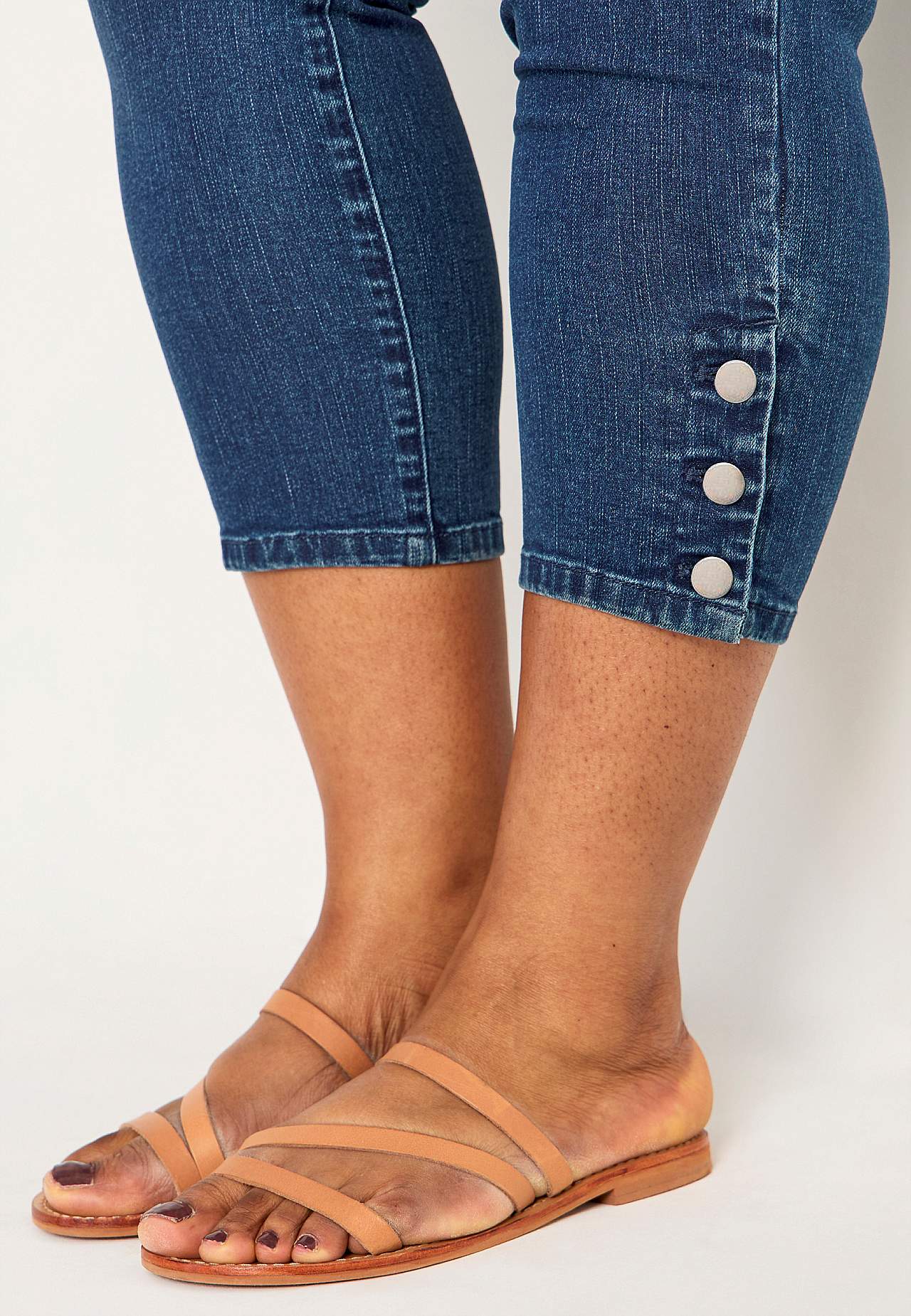 Stilvolles Modell mit Fünf-Taschen-Design und Knöpfen am Beinsaum. Normale Taille mit Reißverschluss und Schließknopf. Die Innenbeinlänge beträgt ca. 61 cm bei allen Größen. Vordere Bundhöhe variiert je nach Größe: ca. 25-34 cm.