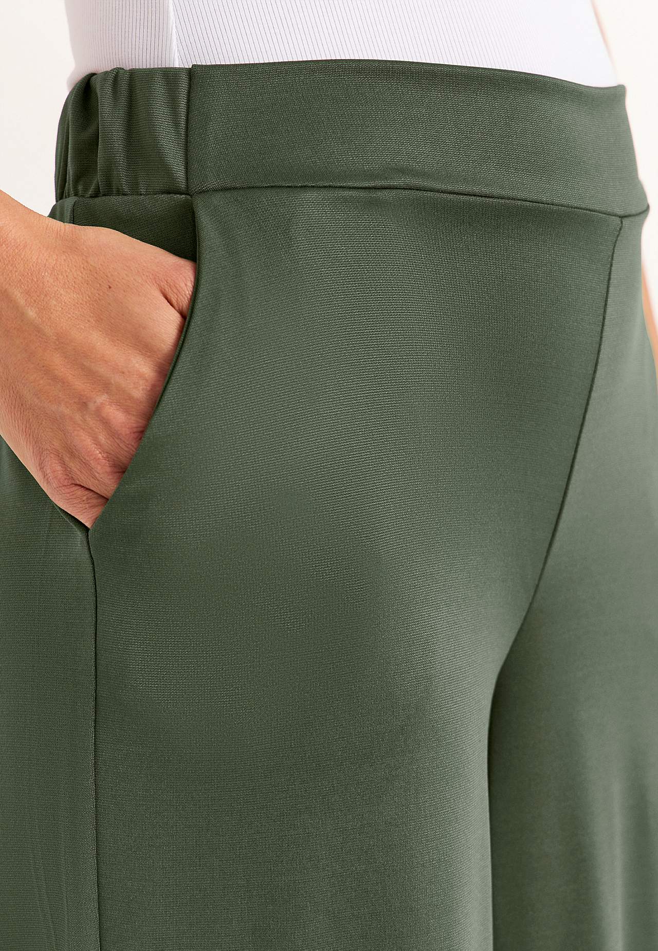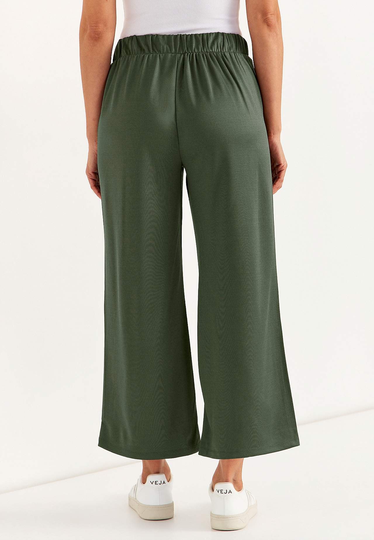 Knöchelhose mit breiten Beinen. Glatter Jersey mit Stretch und nettem Lüster. Breiter Bund mit verstecktem Gummiband hinten. Seitennahttaschen. Die Innenbeinlänge beträgt ca. 62 cm bei allen Größen. Vordere Bundhöhe variiert je nach Größe: ca. 26-37 cm.
