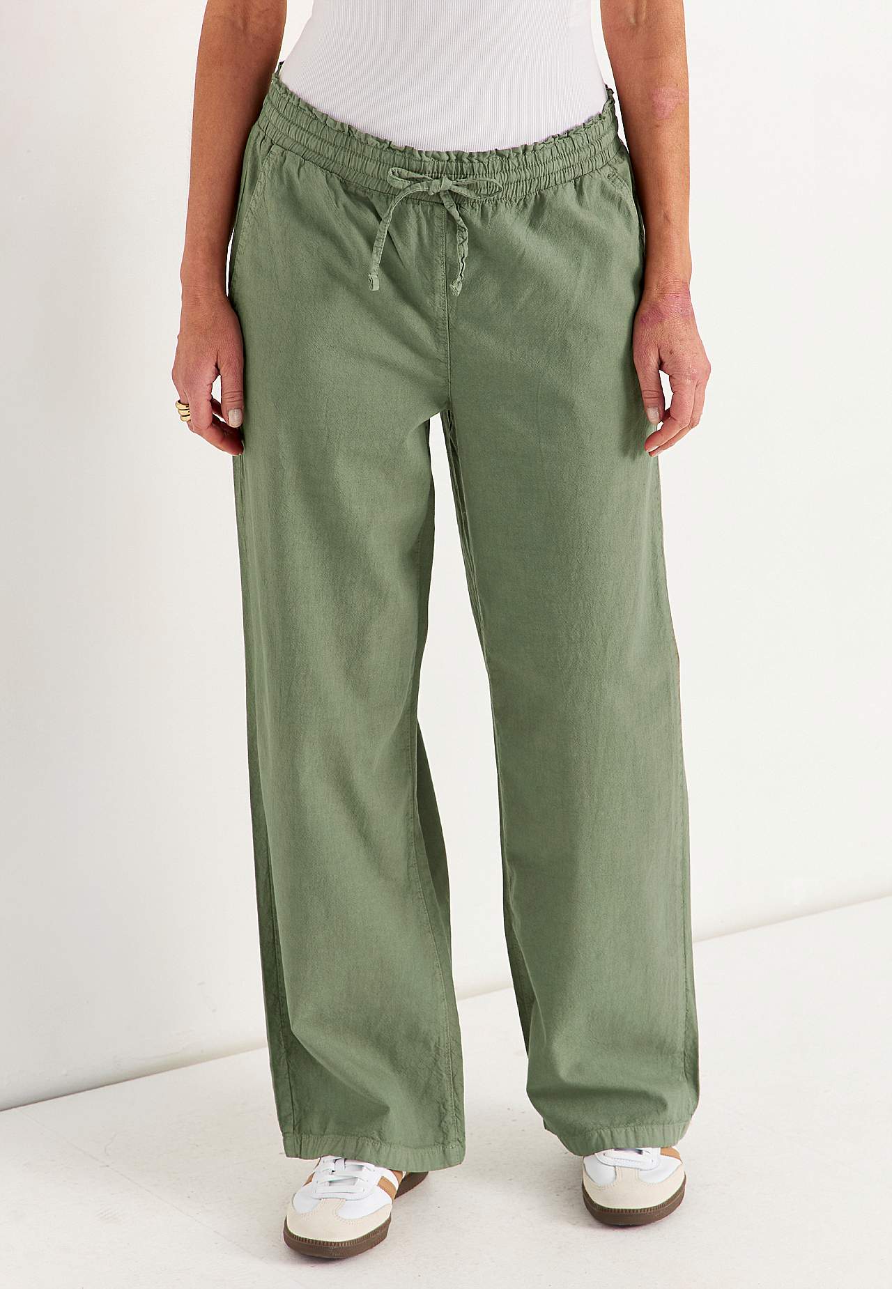 Lange, lässige Hose mit entspanntem Stil. Gewebtes Material aus gewaschener, luftiger, weicher Baumwolle mit natürlichem Gefühl. Lässige, lockere Passform. Angenehmer, elastischer Bund mit Kordelzug. Geneigte Vordertaschen. Falsche Taschen auf der Rückseite. Breite, gerade Beine. Die Innenbeinlänge beträgt ca. 75 cm bei all... Mehr erfahren