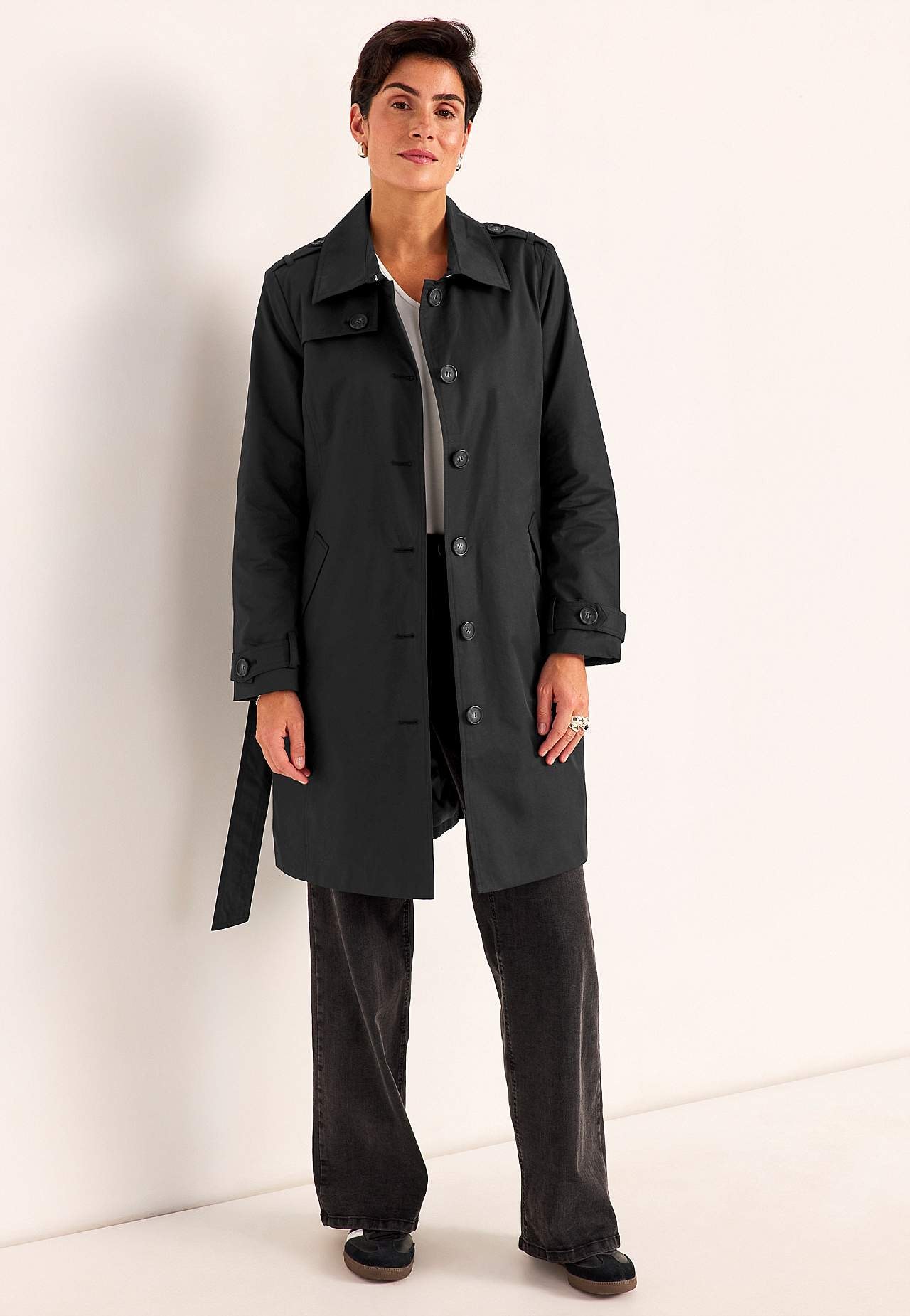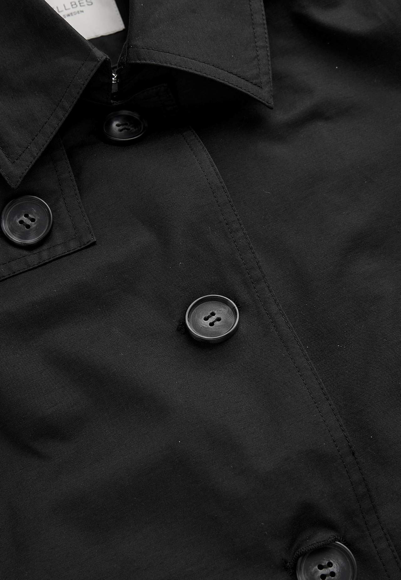 Wasserabweisender, vollständig gefütterter Regenmantel. Kleine Schulterpolster auf der Innenseite. Paspeltaschen an den Seitennähten. Innentasche. Gerade geschnittener Saum mit Schlitz hinten und zwei Knöpfen. Die Länge hängt von der Größe ab und beträgt ca. 97-111 cm (von der Schulter gemessen).