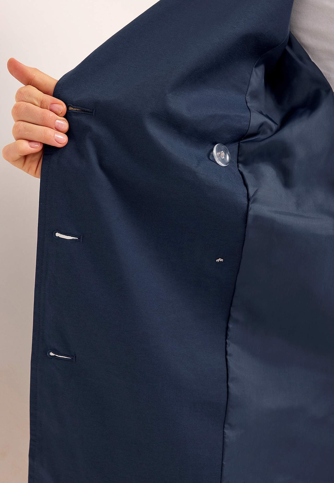 Zweireihig, vollständig gefütterter Regenmantel mit Kragen. Stilvoller Frühlingsmantel, auch schön für den Herbst. Die Länge hinten hängt von der Größe ab und liegt zwischen ca. 73-85 cm.