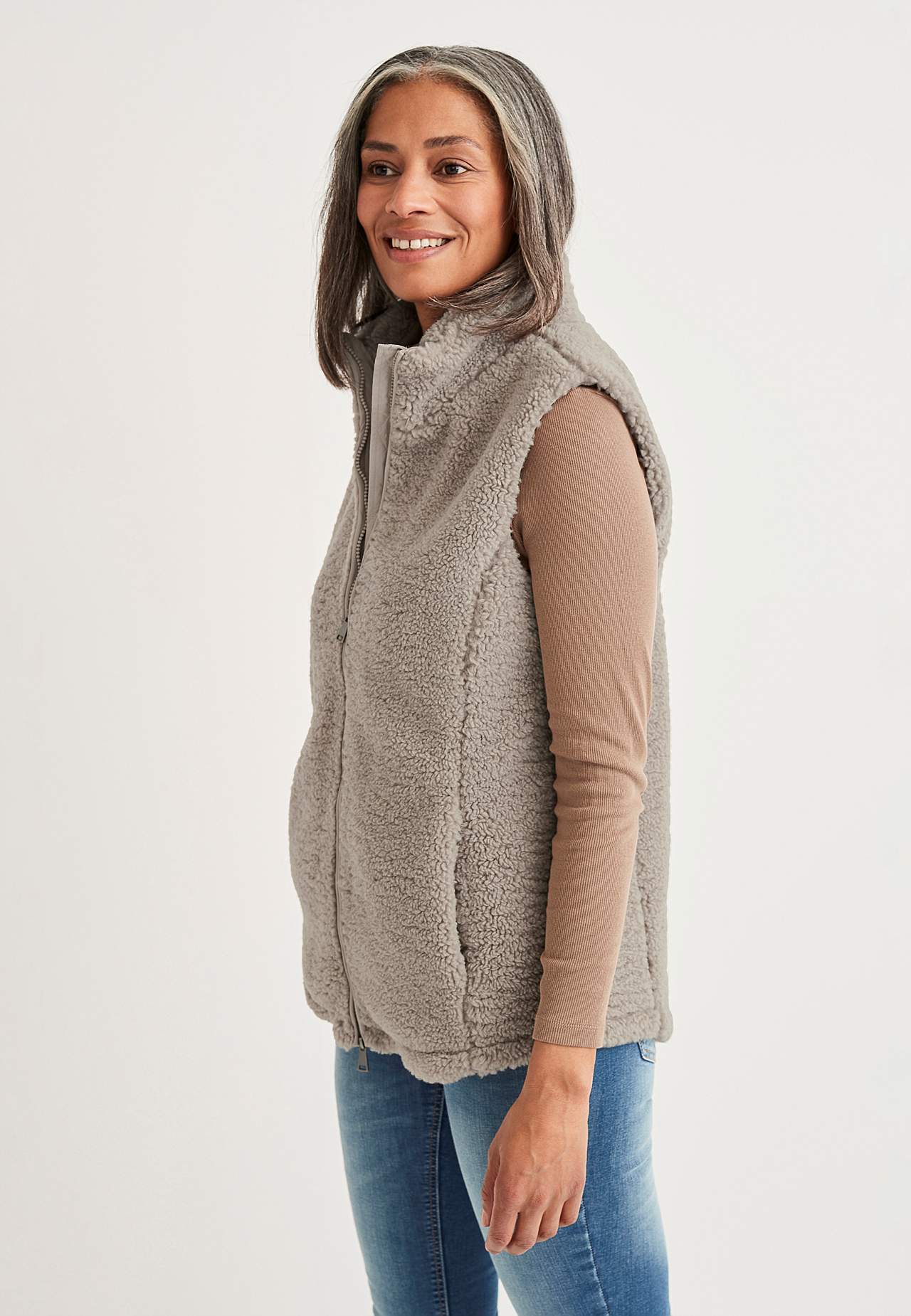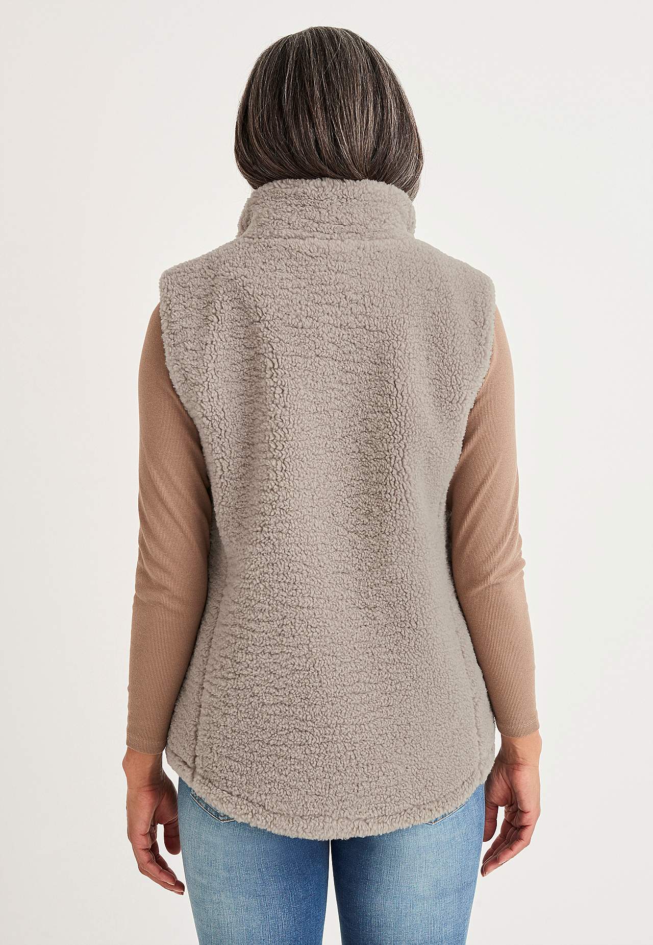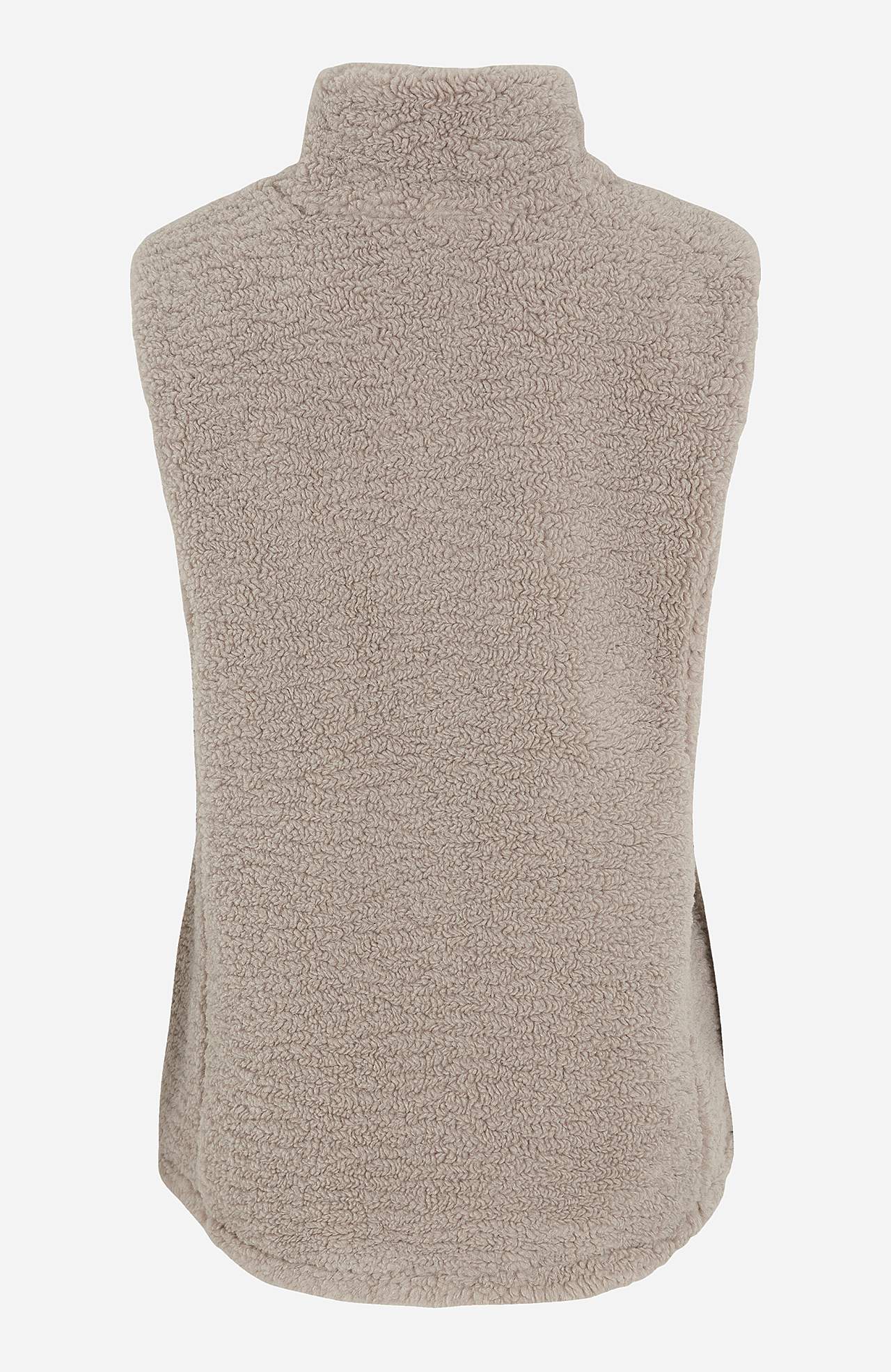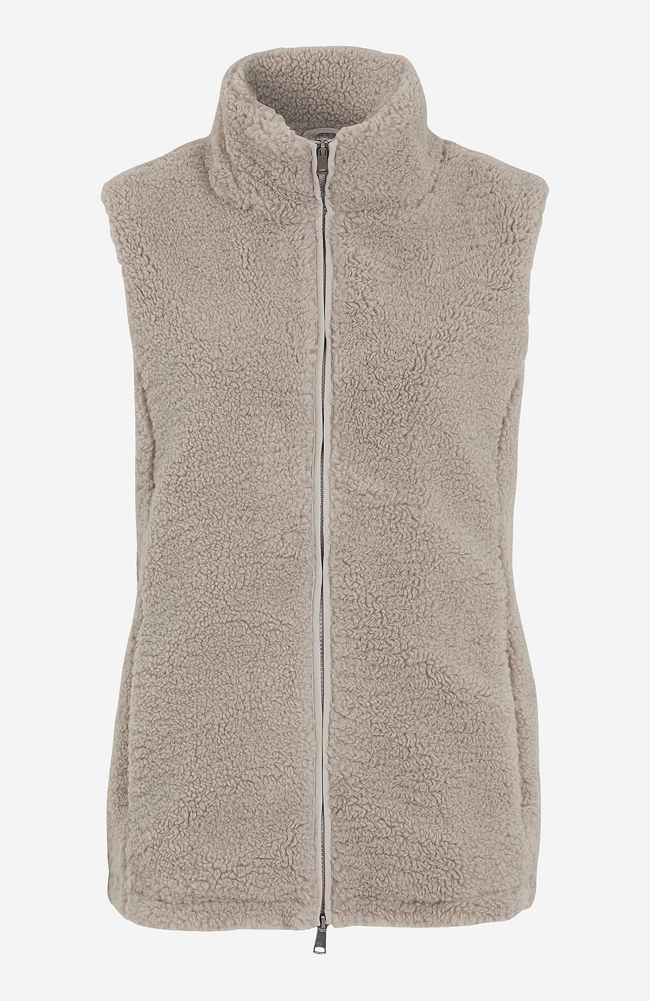 Weste aus weichem Florgewebe mit High-Top Kragen. Zwei-Wege-Reißverschluss mit Taschen vorne. Die Länge hängt von der Größe ab und beträgt ca. 72-80 cm (von der Schulter gemessen).