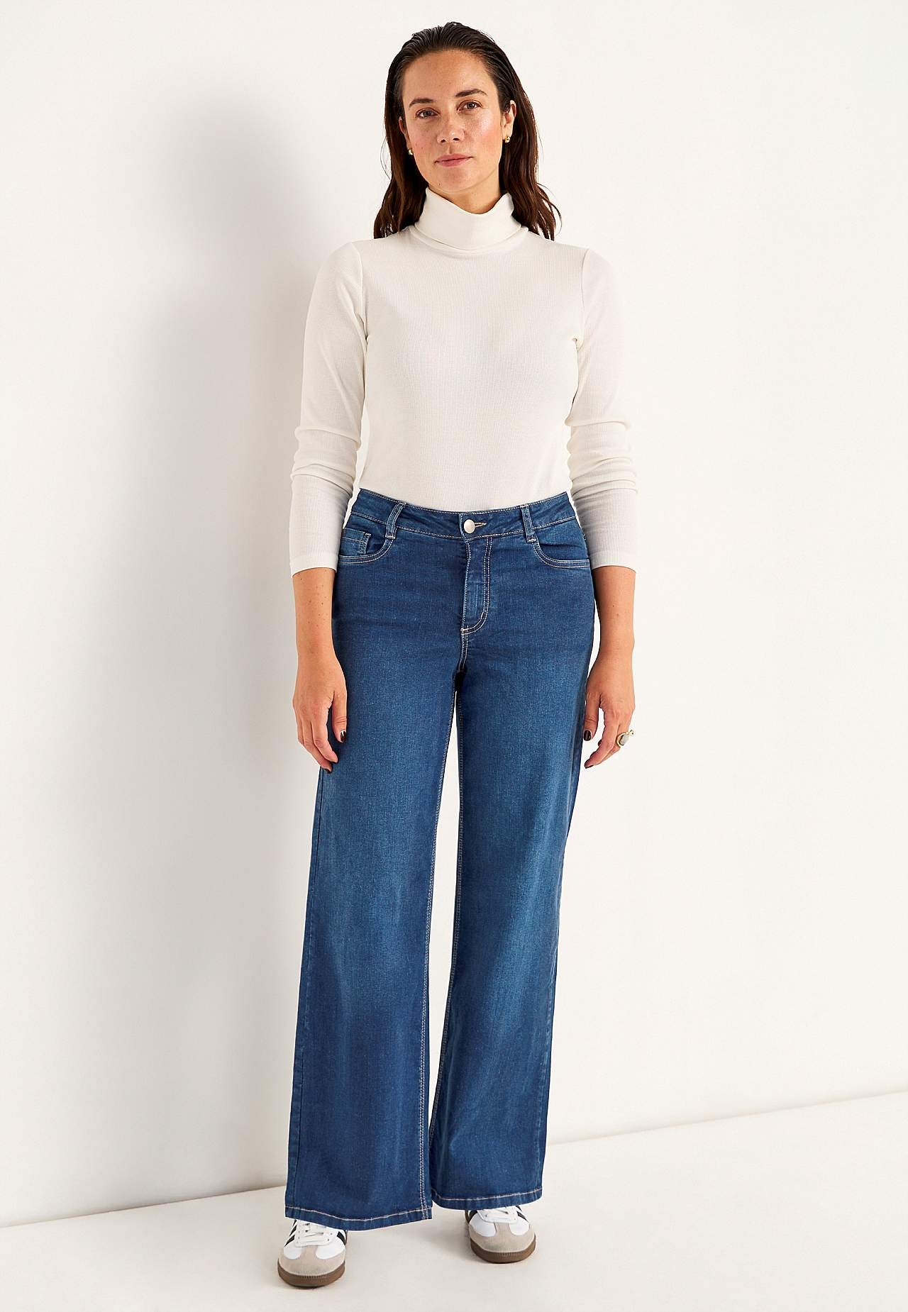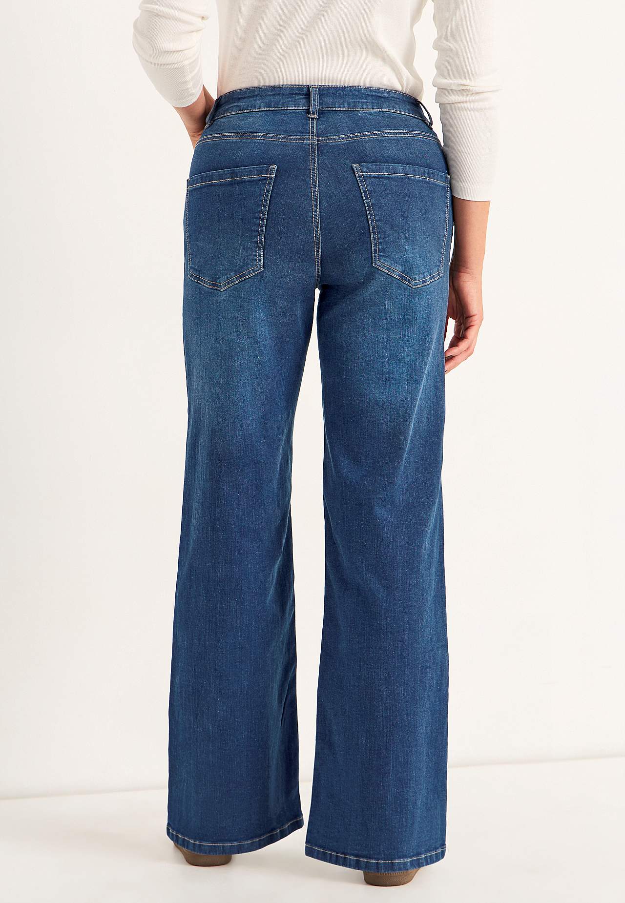 5-Tasche-Jeans. Hoher Bund. Geradliniges Design. Breite Beine. Reißverschluss mit Knopf. Bund mit Gürtelschlaufen. Die Innenbeinlänge beträgt ca. 80 cm bei allen Größen. Vordere Bundhöhe variiert je nach Größe: ca. 24-35 cm. Auch erhältlich in Innenbeinlänge 85 cm, siehe Art.-Nr. 700142.