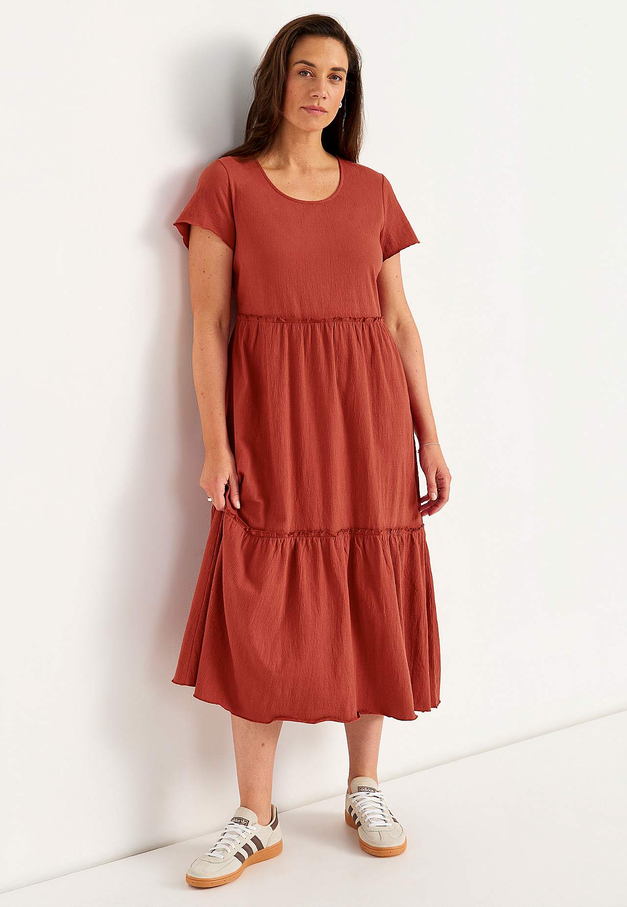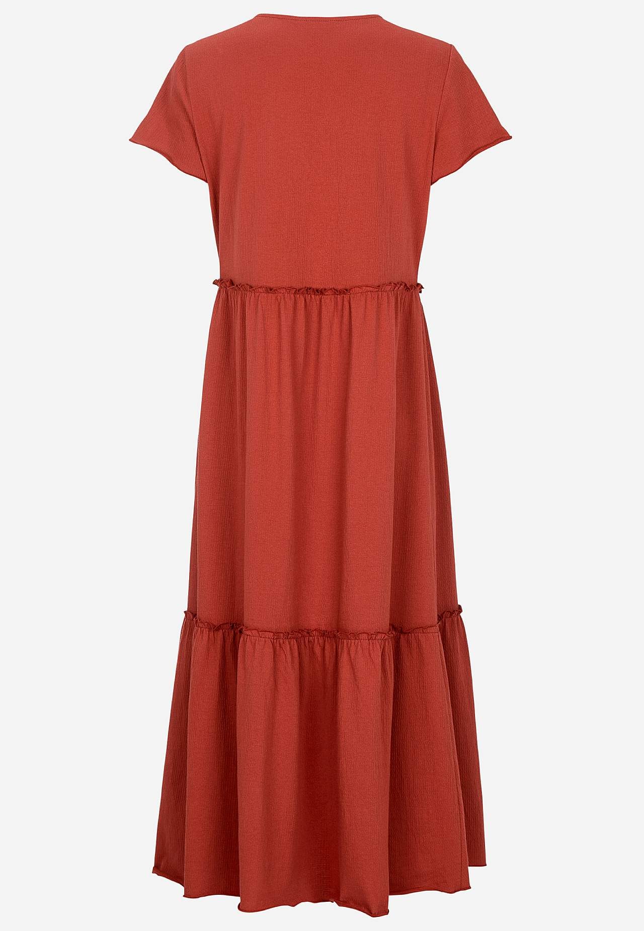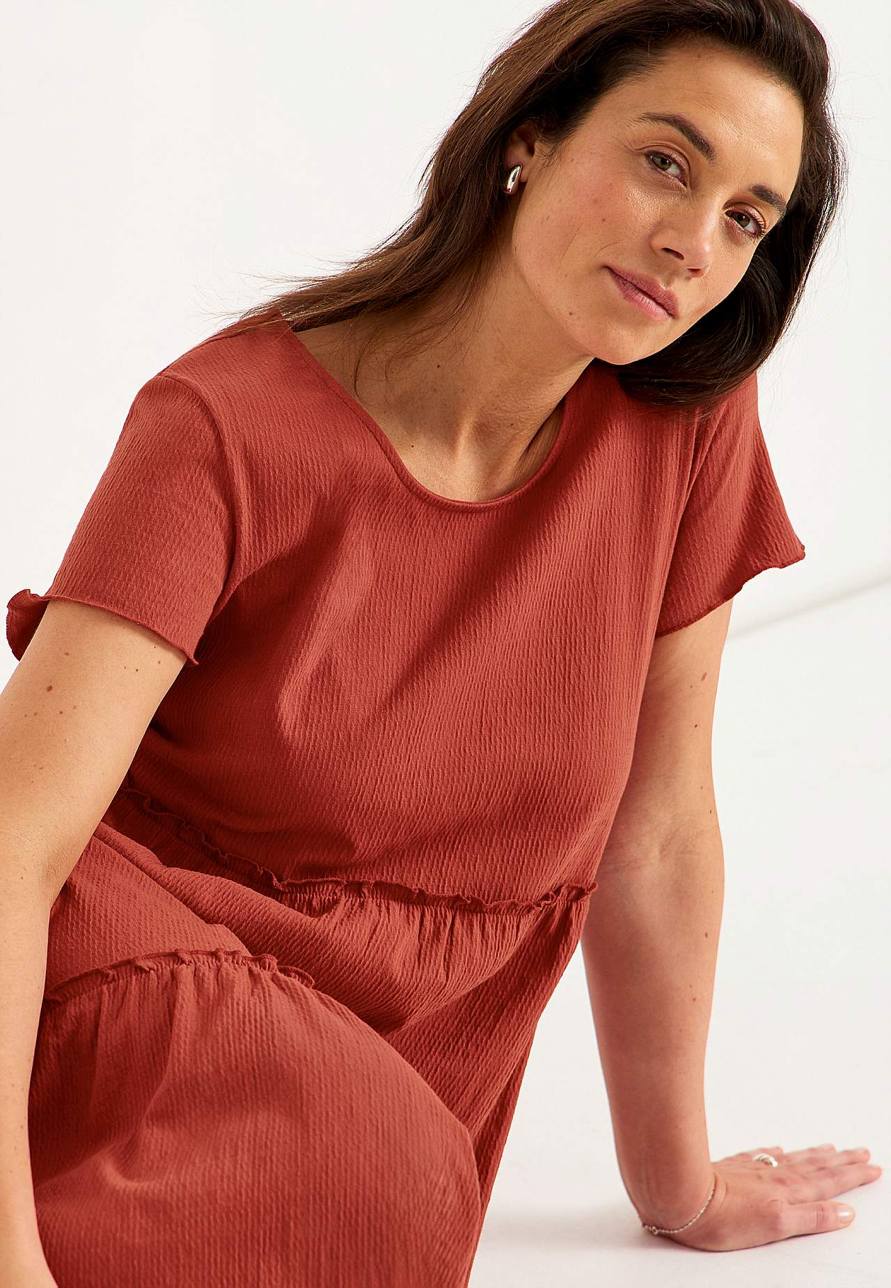 Elastisches, weiches Kleid mit Rüschen mit welliger Struktur. Lässige Passform in A-Form. Unterteil mit süßer Breite. Übertakteter, welliger, dünner Saum am unteren Teil, am Rand der Rüsche und an den Manschetten. Runder Ausschnitt. Kurze Flügelärmel. Sanft abgerundeter Saum. Die Länge des Rückenteils beträgt ca. 128 cm bei... Mehr erfahren