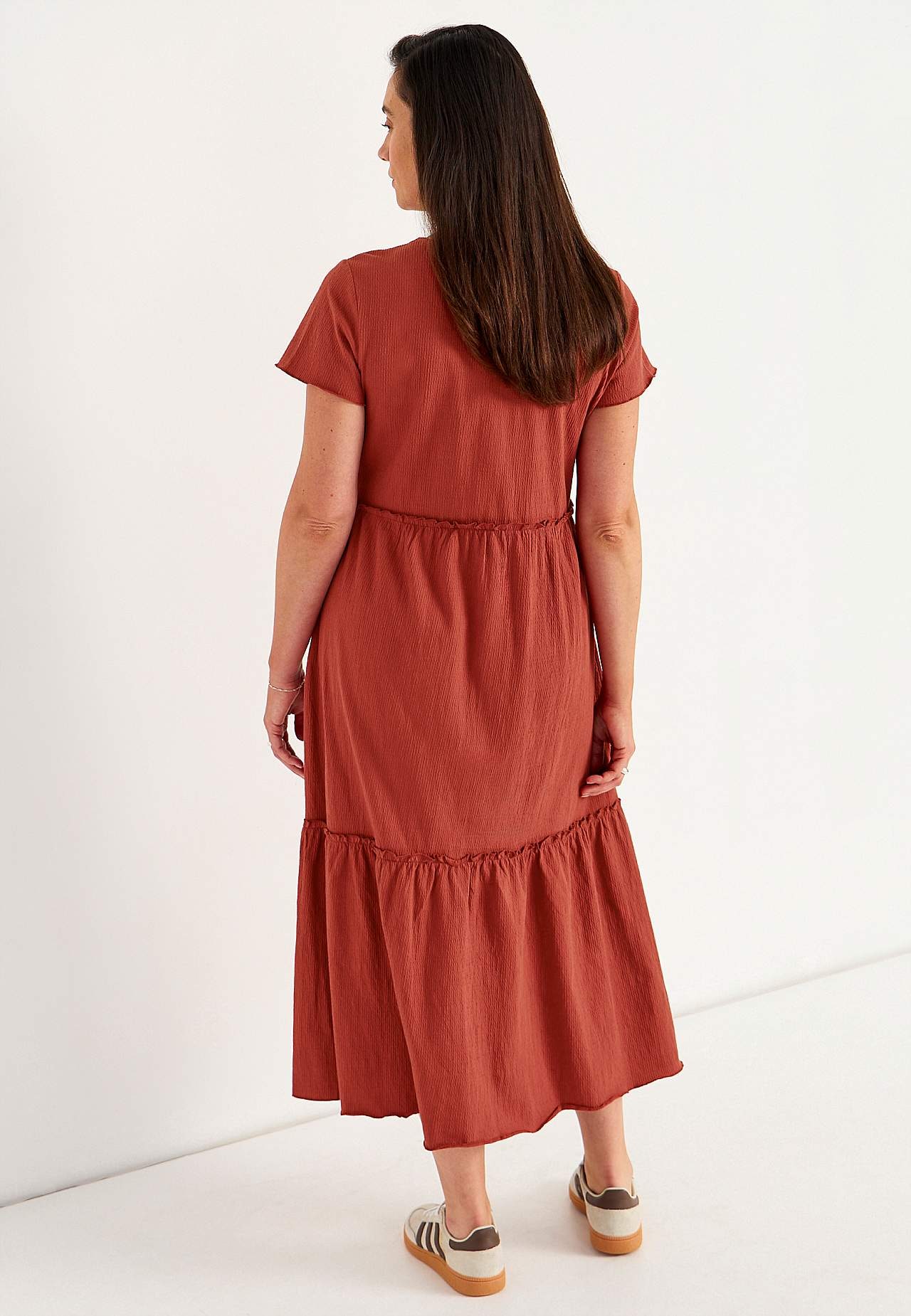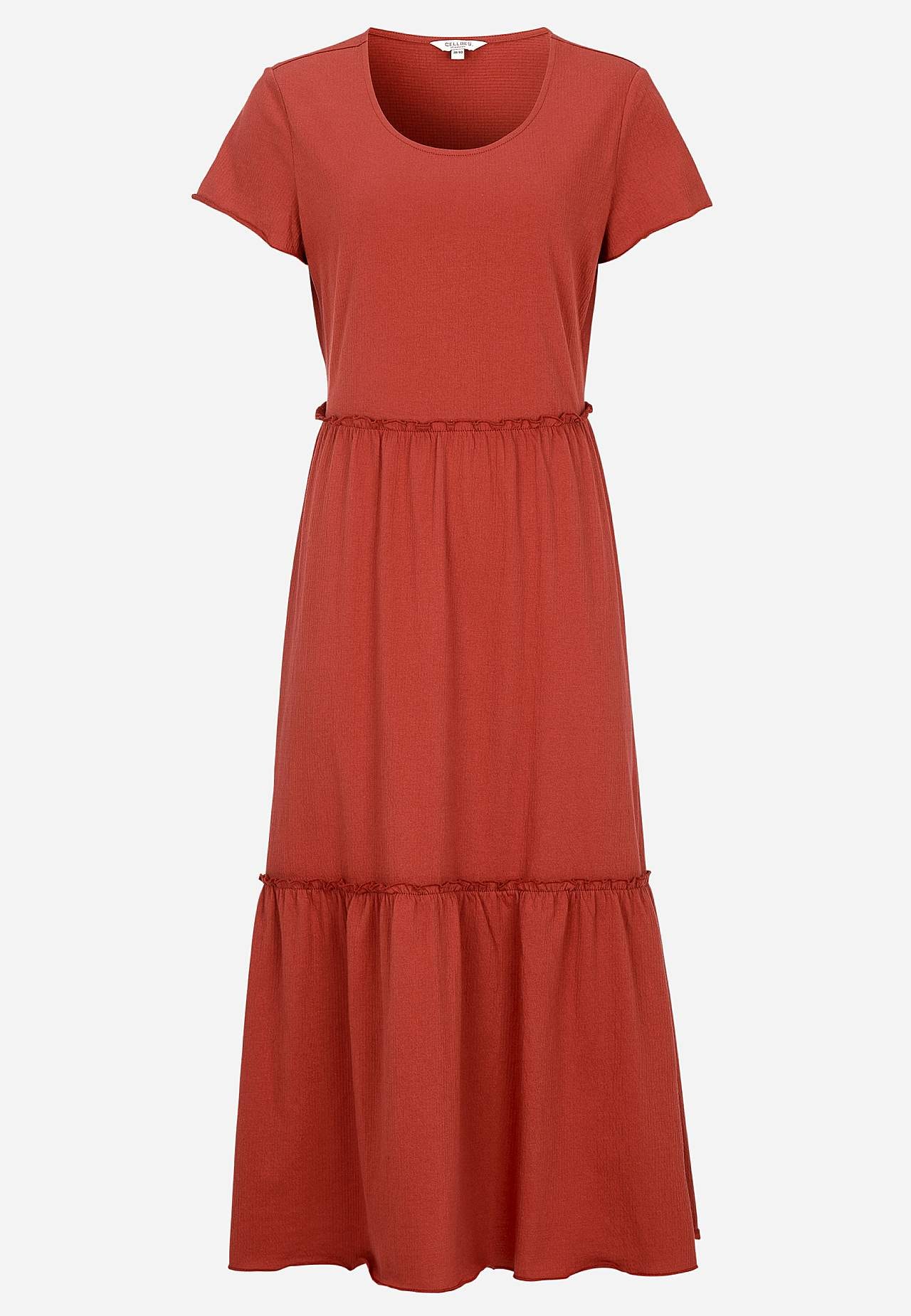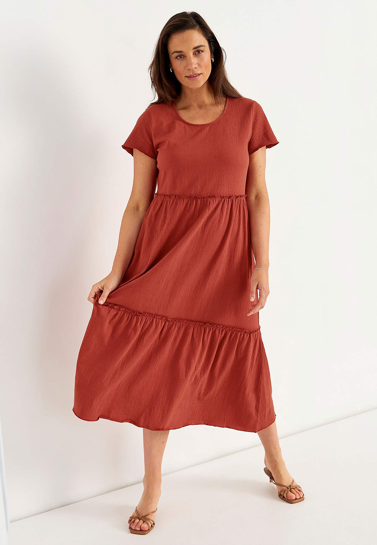 Elastisches, weiches Kleid mit Rüschen mit welliger Struktur. Lässige Passform in A-Form. Unterteil mit süßer Breite. Übertakteter, welliger, dünner Saum am unteren Teil, am Rand der Rüsche und an den Manschetten. Runder Ausschnitt. Kurze Flügelärmel. Sanft abgerundeter Saum. Die Länge des Rückenteils beträgt ca. 128 cm bei... Mehr erfahren