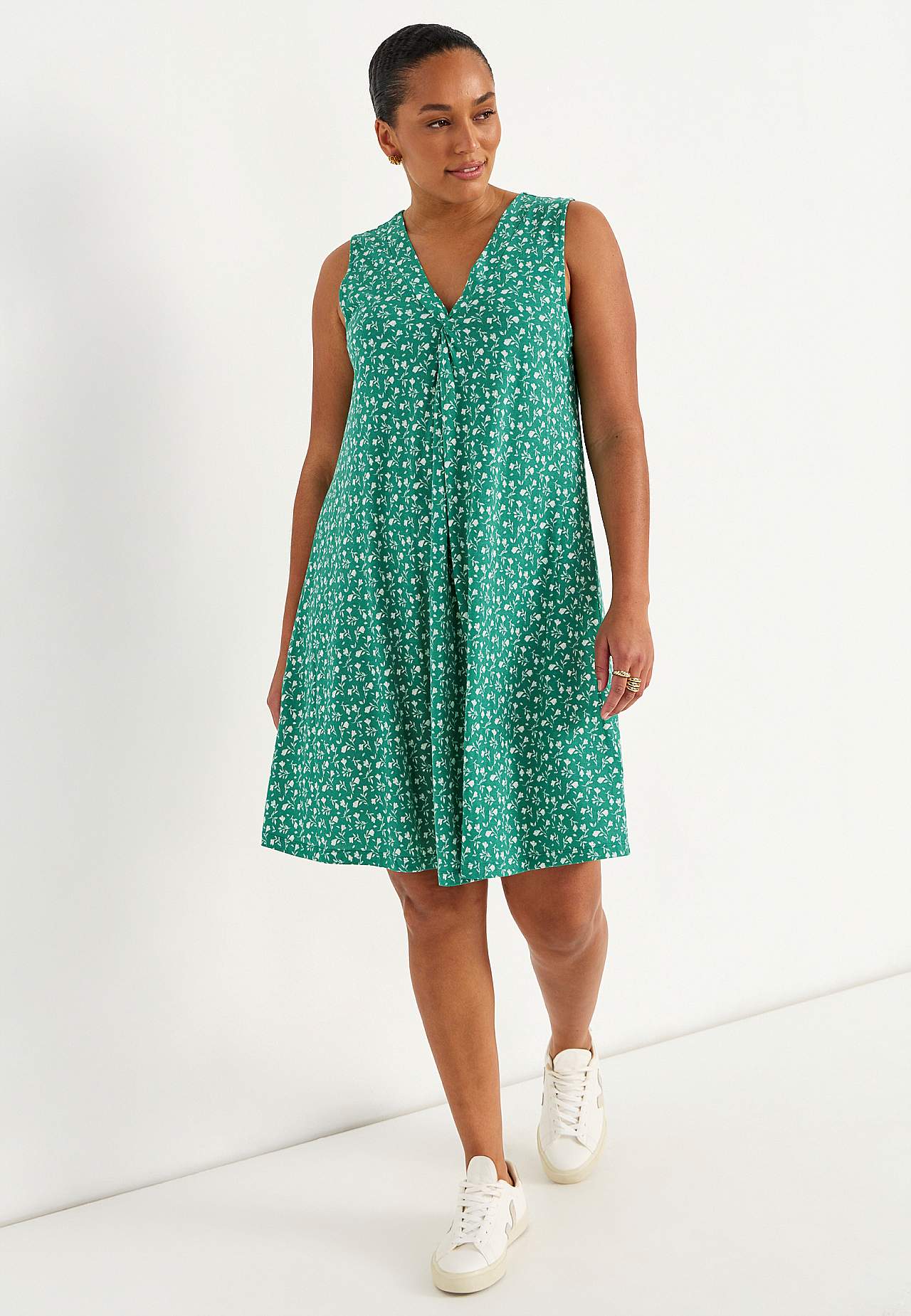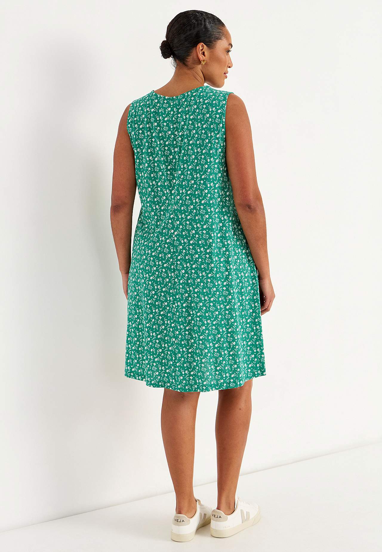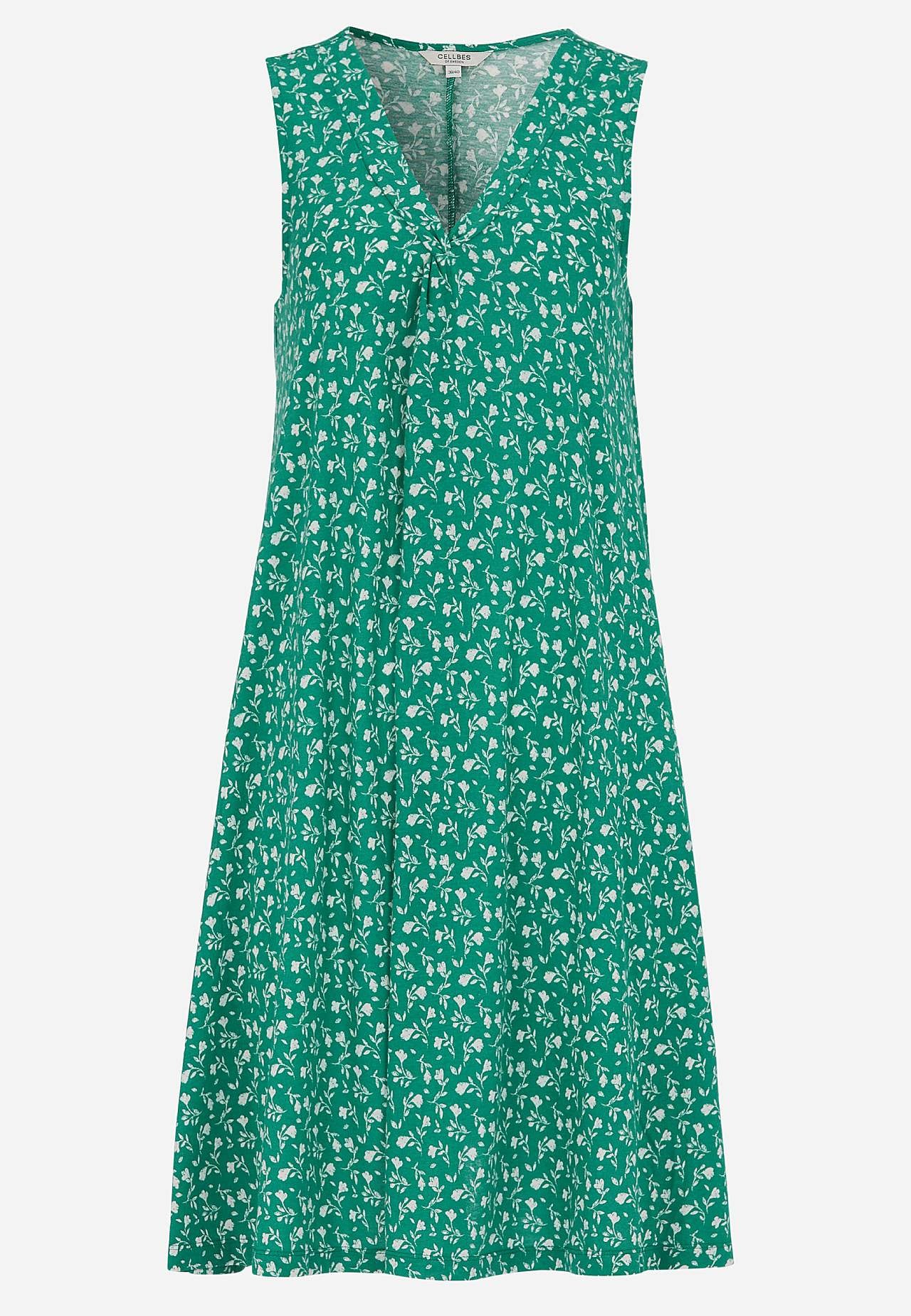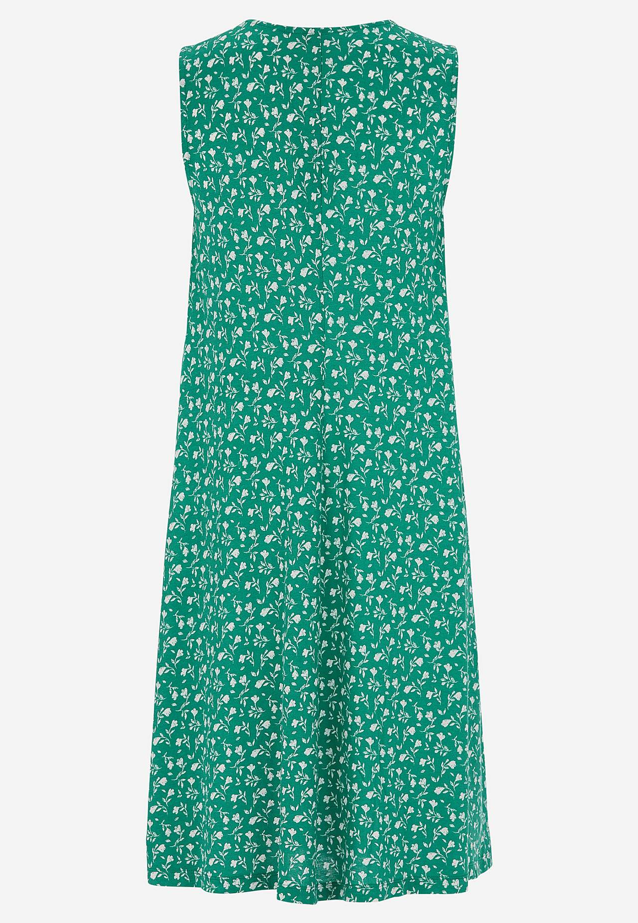 Ärmelloses Jerseykleid. Luftiges Modell aus wunderschön weicher Baumwolle-Viskose-Mischung. Geräumige, leicht a-linienförmige Passform. Die Länge hängt von der Größe ab und beträgt ca. 95-106 cm (von der Schulter nach hinten gemessen).