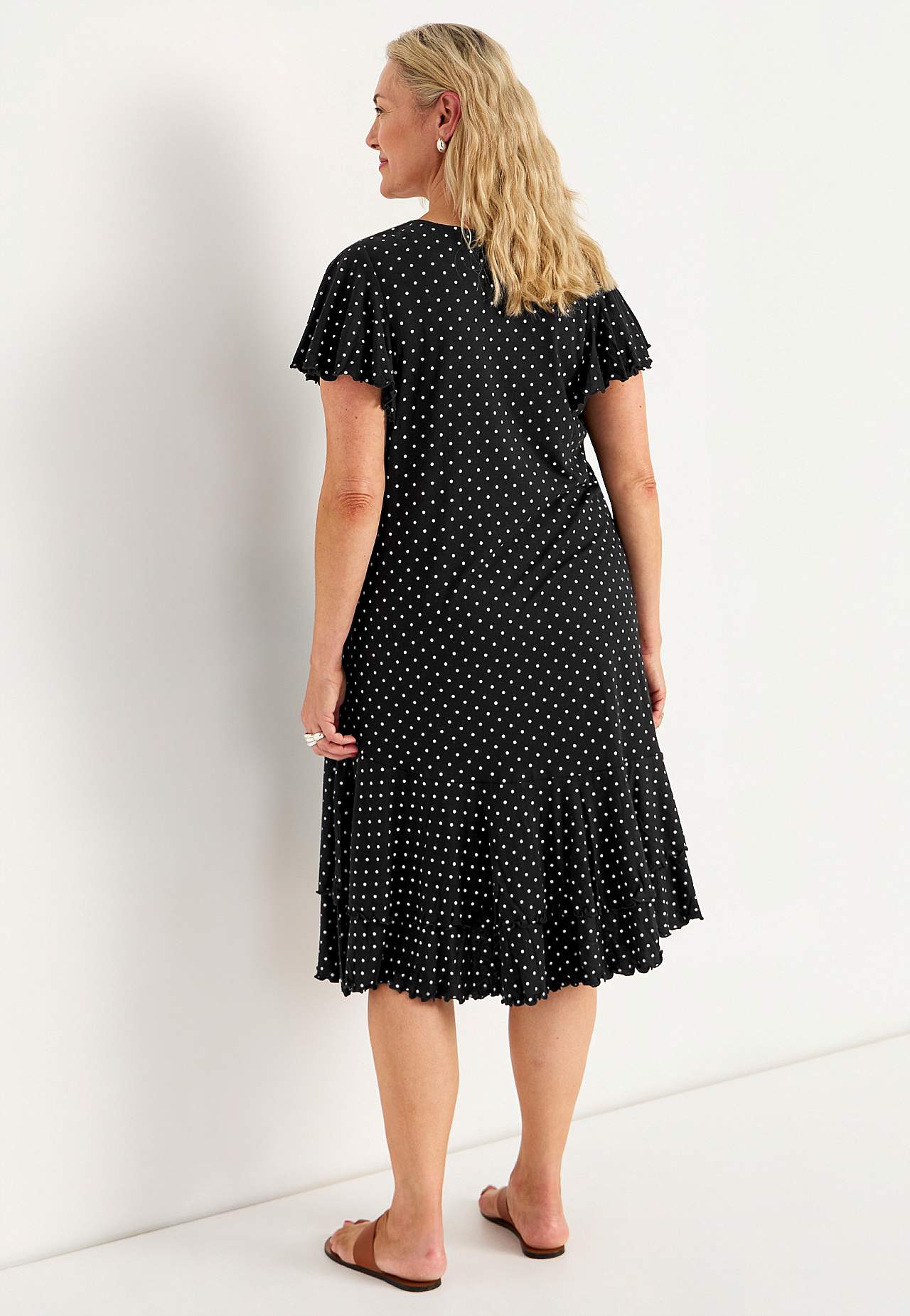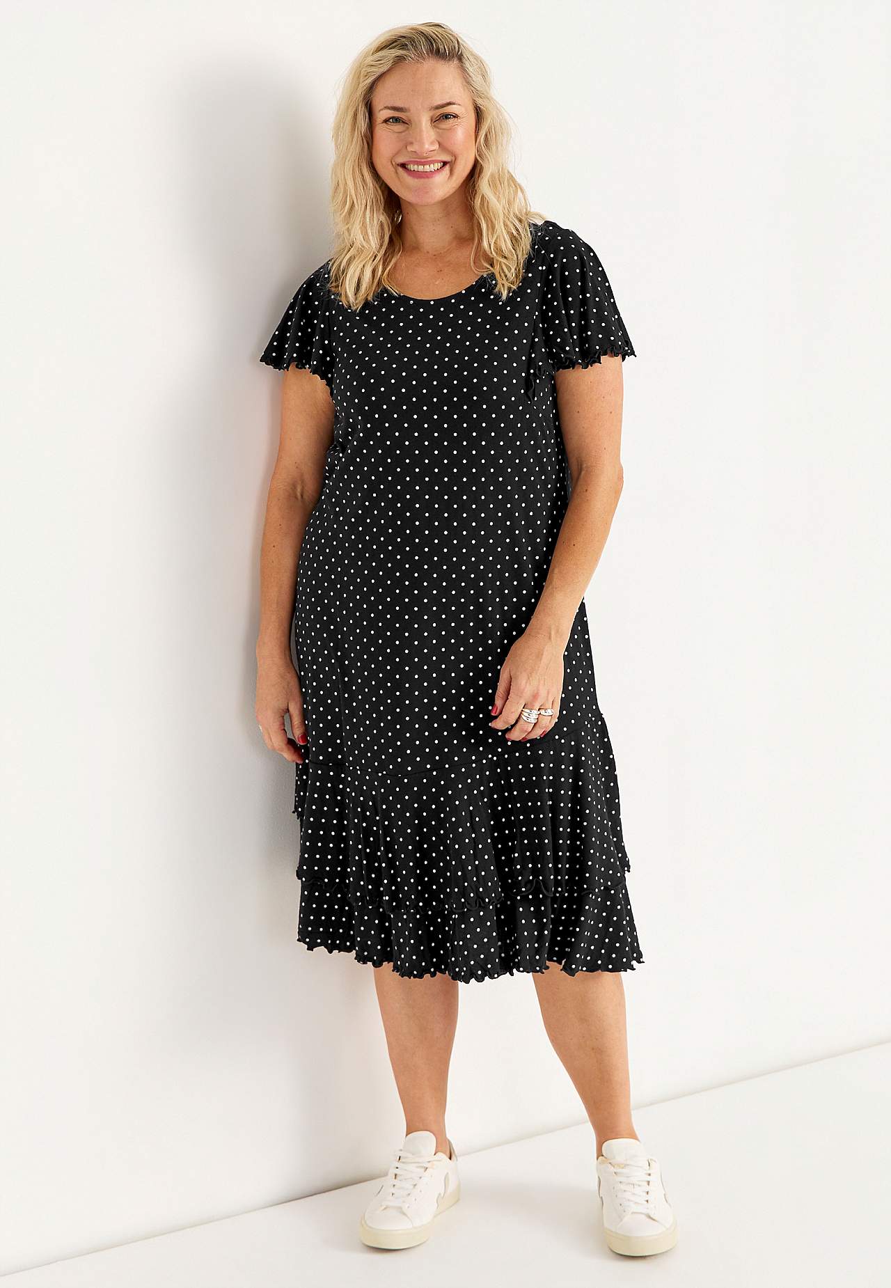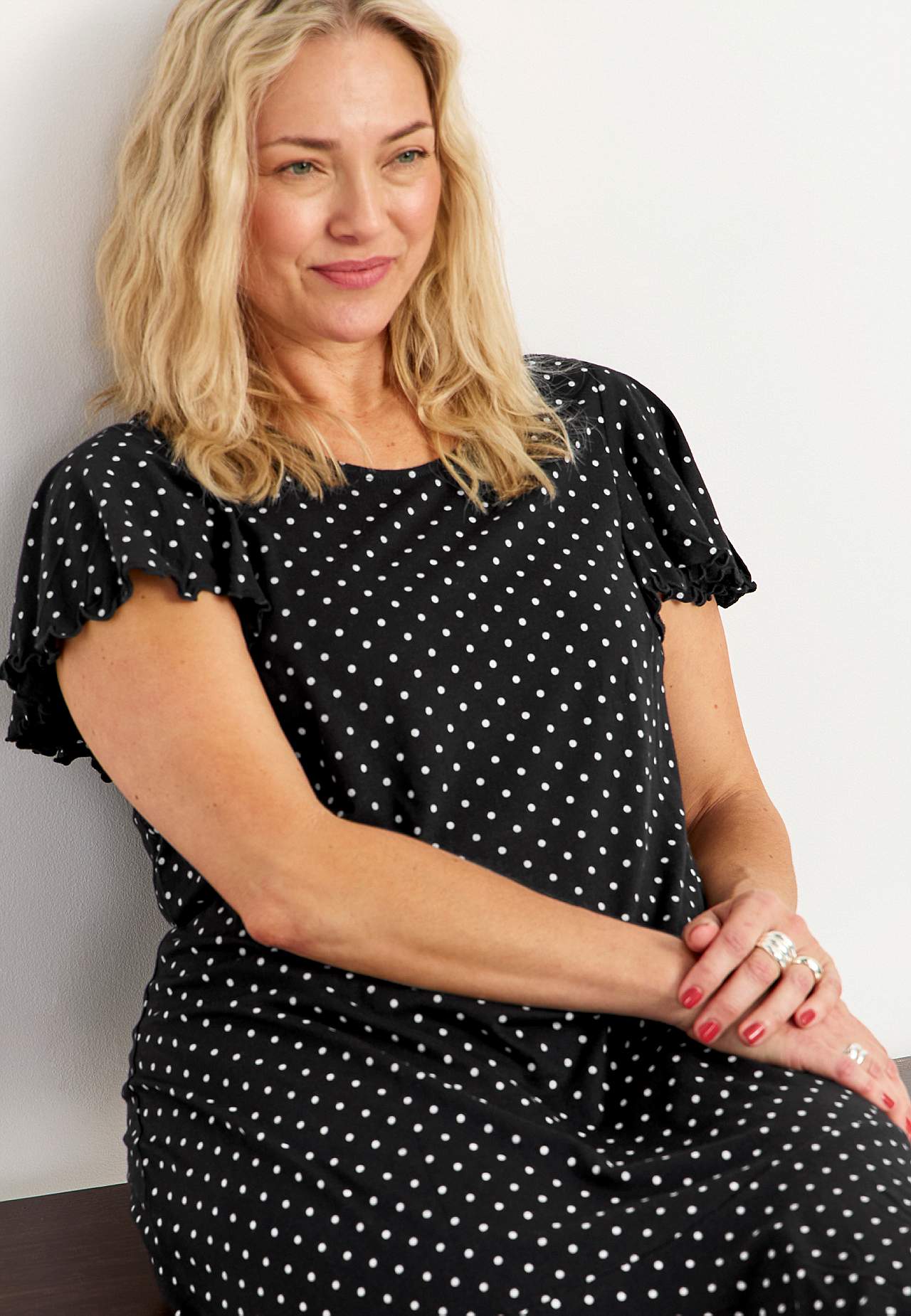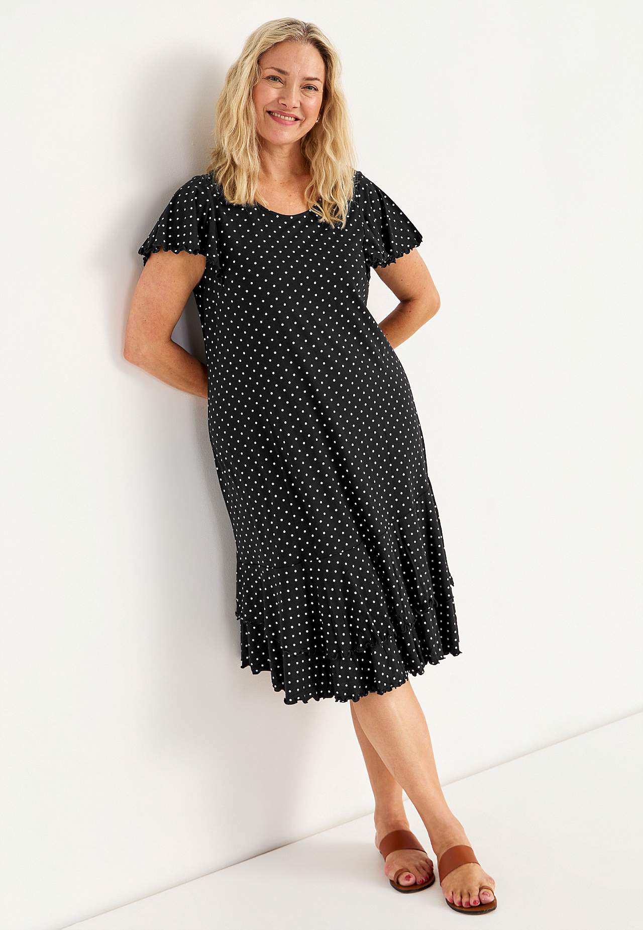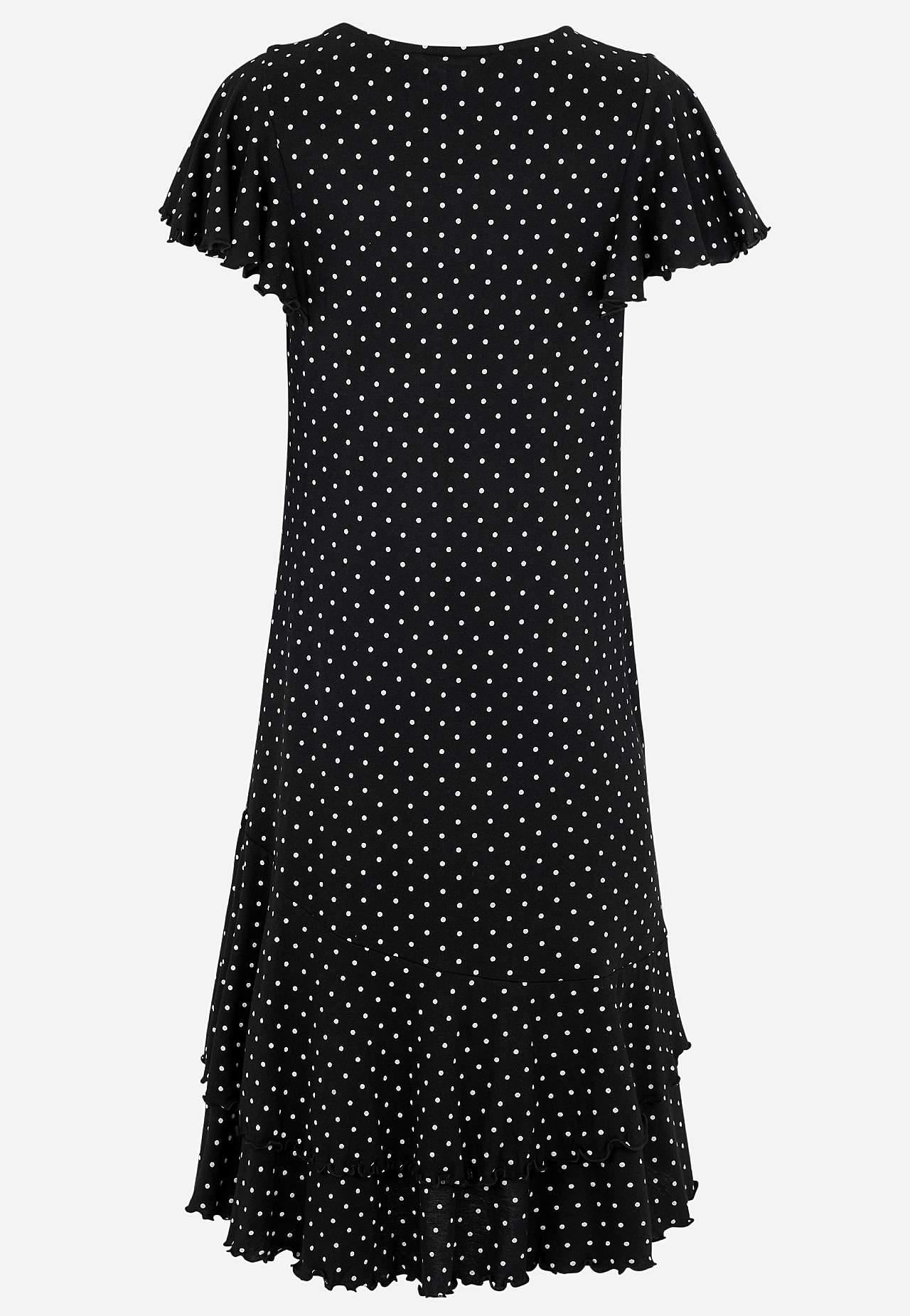 Kleid mit asymmetrischem Saum und doppelten Rüschenröcken am unteren Teil. Weicher Jersey aus Baumwolle-Viskose-Mischung. Taillierte Passform mit breiterem Unterteil. Runder Ausschnitt. Kurze Schmetterlingsärmel mit übertakteter, dekorativer, schwankender Kante. Brustabnäher. Rüschenröcke am unteren Teil mit übertakteter, s... Mehr erfahren