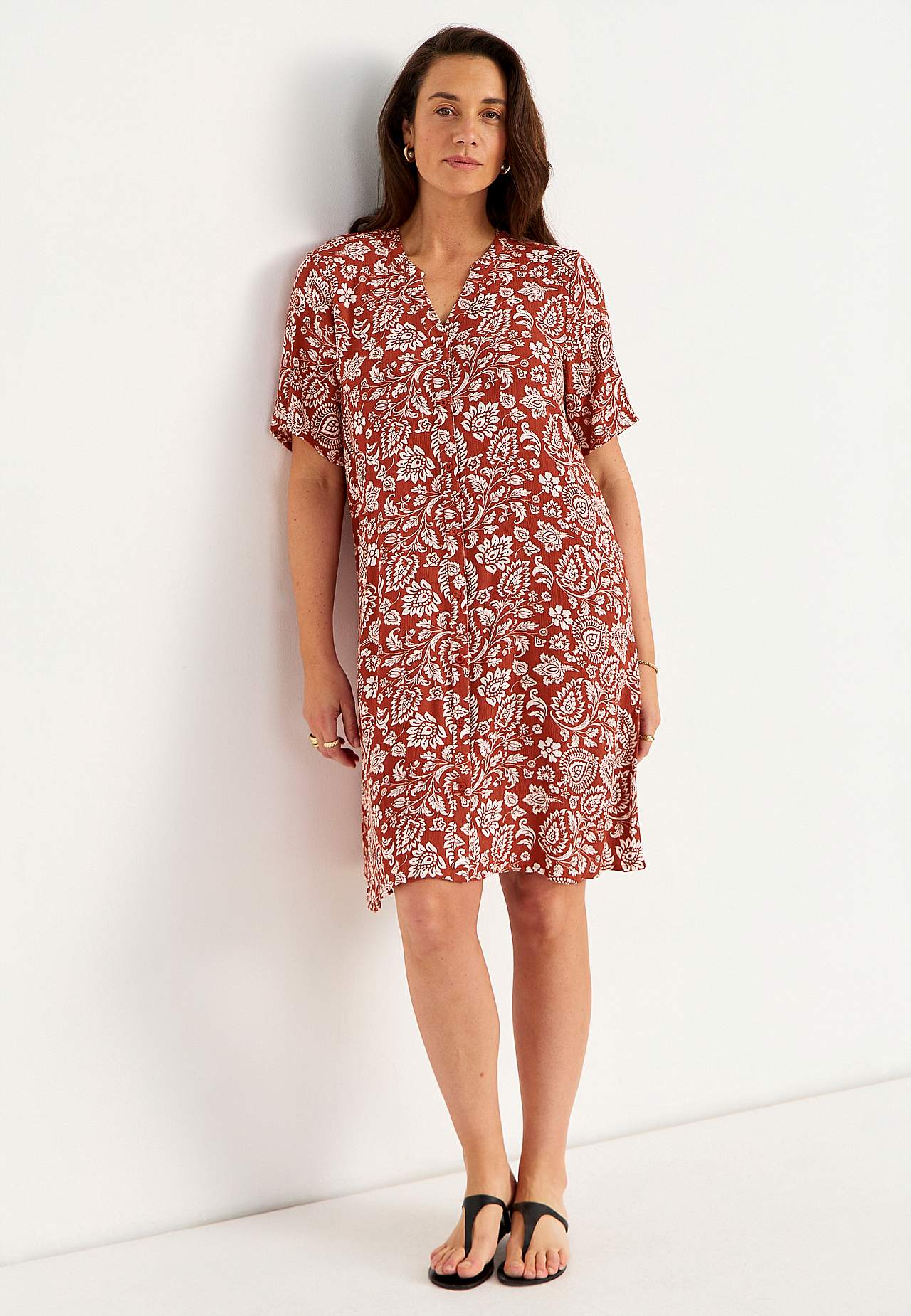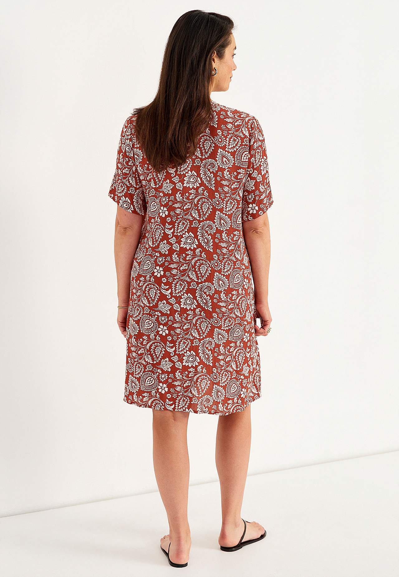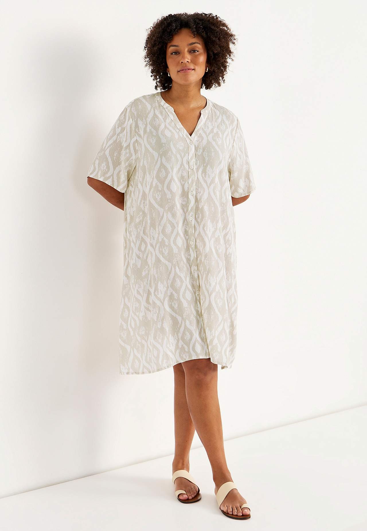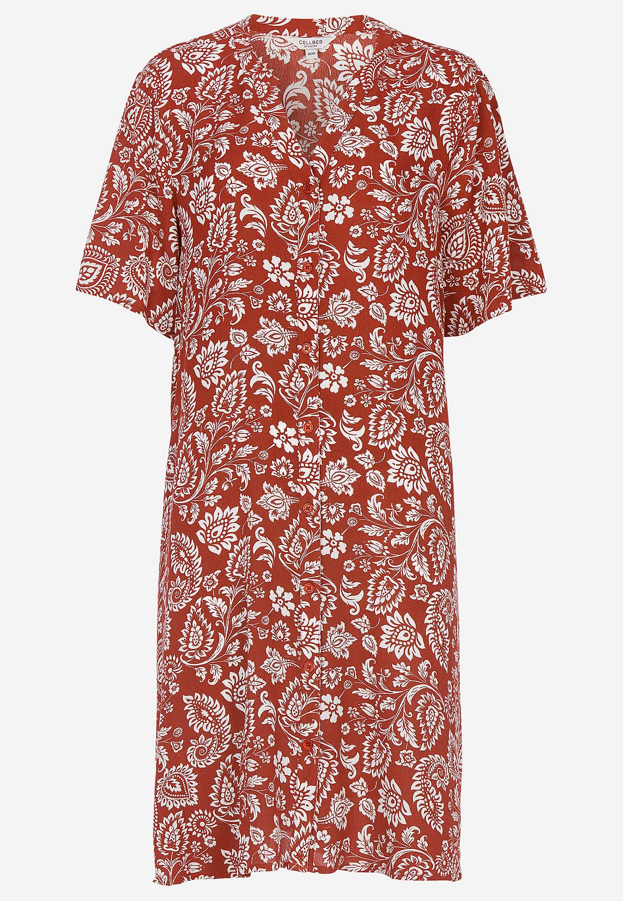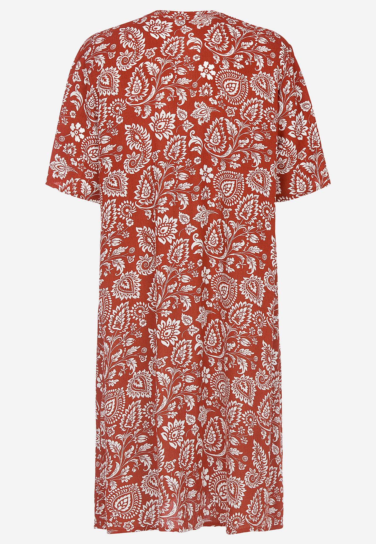 Luftiges, kühlendes Material mit matter Oberfläche und netter Struktur. Etwas geräumige Passform in A-Form. Knopfverschluss vorne. Kurze Ärmel. Die Länge hinten hängt von der Größe ab und liegt zwischen ca. 97-105 cm.