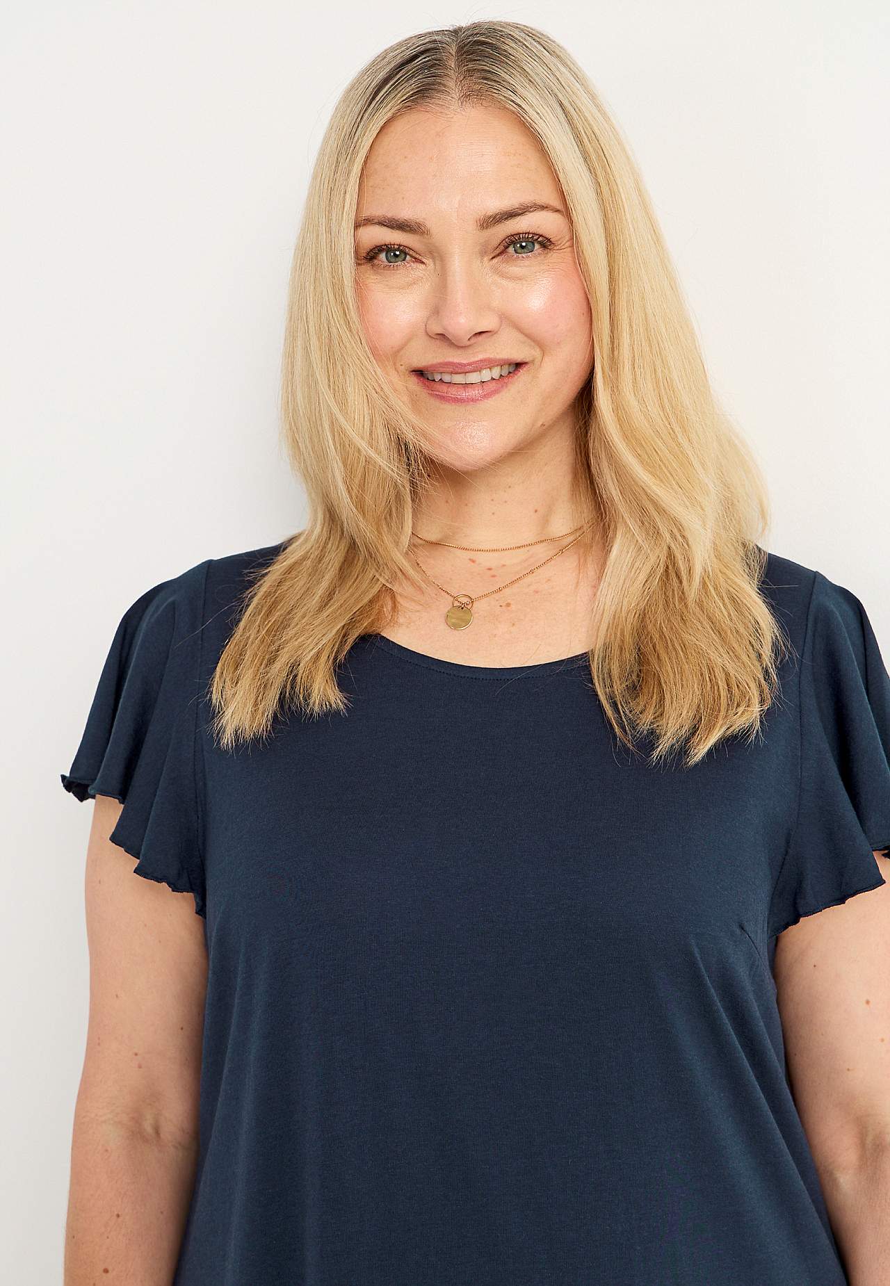 Taillierte Passform mit breitem Unterteil. Design mit asymmetrischem Saum und doppelten Rüschenröcken am unteren Teil. Anschmiegsamer, weicher Jersey. Runder Ausschnitt. Brustabnäher. Kurze Schmetterlingsärmel.