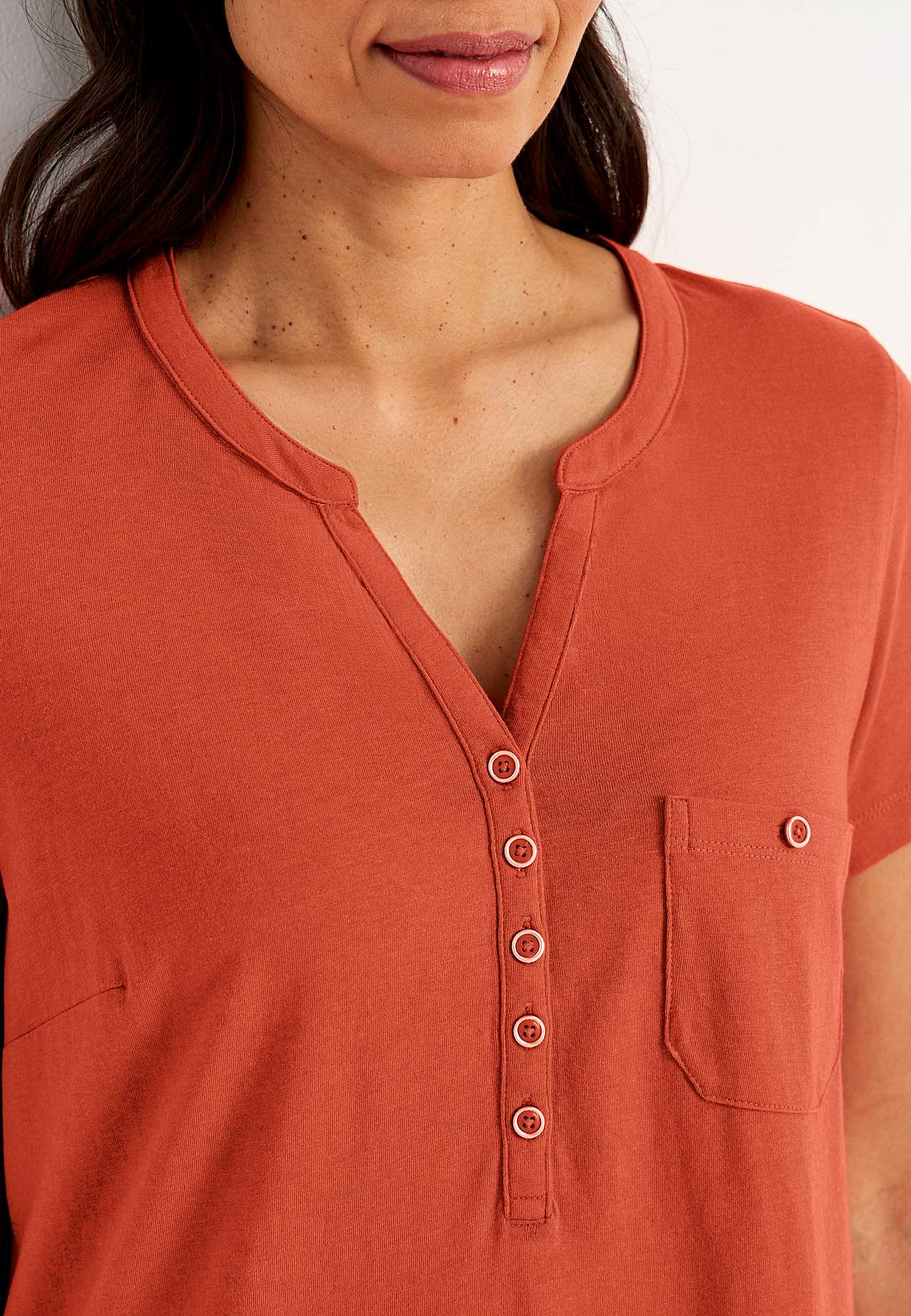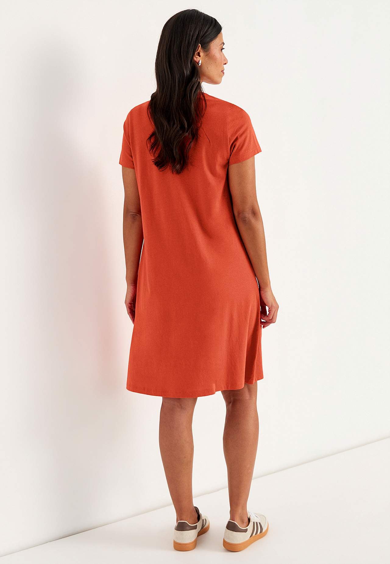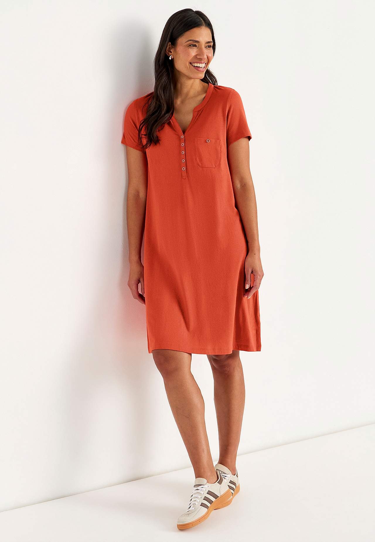 Kleid in A-Form mit kurzen Ärmeln. Jersey aus wunderschön weicher Bio-Baumwolle und modal. Runder Ausschnitt mit V-Schnitt und Knopfleiste. Kleine Brusttasche mit Knopf. Abnäher an der Büste. Sanft abgerundeter Saum. Die Länge hängt von der Größe ab und beträgt ca. 97-114 cm (von der Schulter gemessen).