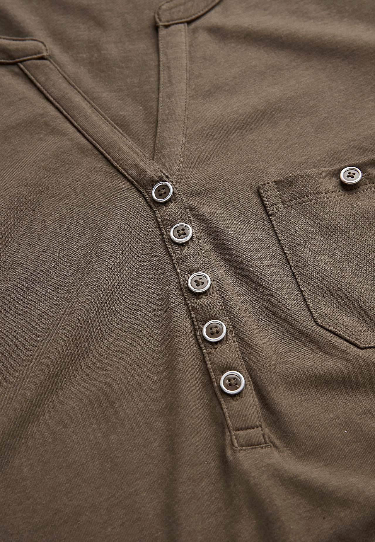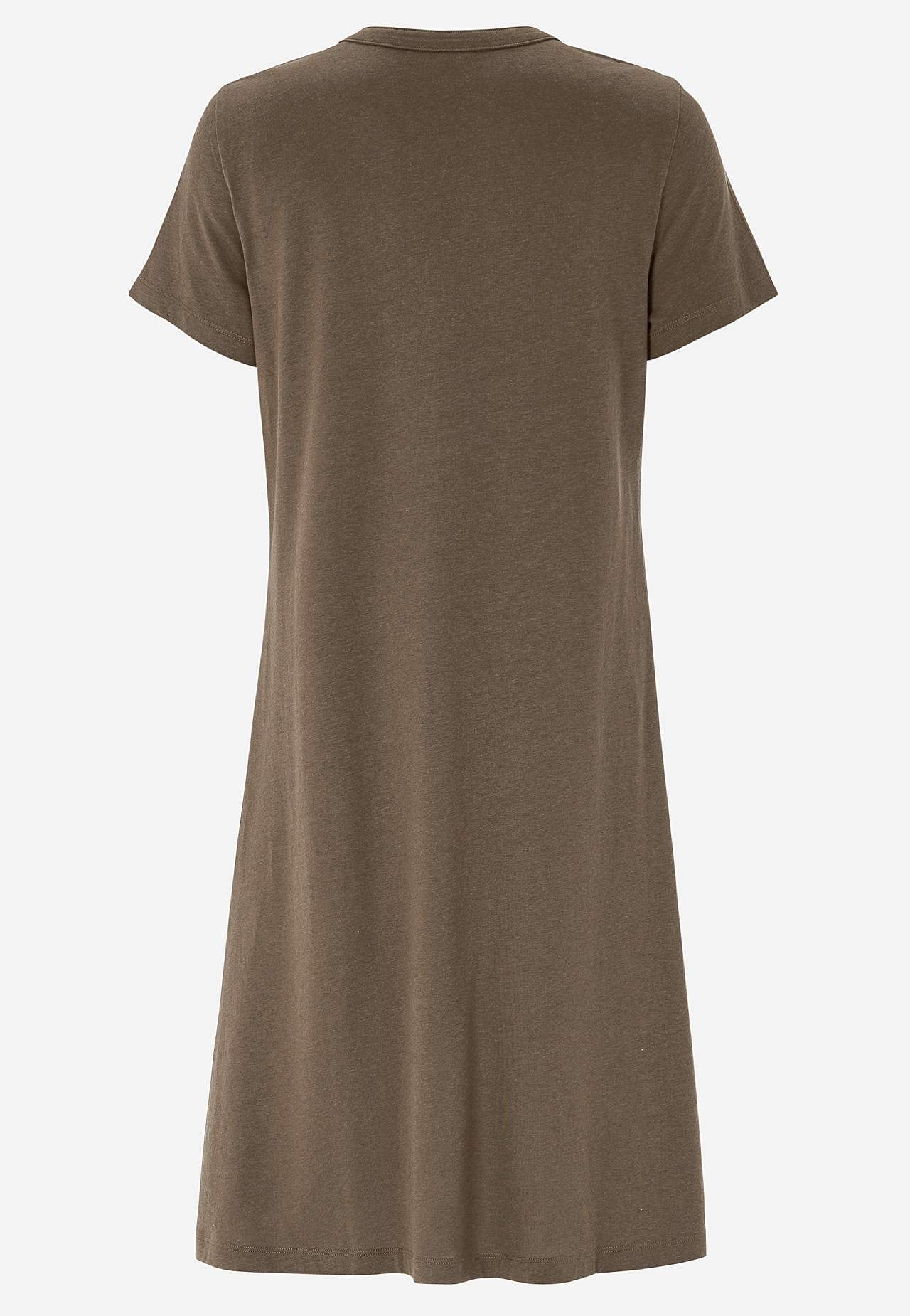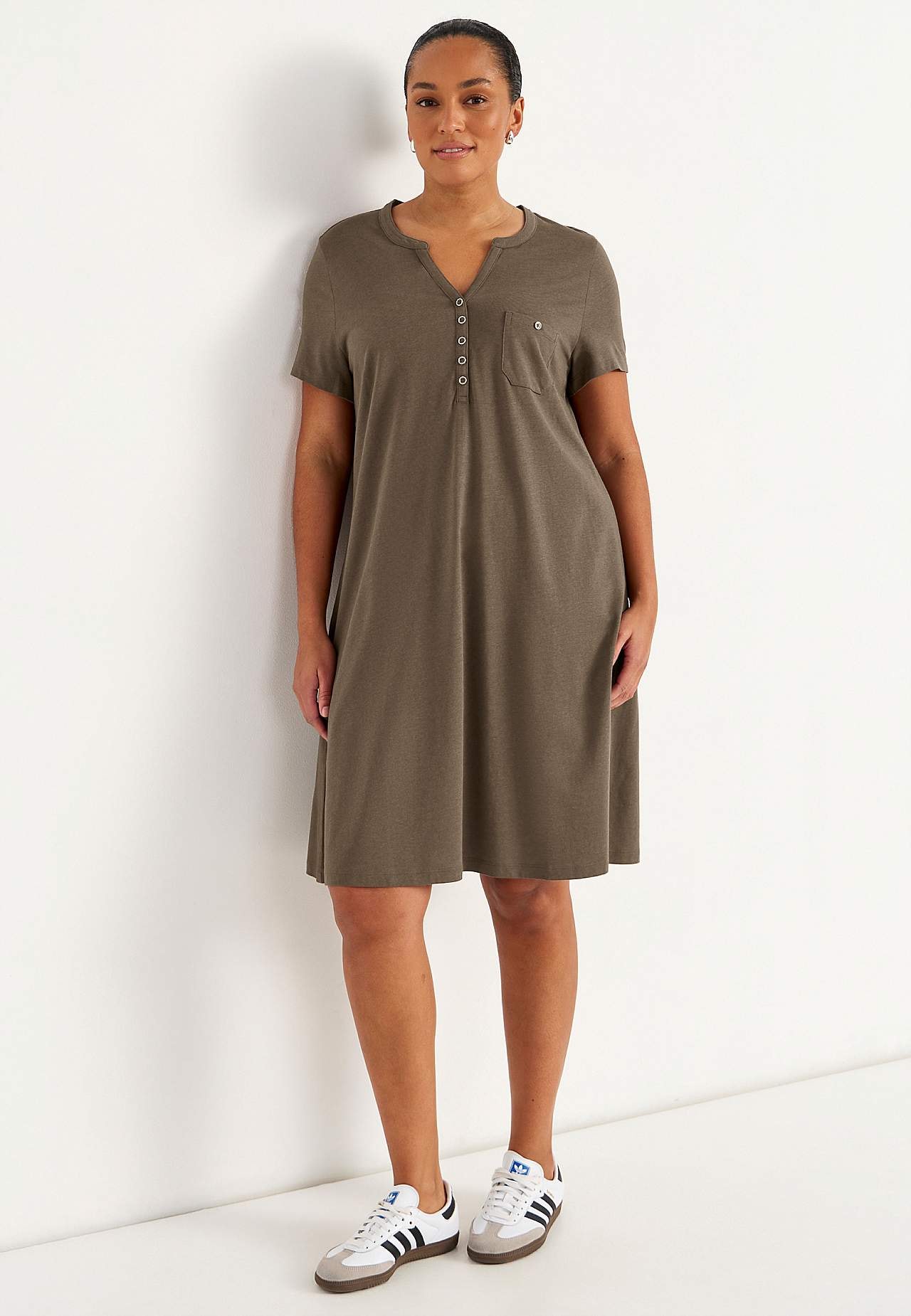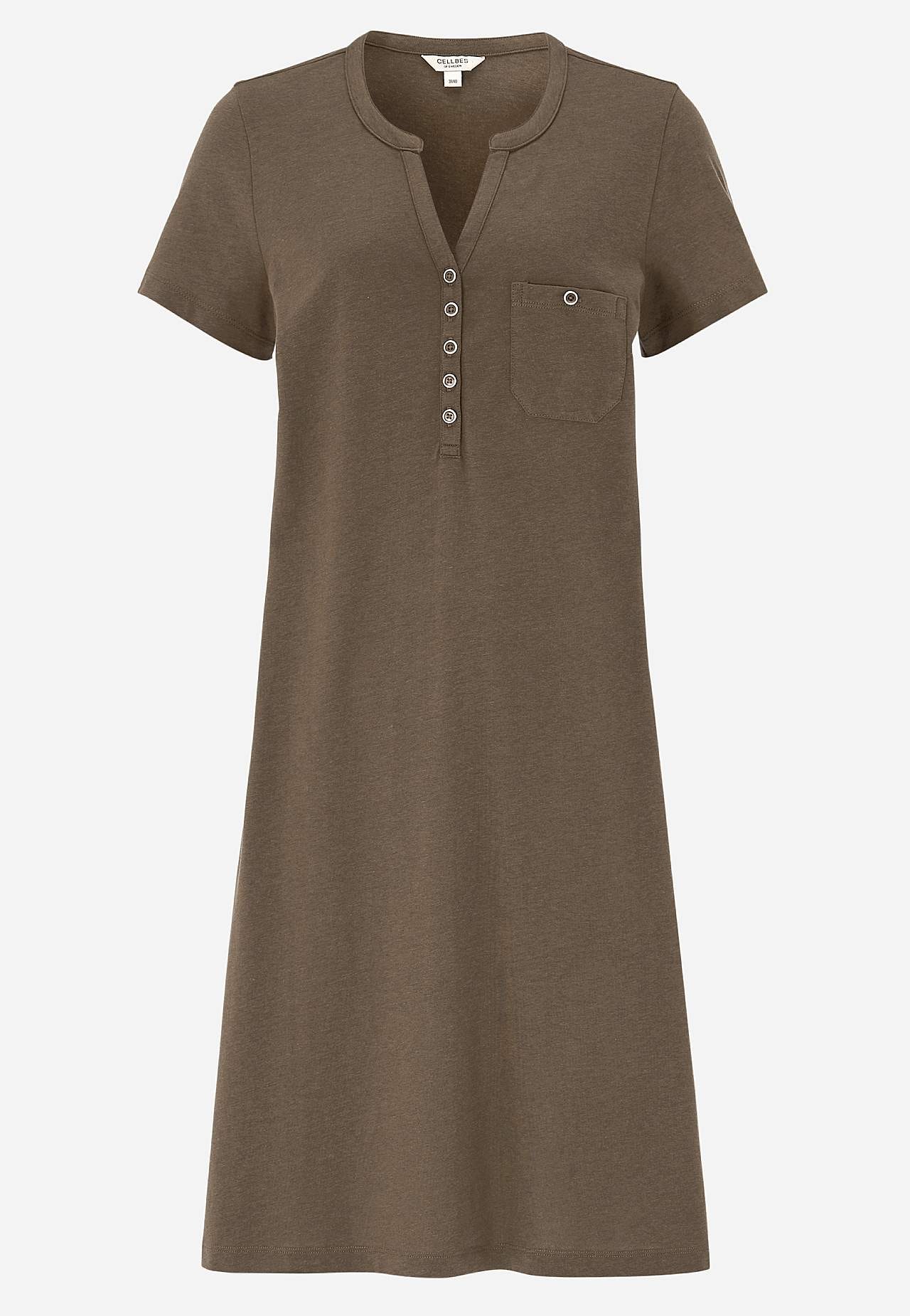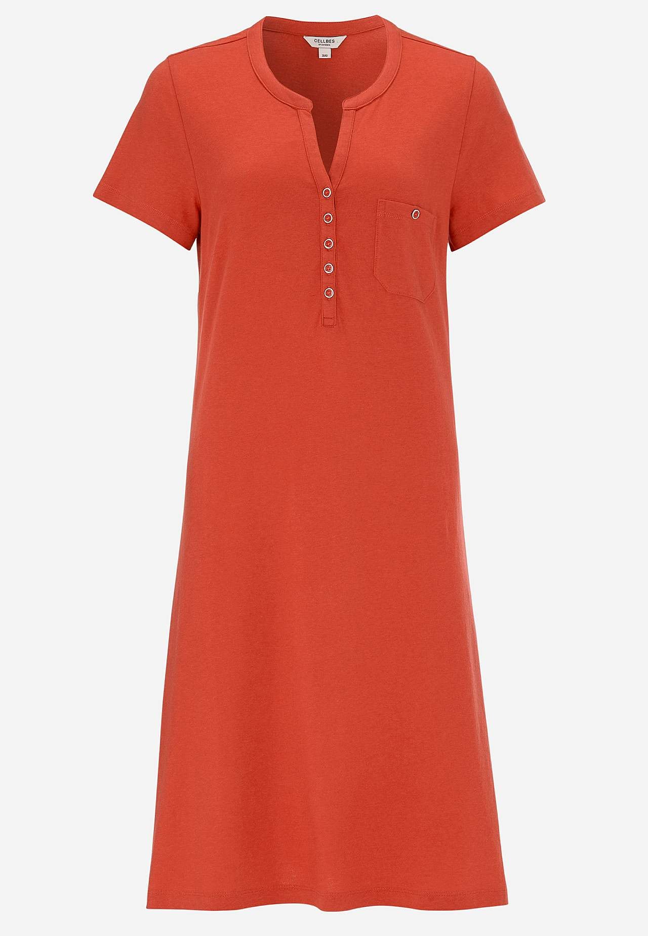 Kleid in A-Form mit kurzen Ärmeln. Jersey aus wunderschön weicher Bio-Baumwolle und modal. Runder Ausschnitt mit V-Schnitt und Knopfleiste. Kleine Brusttasche mit Knopf. Abnäher an der Büste. Sanft abgerundeter Saum. Die Länge hängt von der Größe ab und beträgt ca. 97-114 cm (von der Schulter gemessen).