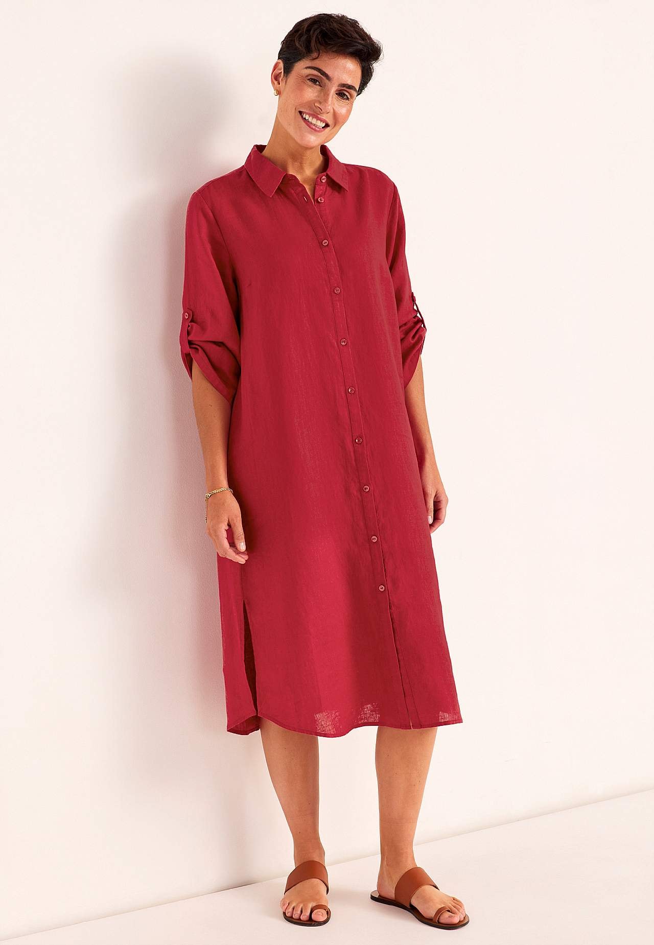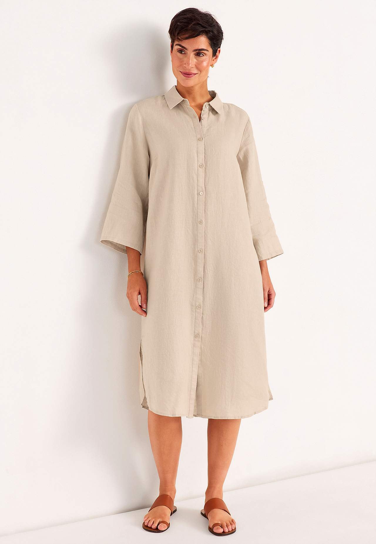 Hemdkleid aus 100% Flachs. Luftiges Material. Geräumige, gerade geschnittene Passform. Knopfleiste von oben nach unten. Faltbarer langer Ärmel mit Knopf-Detail. Abnäher an der Büste für beste Passform. Ein echter Favorit für jeden Tag! Die Länge hängt von der Größe ab und beträgt ca. 116-124 cm (von der Schulter gemessen).