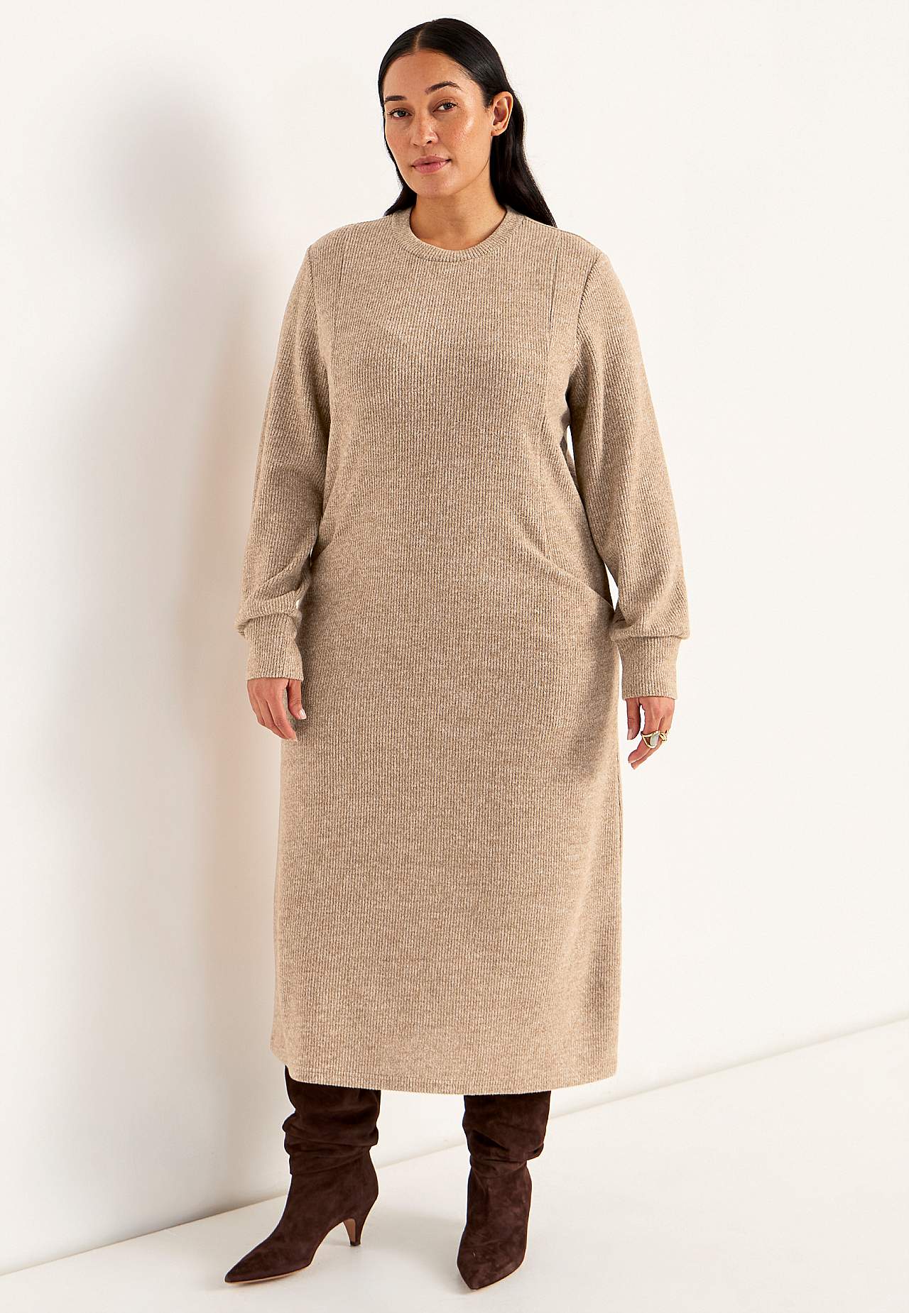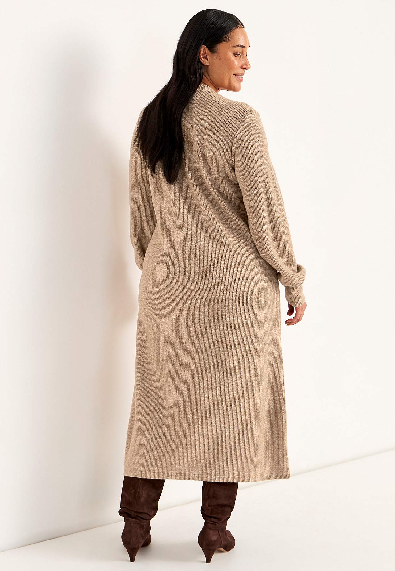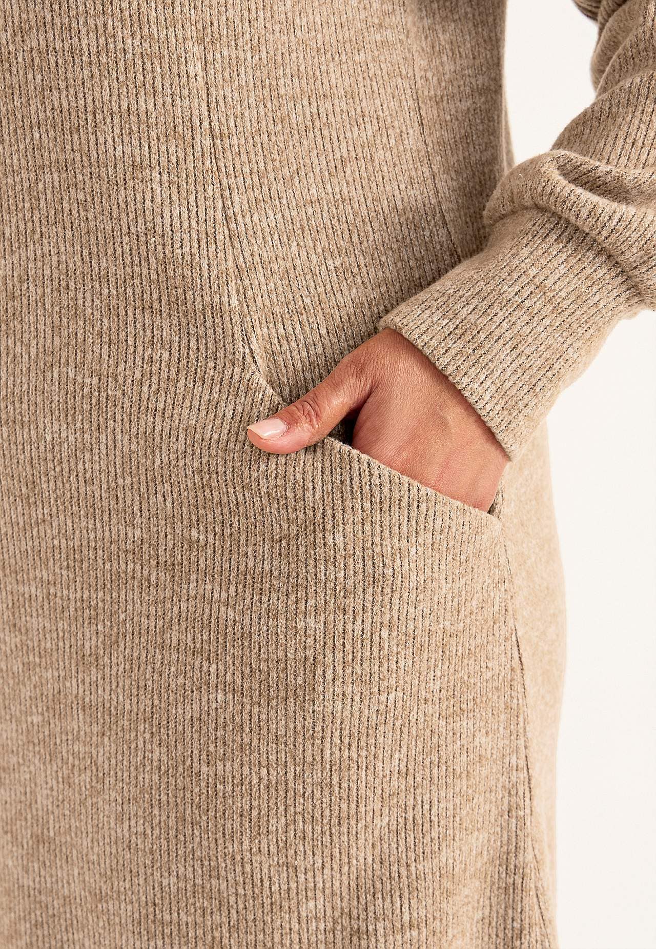 Elastisches, gestricktes Kleid. Geripptes Material mit gebürsteter Oberfläche. Gerade Passform. Rundausschnitt. Dekorative Säume vorne. Schräge, versteckte Taschen vorne. Lange Ärmel mit breiter Manschette an den Manschetten. Gerader Saum. Länge ab Schulter ca. 124 cm in allen Größen.