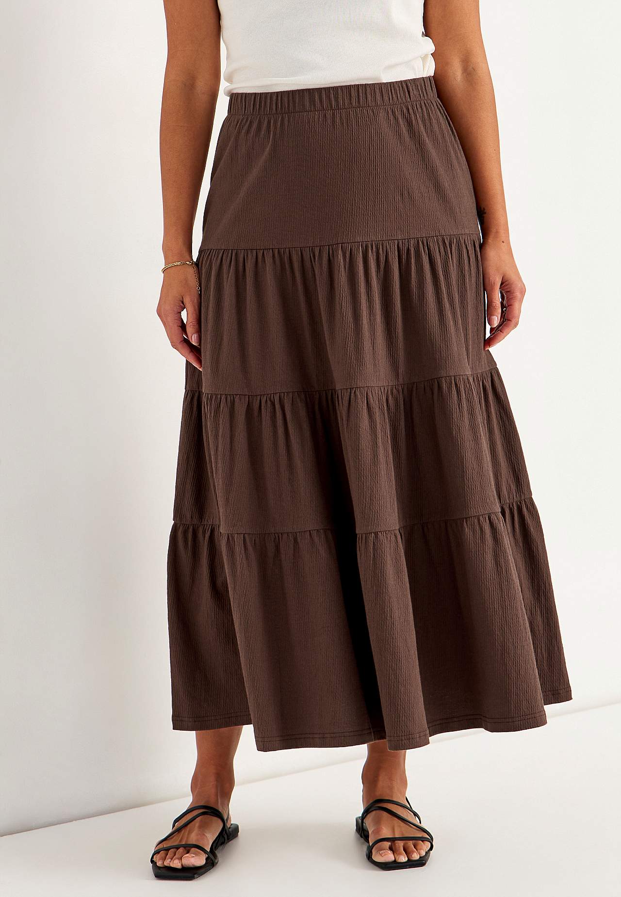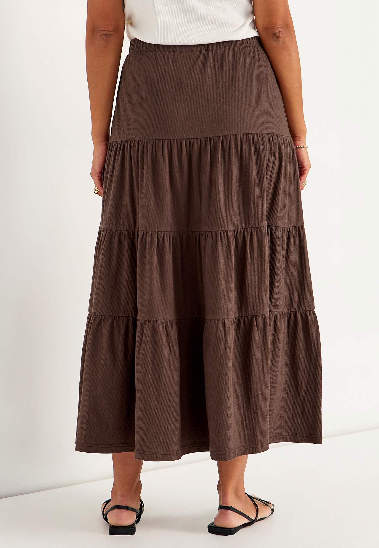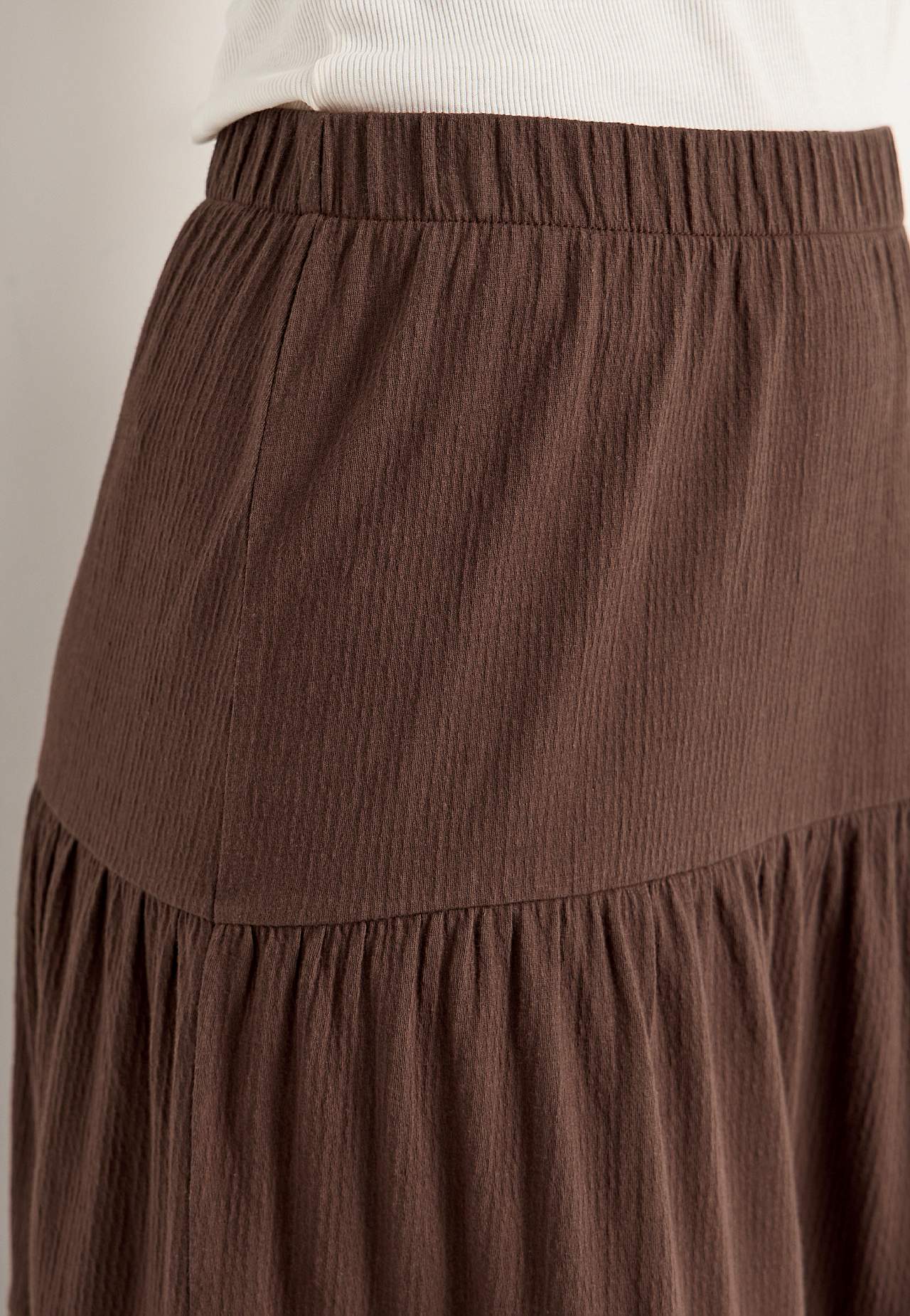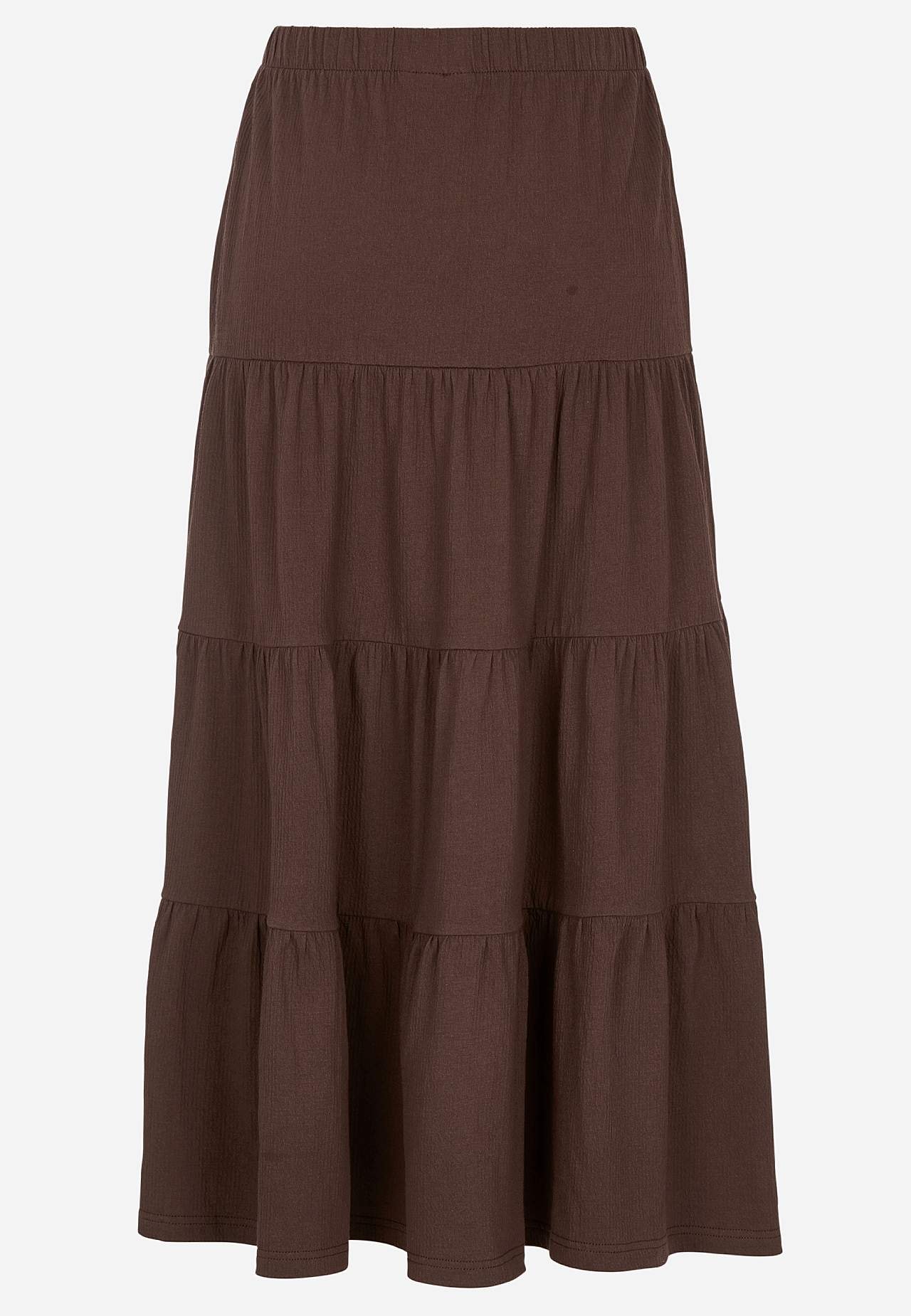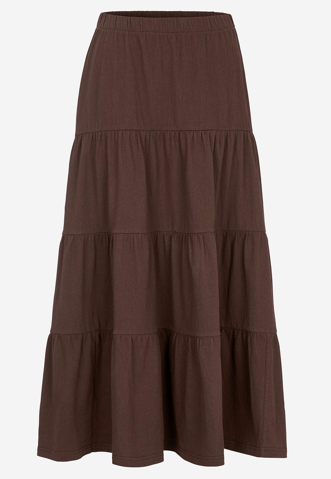 Weicher, elastischer Rock mit welliger Struktur. Passform in A-Form mit Breite am unteren Teil. Taille mit weichem, breitem Gummiband. Runder Saum. Kombiniere gerne mit 701369. Länge: 90 cm.