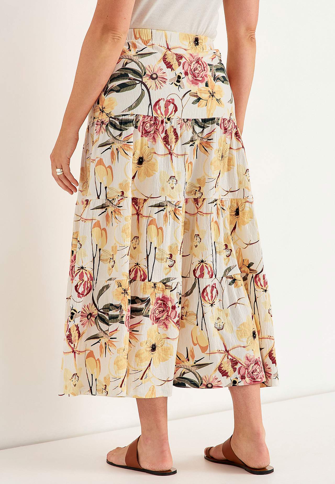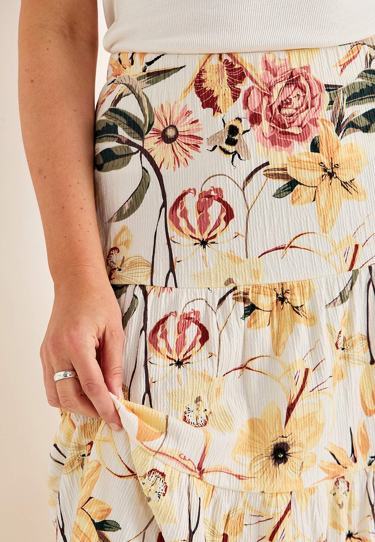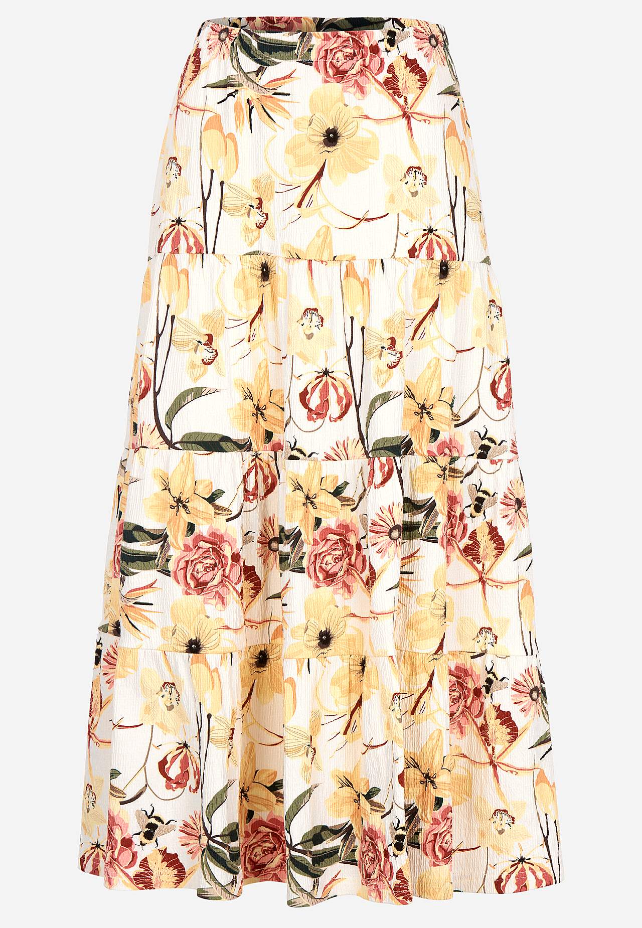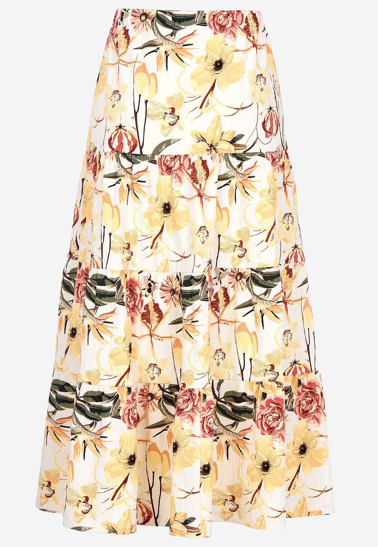 Weicher, elastischer Rock mit welliger Struktur. Passform in A-Form mit Breite am unteren Teil. Taille mit weichem, breitem Gummiband. Runder Saum. Kombiniere gerne mit 701369. Länge: 90 cm.