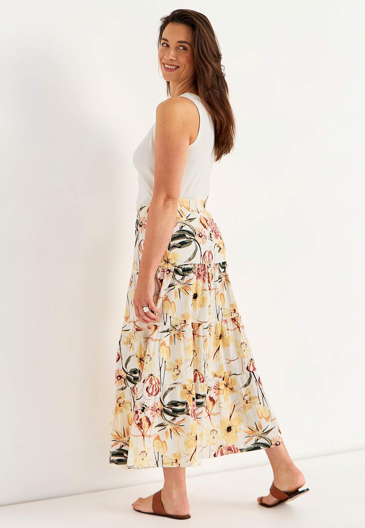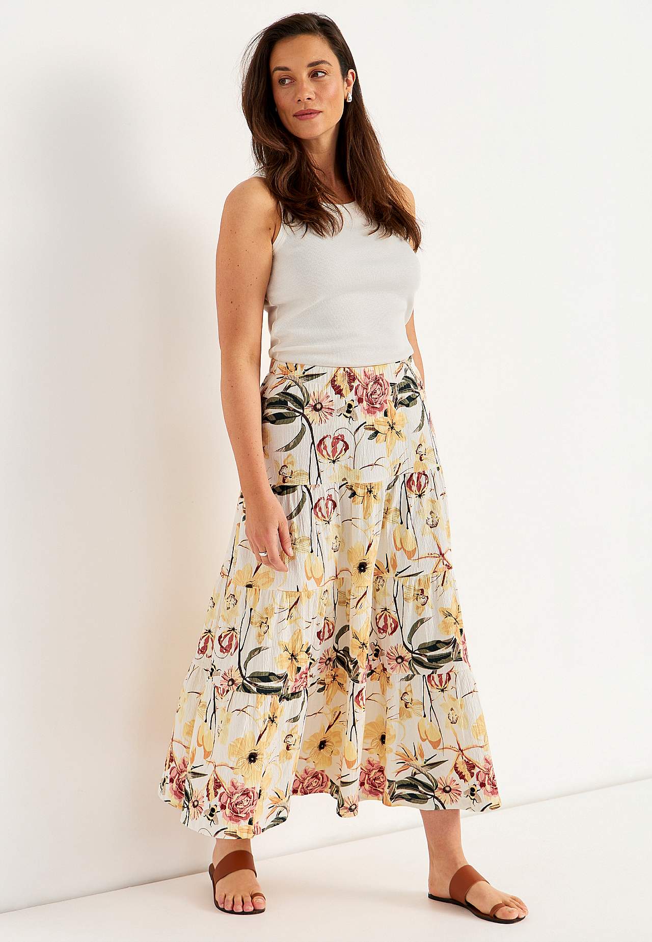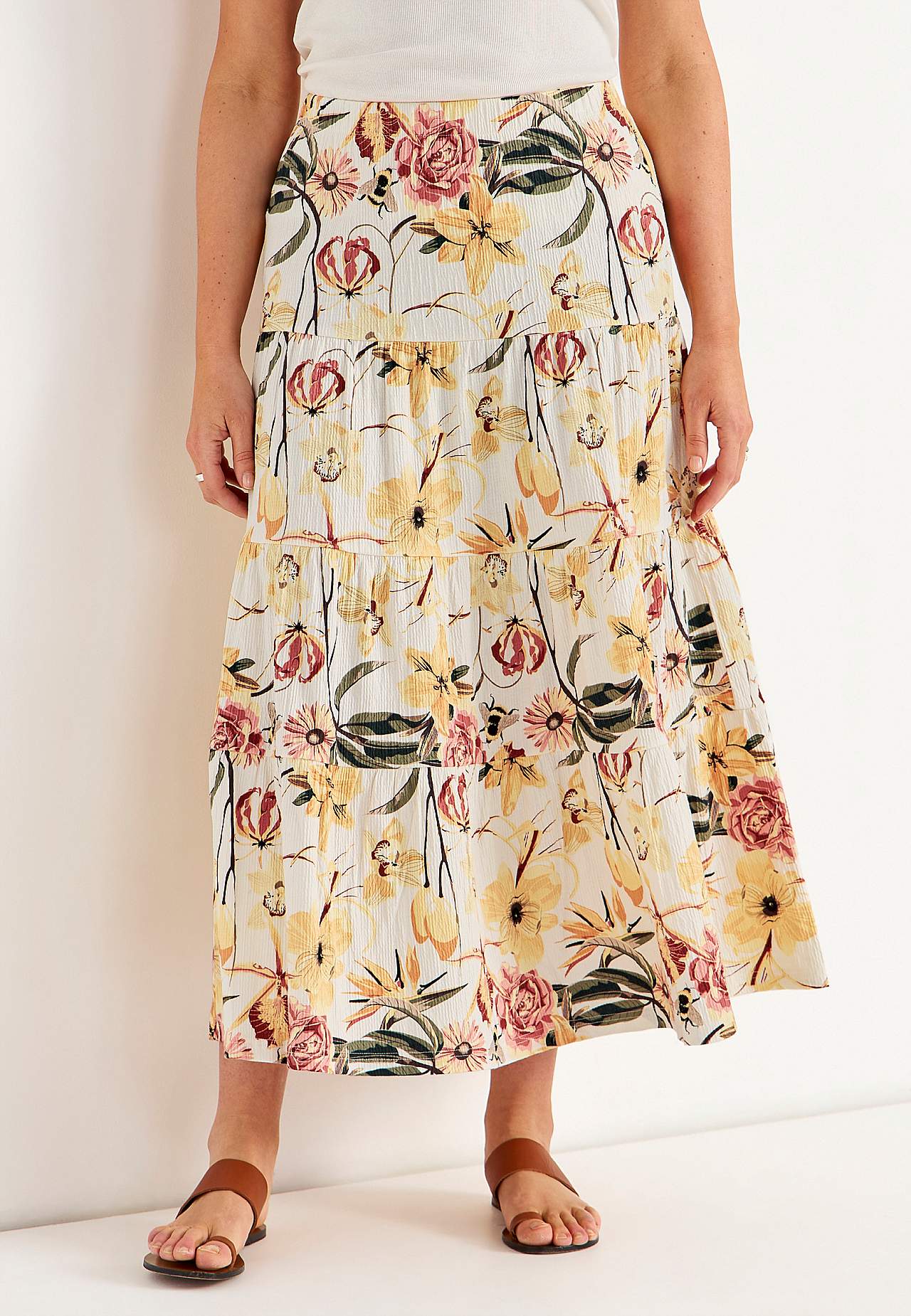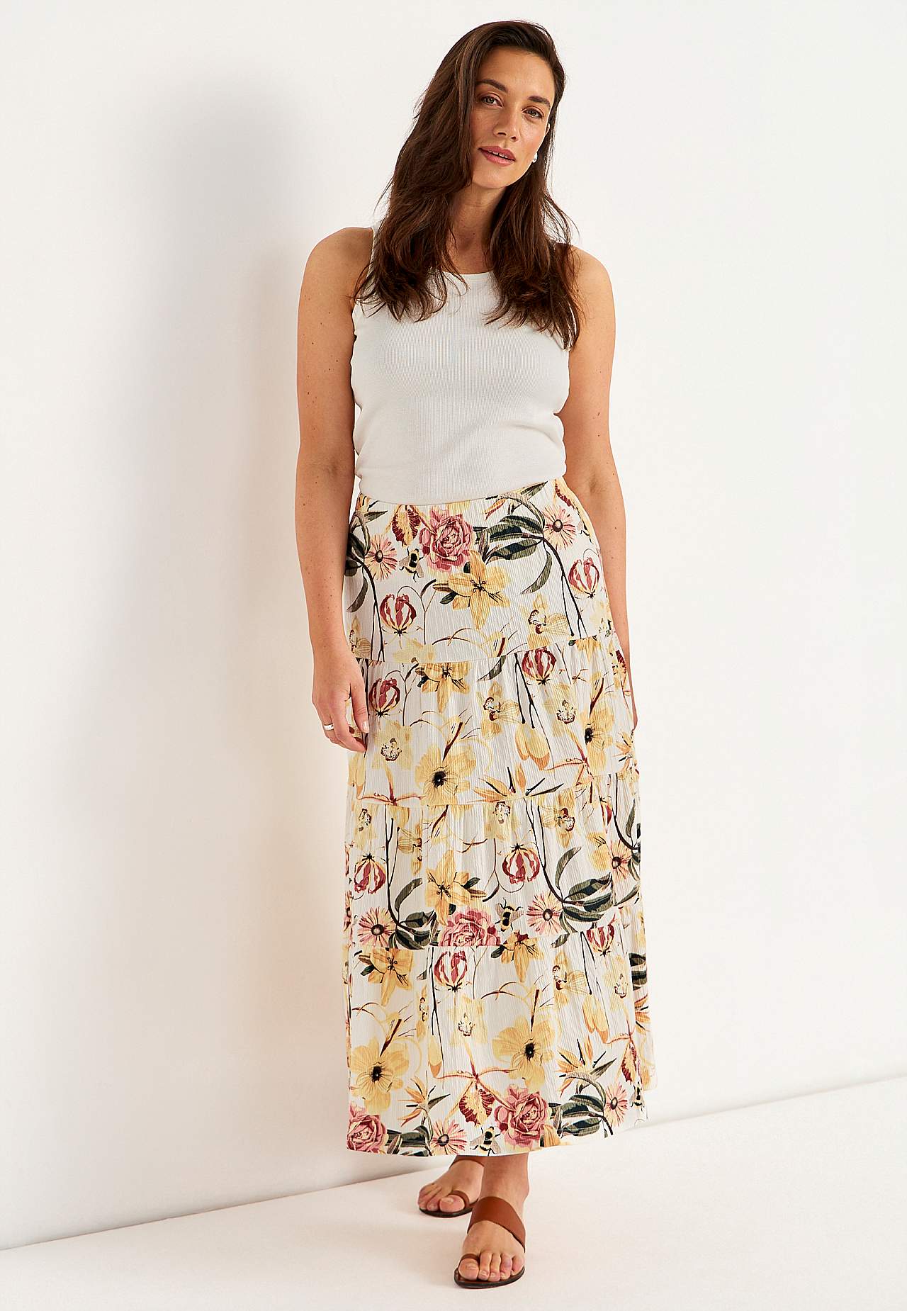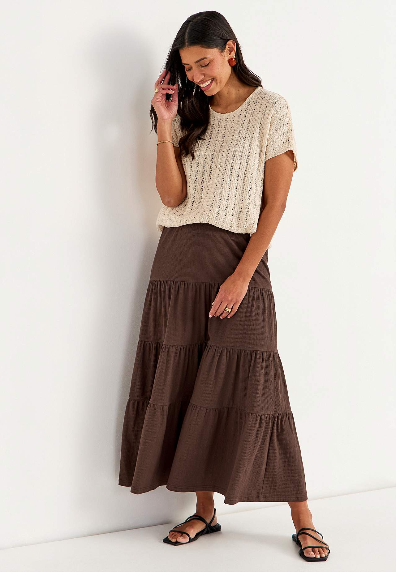 Weicher, elastischer Rock mit welliger Struktur. Passform in A-Form mit Breite am unteren Teil. Taille mit weichem, breitem Gummiband. Runder Saum. Kombiniere gerne mit 701369. Länge: 90 cm.