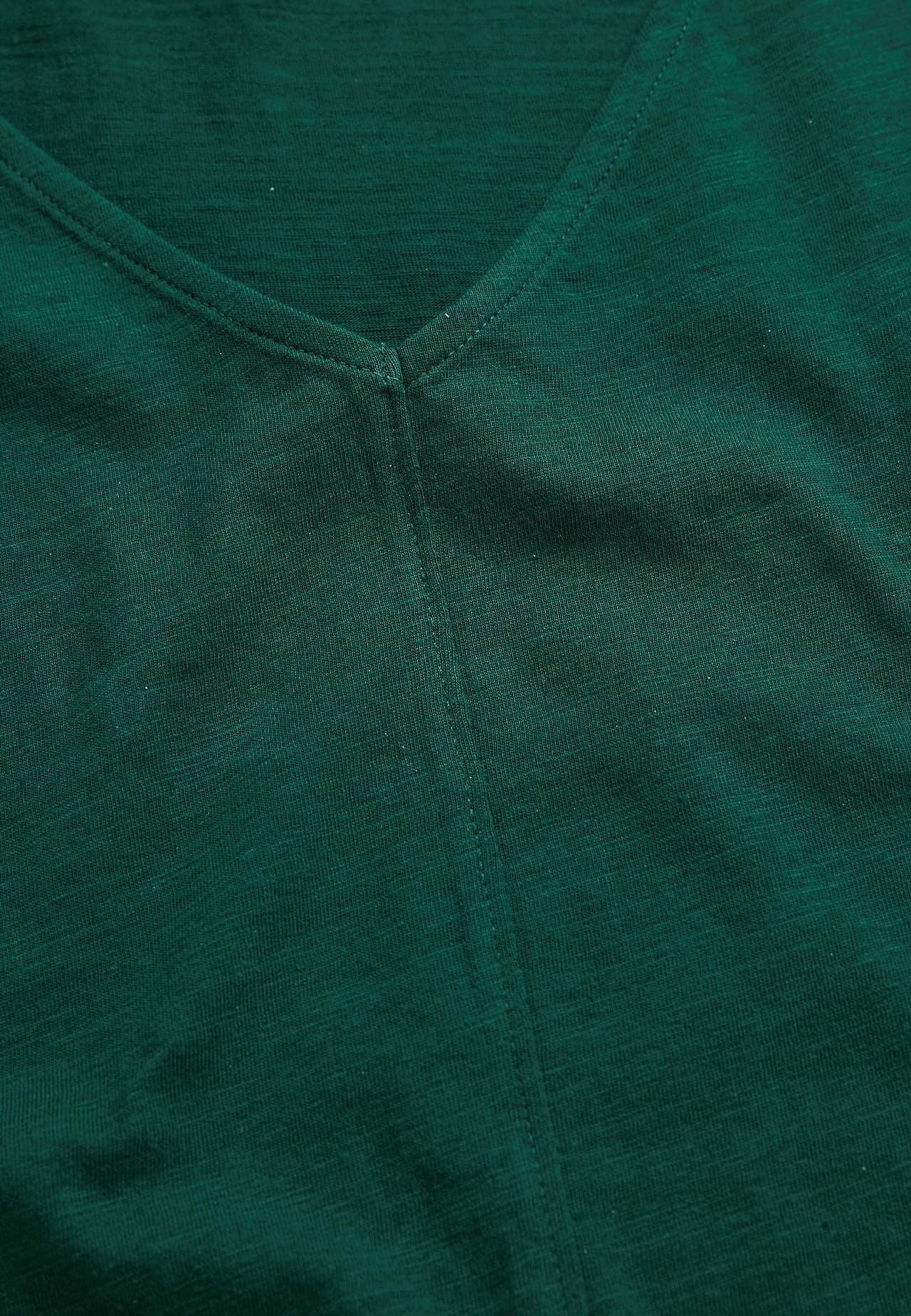 Luftige Slub-Qualität mit leichter Struktur. Passform in leichter A-Linie. V-Ausschnitt sowohl vorne als auch hinten. Zierstich mittig vorne. Die Länge hinten hängt von der Größe ab und liegt zwischen ca. 60-72 cm.