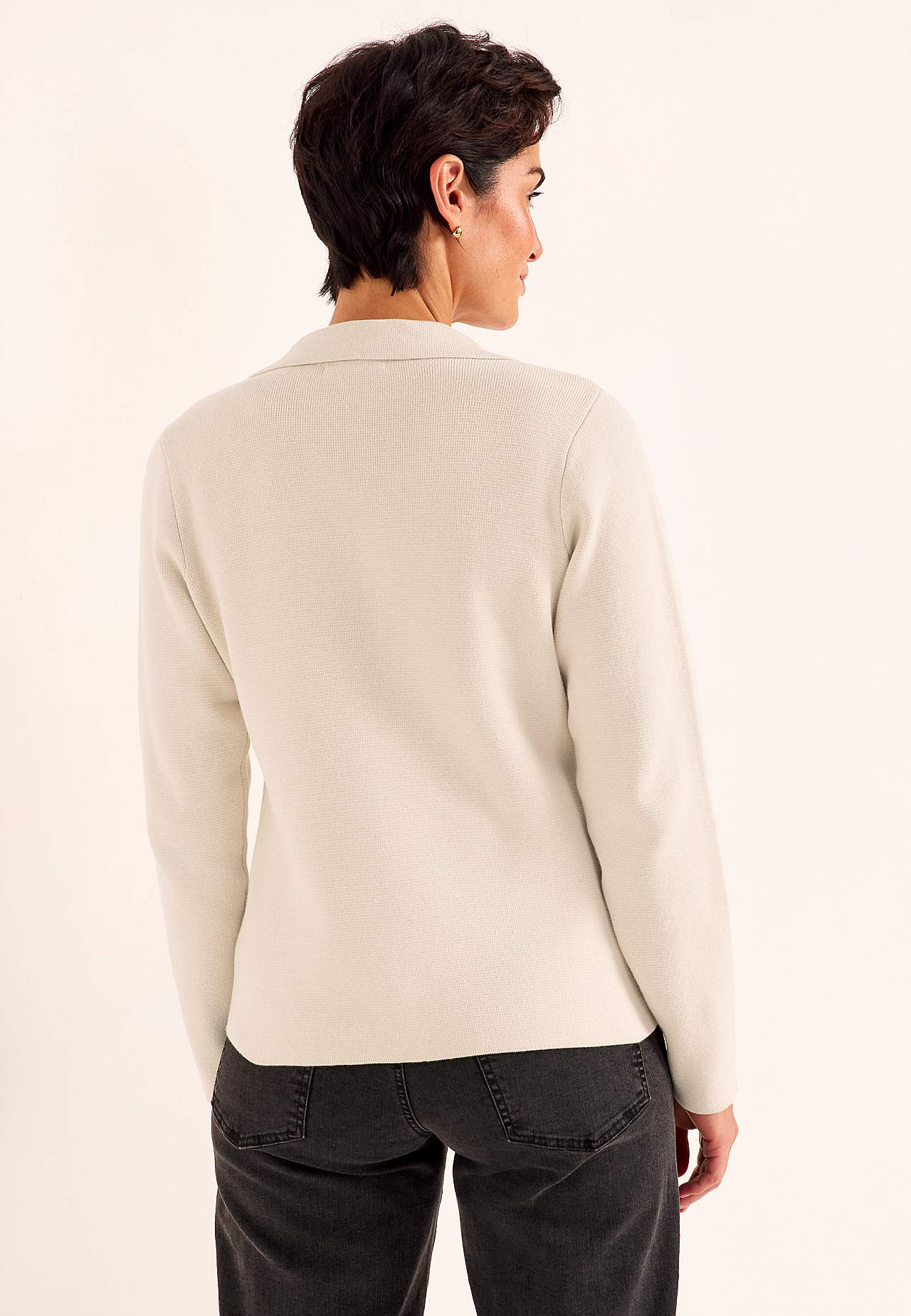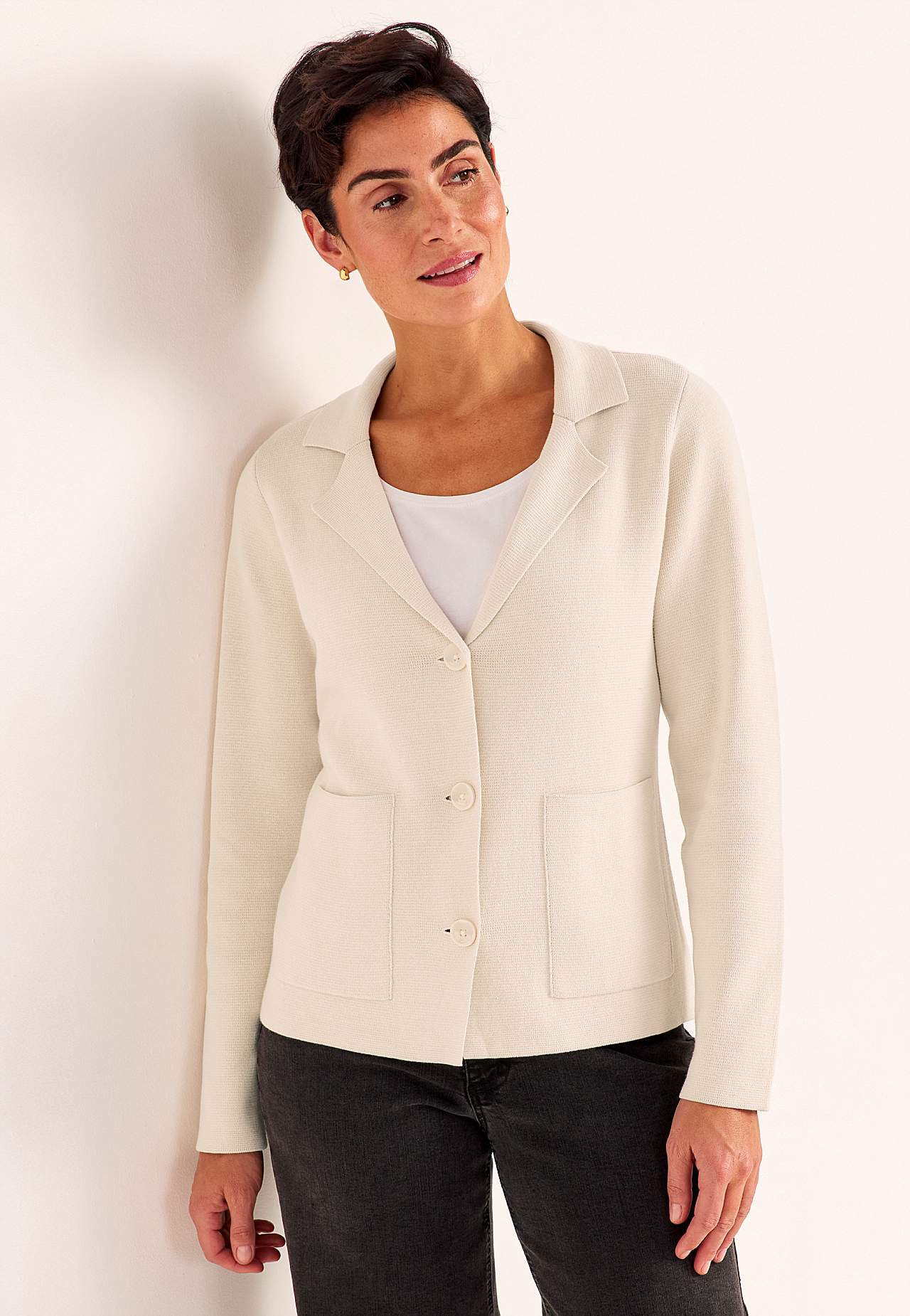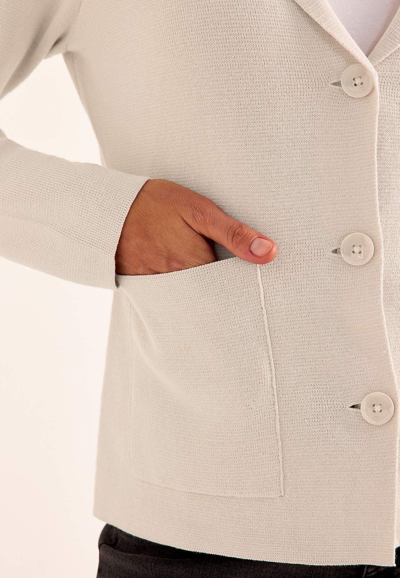 Fein gestrickt Blazer aus unnachgiebiger, weicher Baumwollqualität. Leicht figurbetonte Passform. Sauberes, stylisches Design perfekt für das ganze Jahr. Drei große Knöpfe. Taschen vorne. Lange Ärmel. Die Länge hängt von der Größe ab und beträgt ca. 61-70 cm (von der Schulter gemessen).