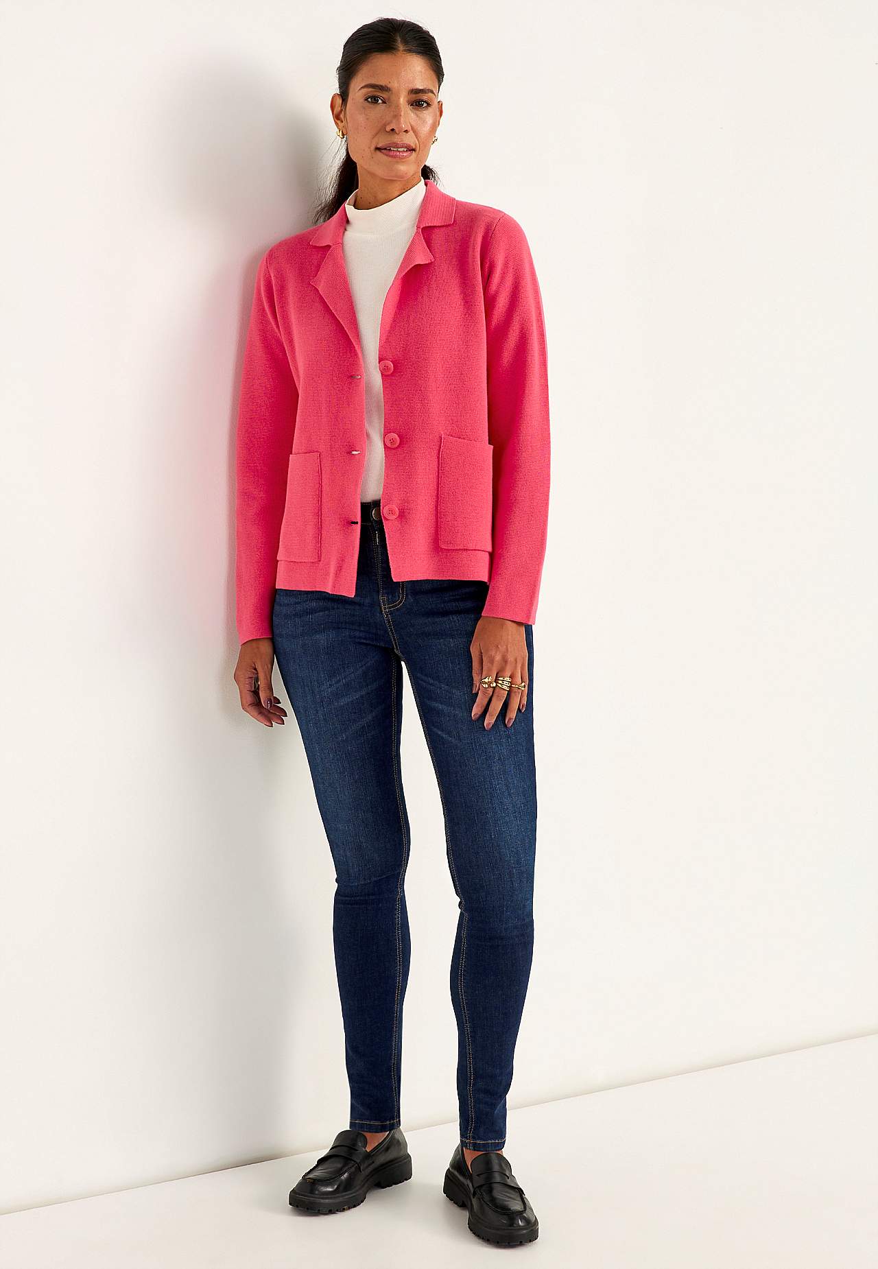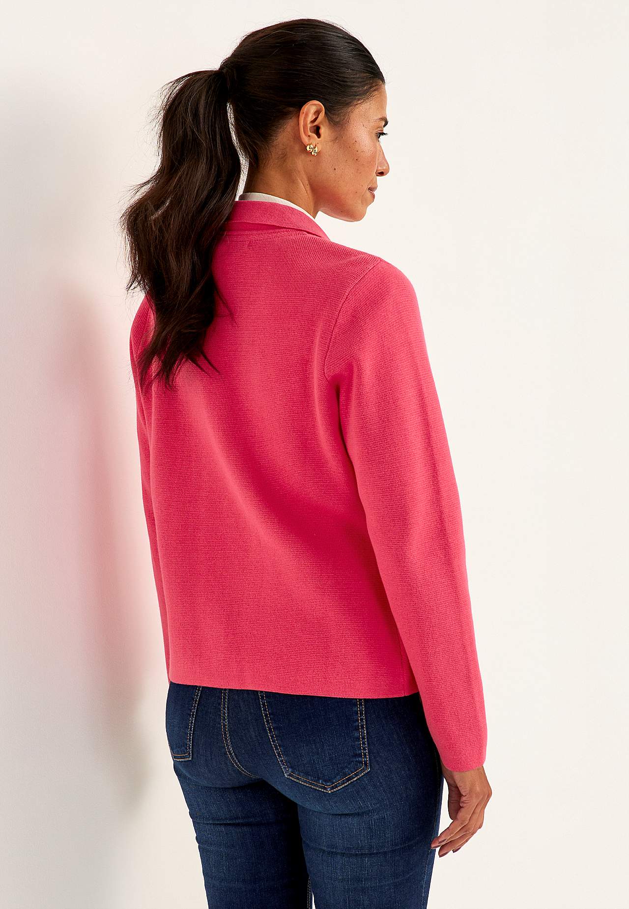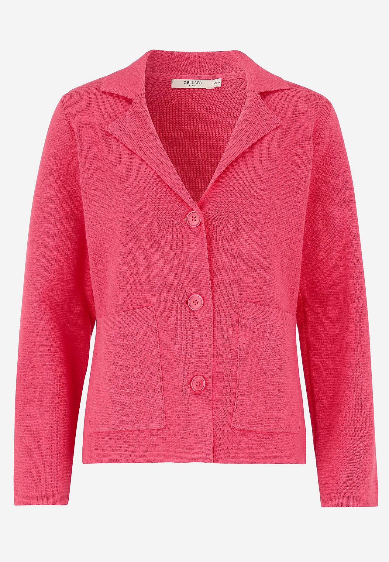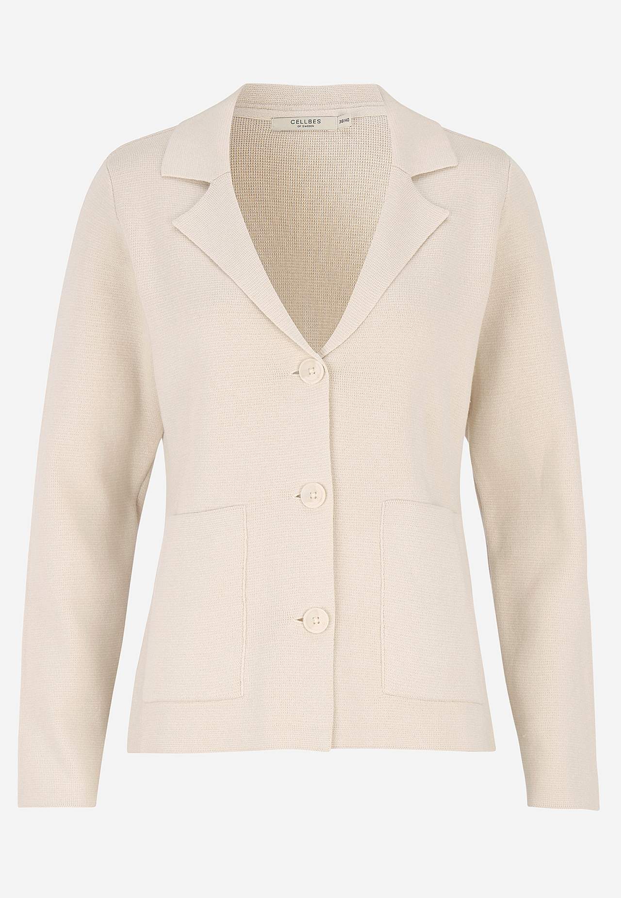 Fein gestrickt Blazer aus unnachgiebiger, weicher Baumwollqualität. Leicht figurbetonte Passform. Sauberes, stylisches Design perfekt für das ganze Jahr. Drei große Knöpfe. Taschen vorne. Lange Ärmel. Die Länge hängt von der Größe ab und beträgt ca. 61-70 cm (von der Schulter gemessen).