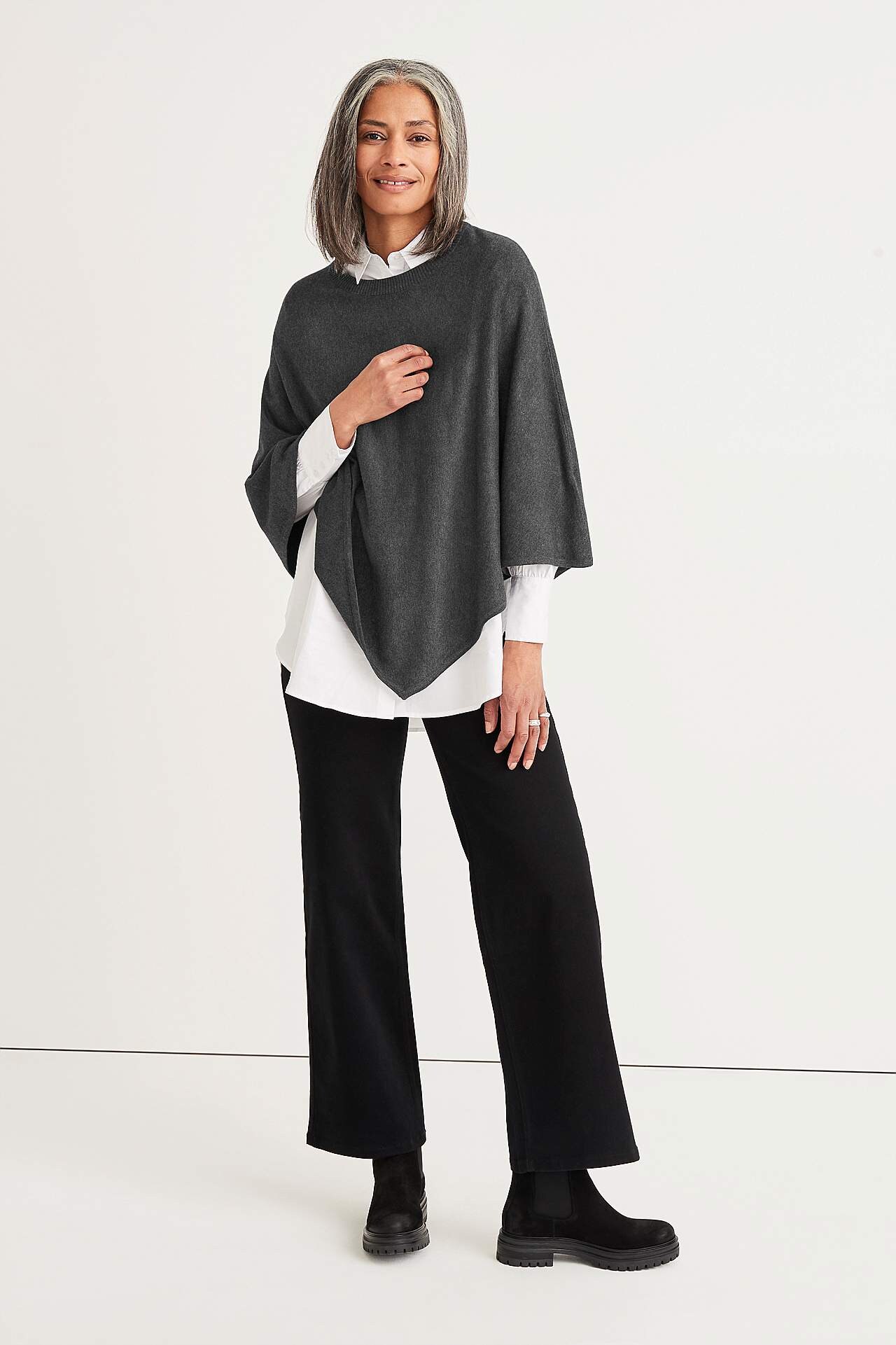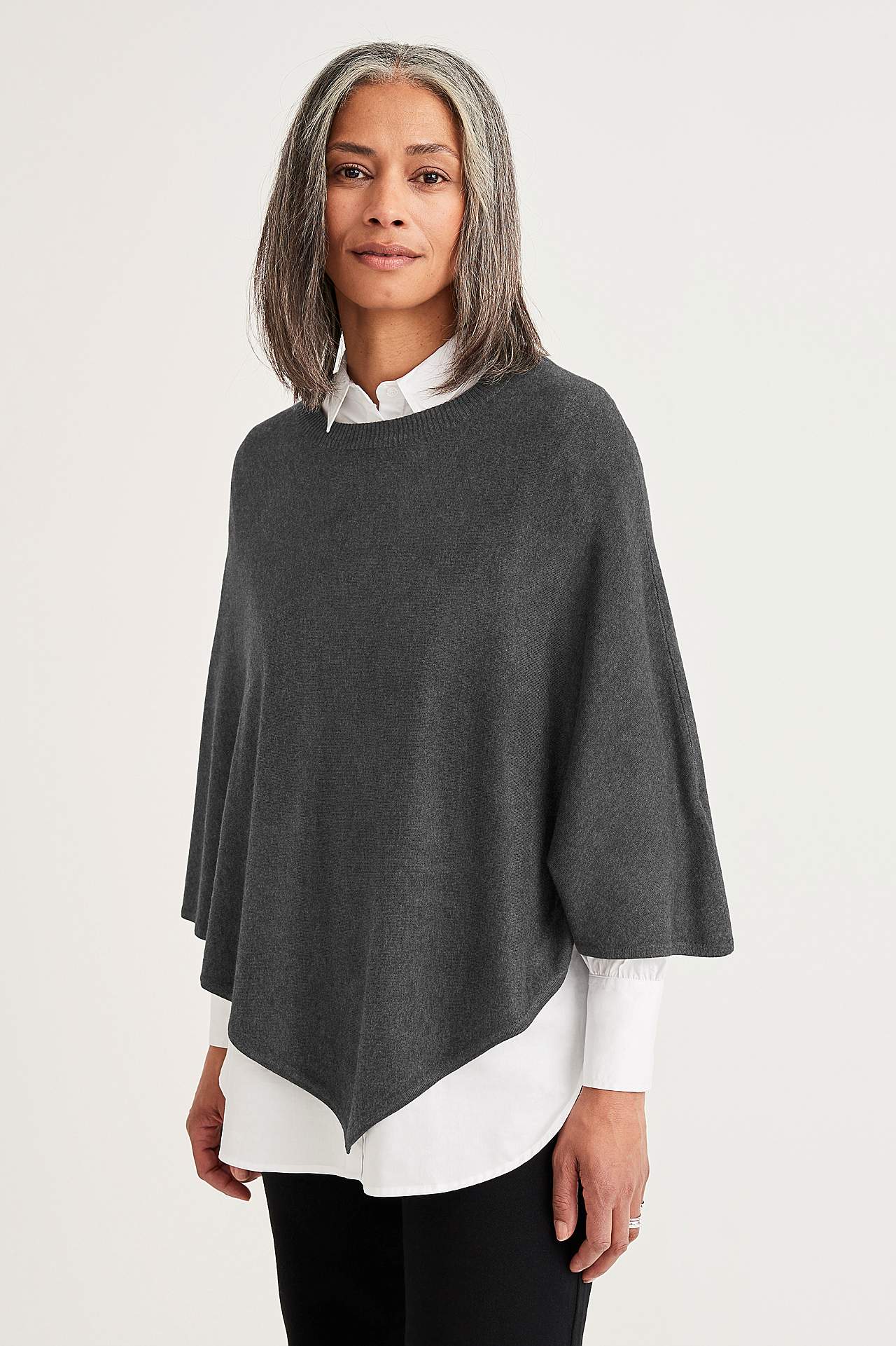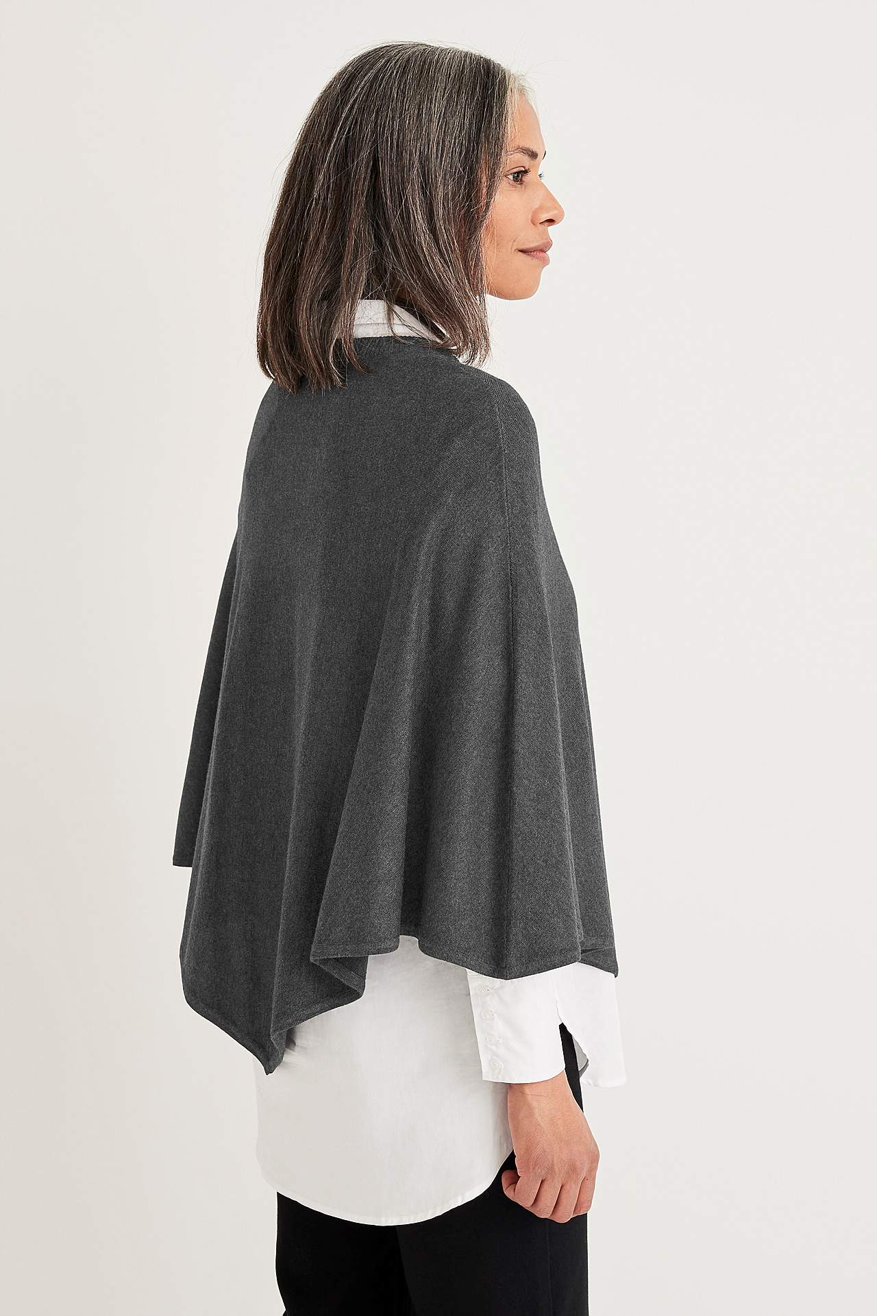 Fein gestrickt Poncho mit rundem, geripptem Ausschnitt. Von der Mitte des Rückens gemessen beträgt die Länge ca. 72 cm bei Größe 36/44.