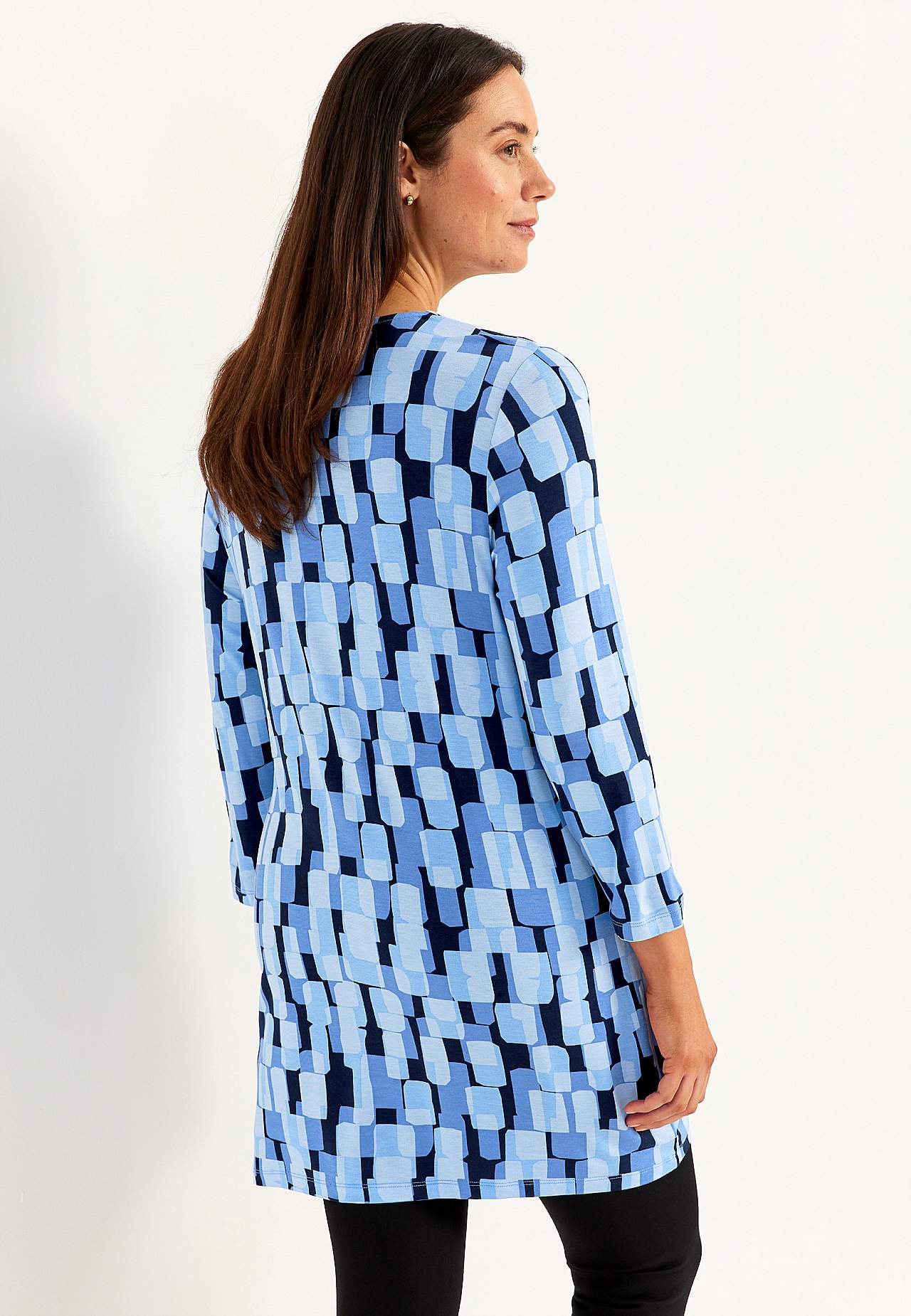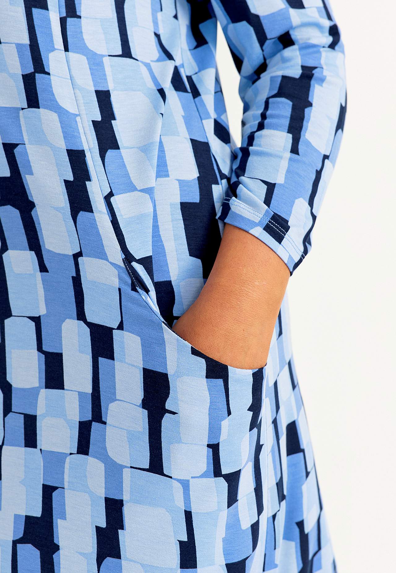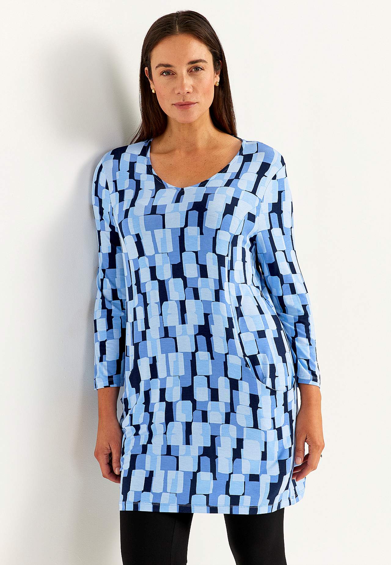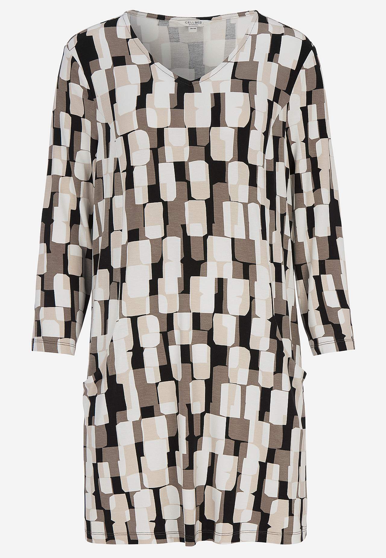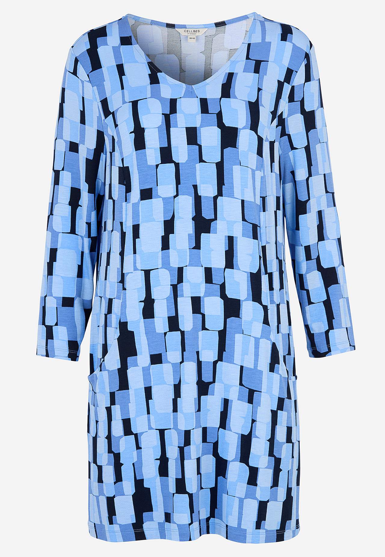 Tunika aus wunderbar weicher Viskose mit Stretch. Kühlendes Material mit nettem Faltenwurf. Normale Passform. V-förmiger Ausschnitt. Nähte vorne. Taschen vorne. Gerade 3/4-Ärmel. Gerader Saum. Die Länge hängt von der Größe ab und beträgt ca. 82-89 cm (von der Schulter gemessen).