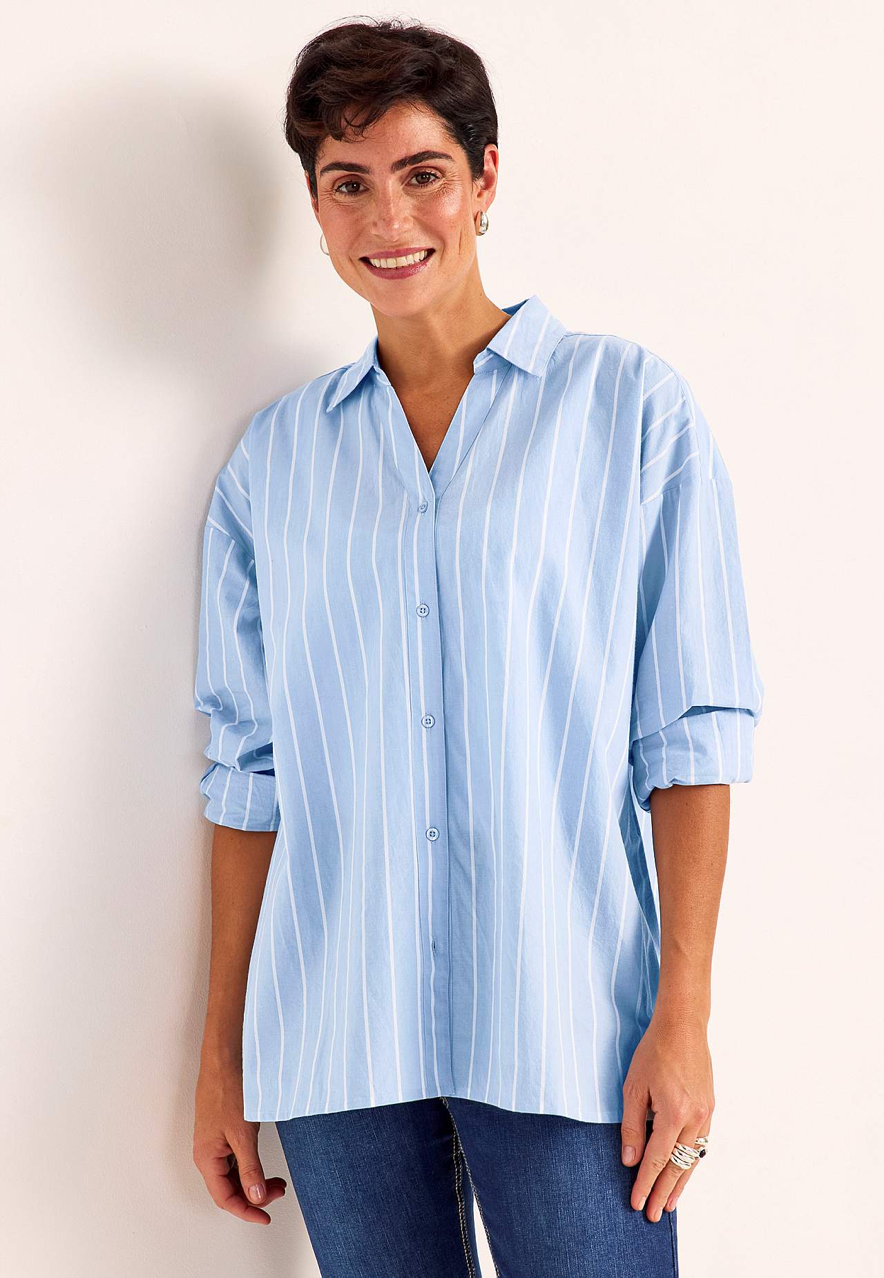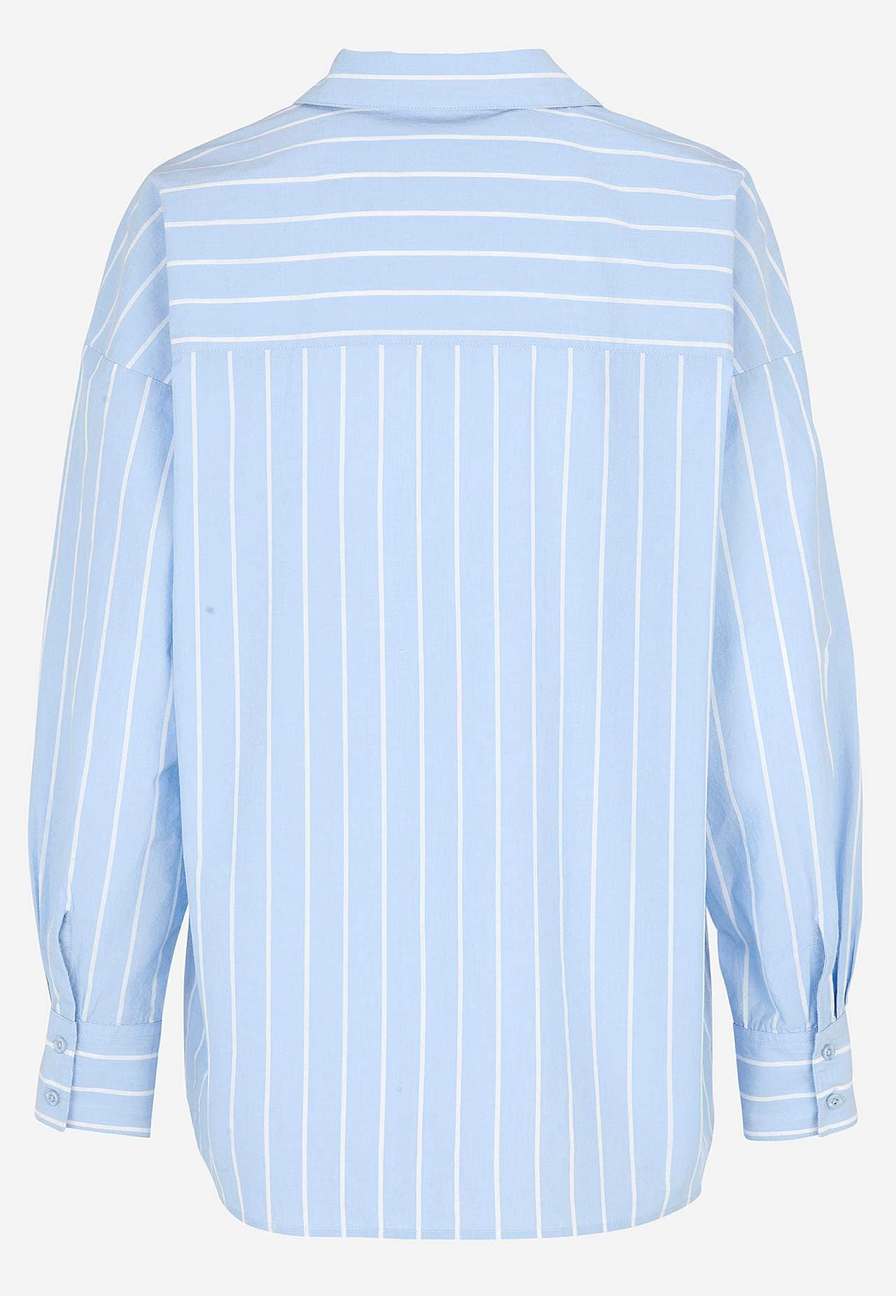 Längeres Hemd mit klassischem Kragen und garngefärbtem, elegantem Streifen. Gewebtes, weiches Material mit gestärktem Gefühl. Lockere und lässige Passform. Klassischer Kragen und werdener V-Ausschnitt. Überschnittene Schulter. Durchgeknöpftes Modell. Passe hinten. Lange Ärmel mit Manschette und Knöpfen. Runder Saum etwas l... Mehr erfahren