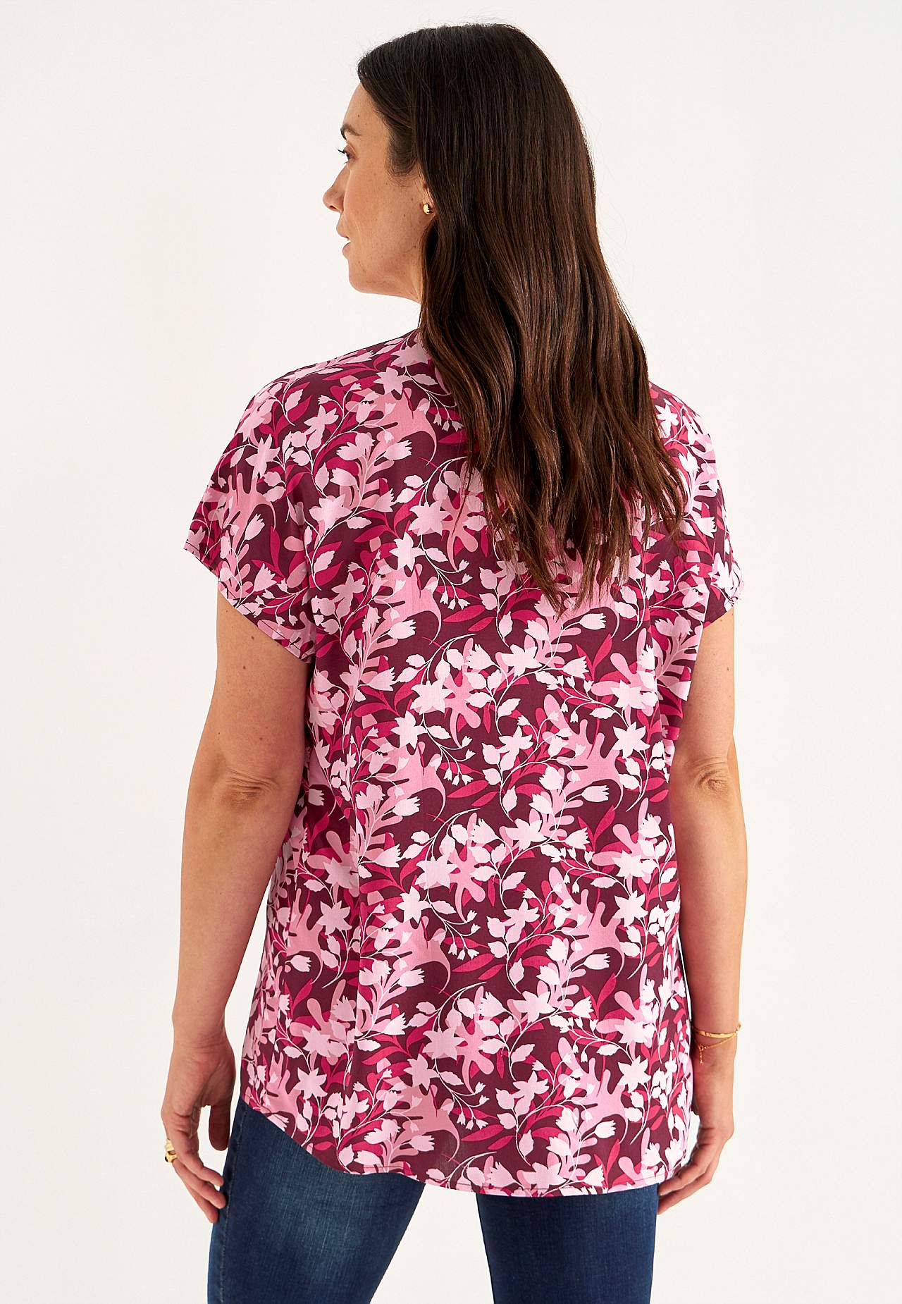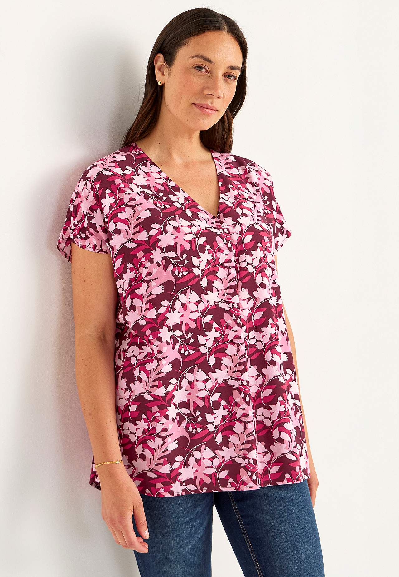 Tunika aus weicher, geschmeidiger Viskose. Etwas lockerere Passform. Ausschnitt mit einem V-Ausschnitt und dekorativer Falte vorne. Flügelärmel. Sanft abgerundeter Saum etwas länger am Rücken. Die Länge hängt von der Größe ab und beträgt ca. 71-83 cm (von der Schulter gemessen).