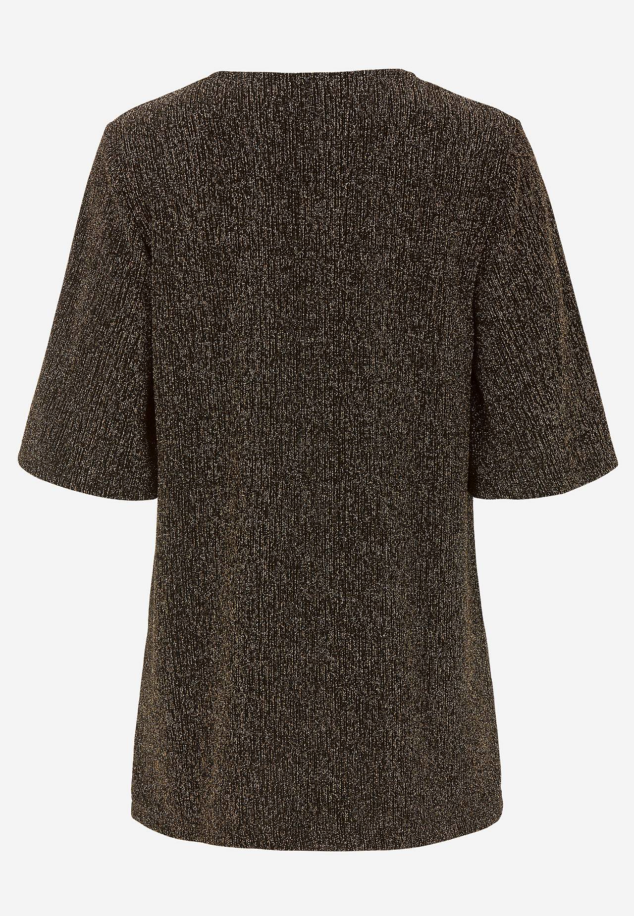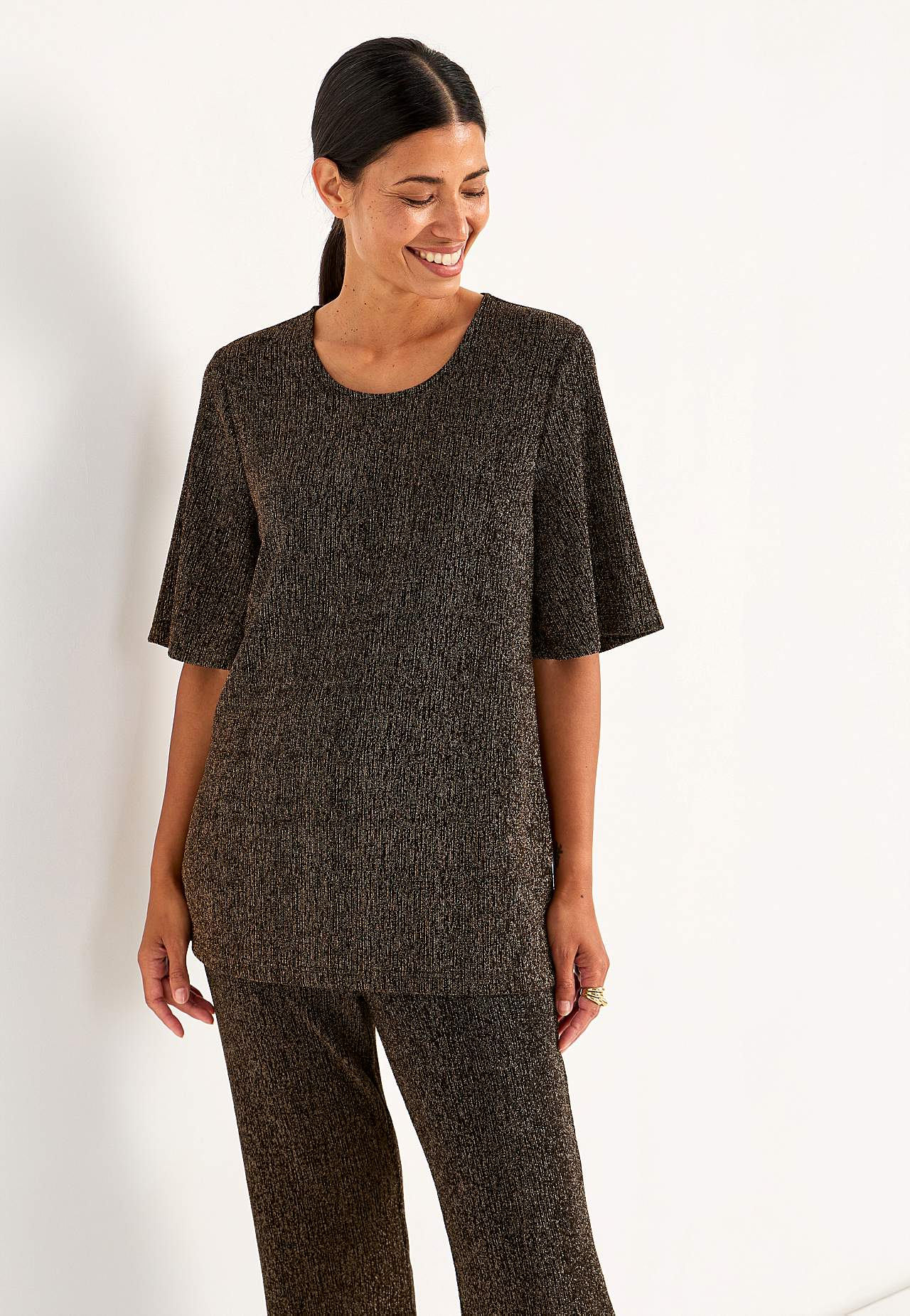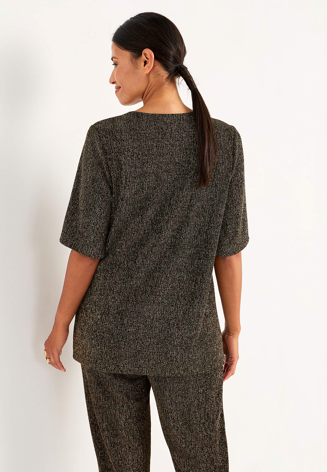 Glänzende Jersey-Tunika perfekt für die Festlichkeiten. Passform in A-Form. Weiches, elastisches Material mit glitzernden Gewinden. Rundhalsausschnitt. 3/4-lange Raglanärmel mit angenehmer Breite. Leicht gerundeter Saum. Die Länge hängt von der Größe ab und beträgt ca. 71-88 cm.