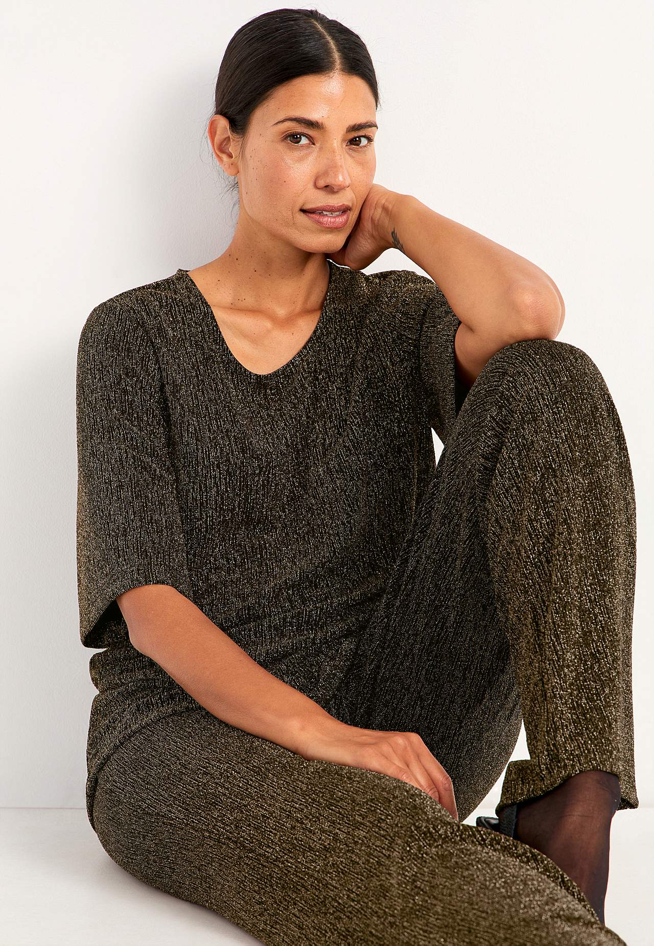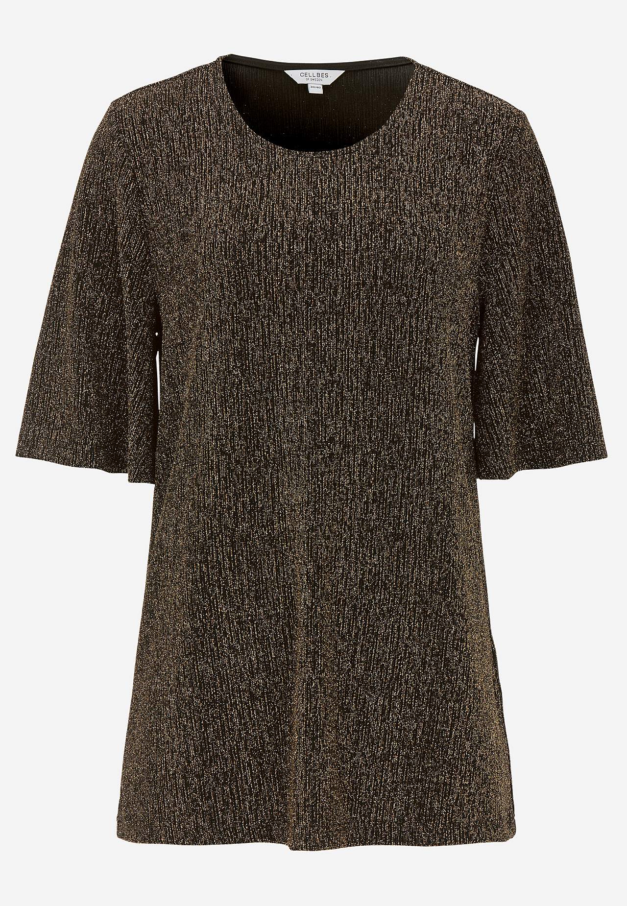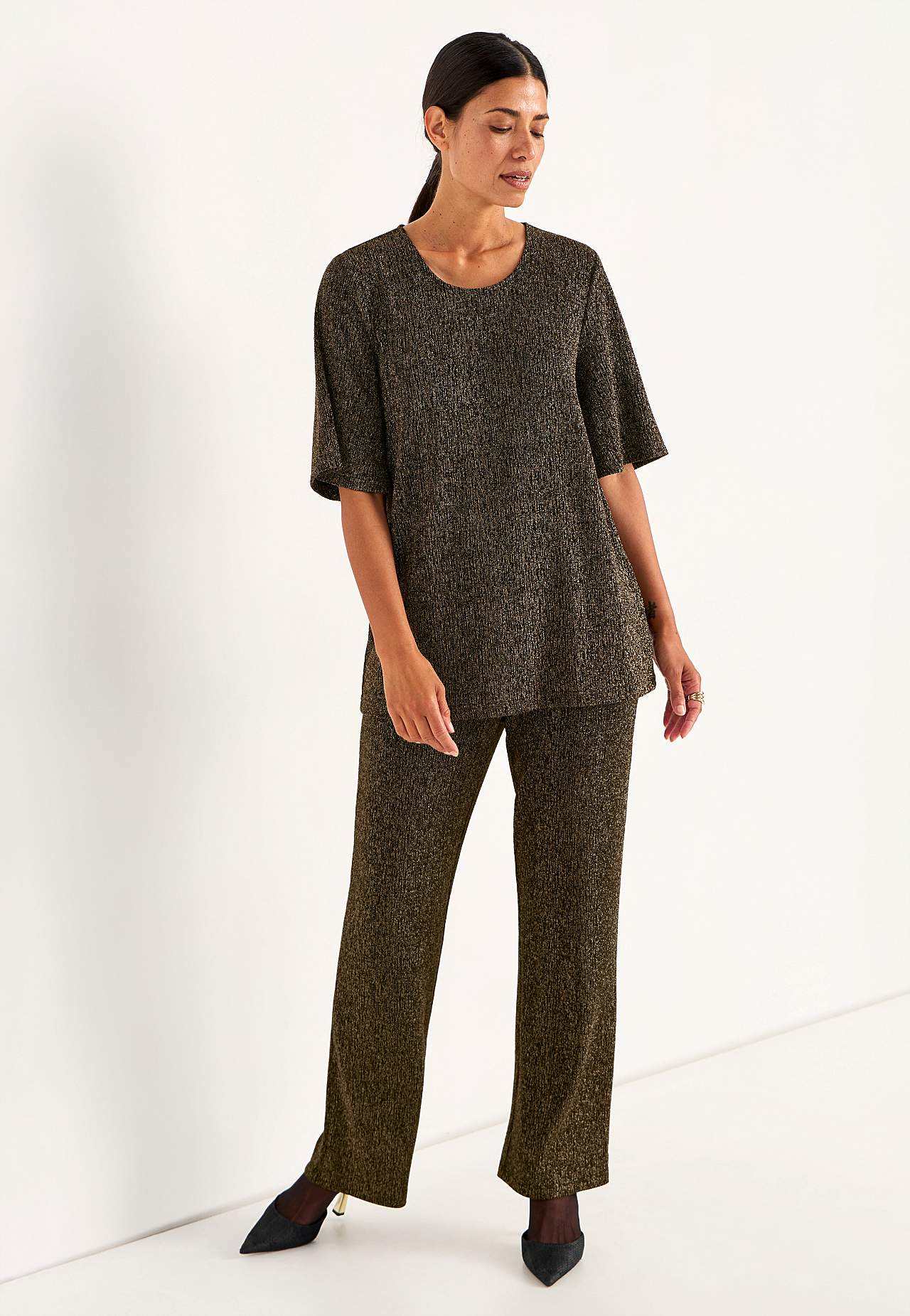 Glänzende Jersey-Tunika perfekt für die Festlichkeiten. Passform in A-Form. Weiches, elastisches Material mit glitzernden Gewinden. Rundhalsausschnitt. 3/4-lange Raglanärmel mit angenehmer Breite. Leicht gerundeter Saum. Die Länge hängt von der Größe ab und beträgt ca. 71-88 cm.