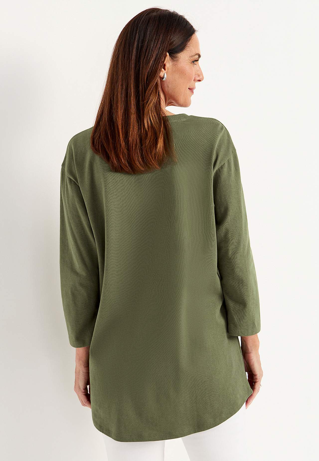 Tunika-Top mit angenehmen, großen Taschen. Weiche, feste, etwas schwerere Qualität. Oversize Passform. Runder, gerippter Ausschnitt. Überschnittene Schulter. 3/4-lange, etwas breitere Ärmel. Große aufgenähte Taschen. Runder Saum. Die Länge hängt von der Größe ab und beträgt ca. 78-92 cm (von der Schulter gemessen).