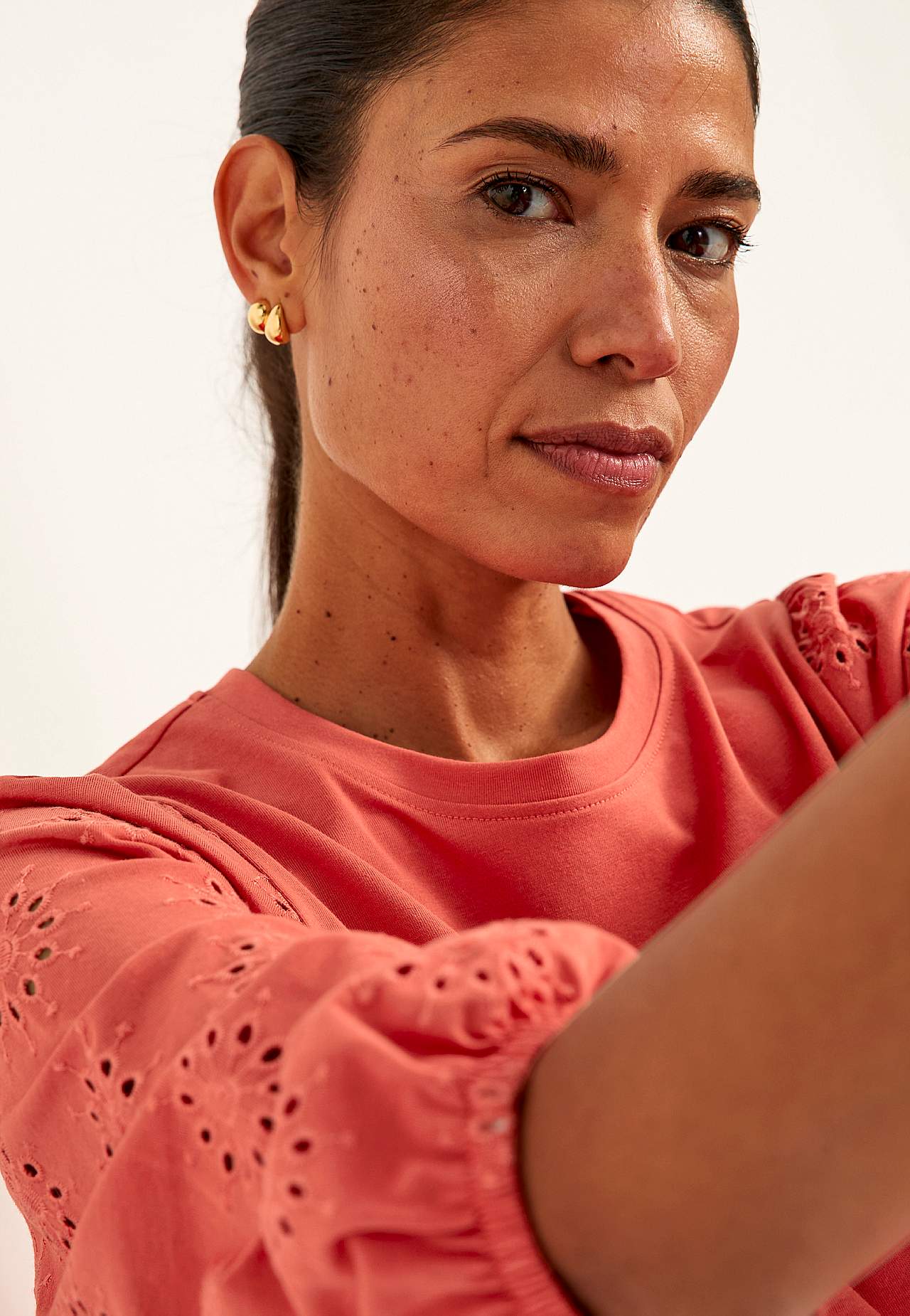 Tunika aus etwas schwererer, fester Baumwollmischung. Normale Passform. Auffallende Raffung an den Schultern. Runder Ausschnitt. Breite, 3/4-lange Ärmel mit Lochmuster mit Englische Borte und Gummiband an den Manschetten. Gerader Saum. Die Länge hinten hängt von der Größe ab und liegt zwischen ca. 78-86 cm.