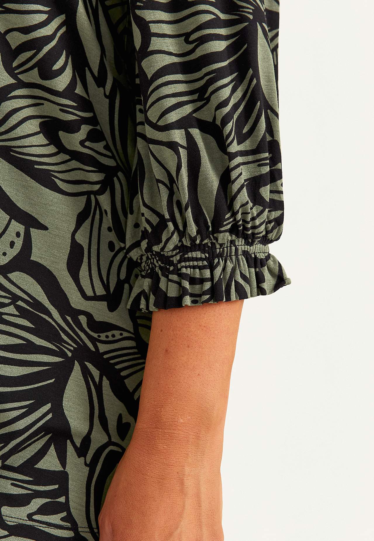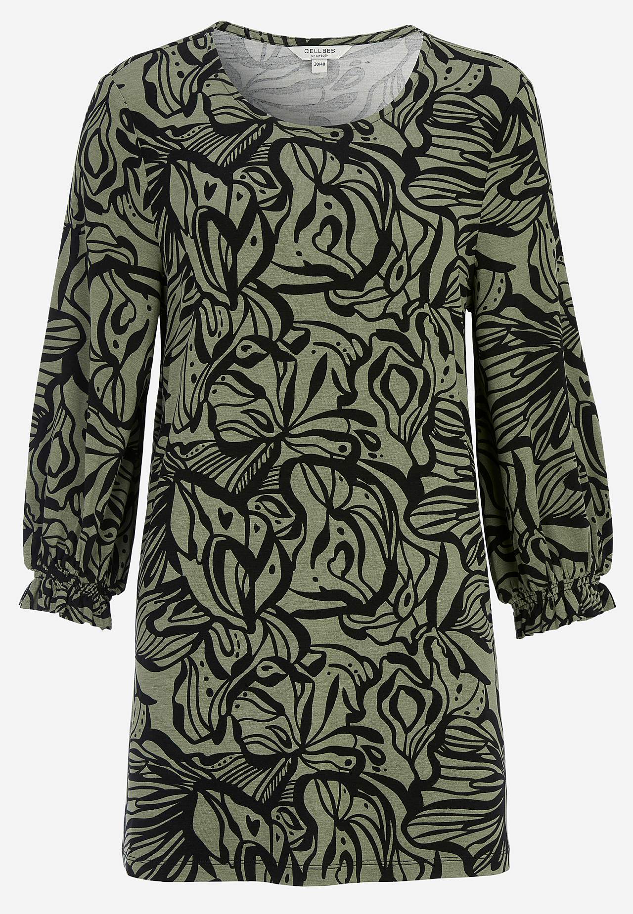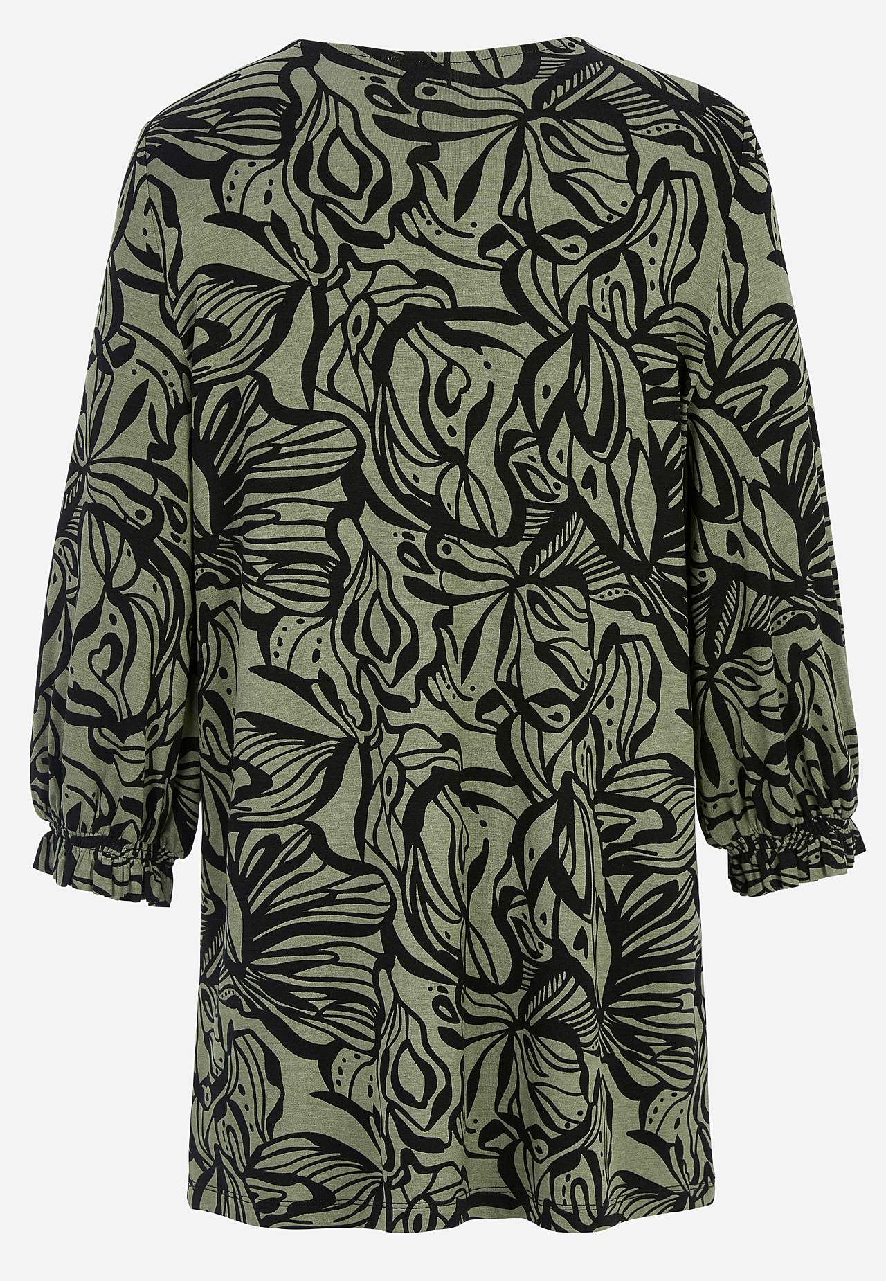 Angenehmer, dicker Faltenwurf. Normale Passform. Runder Ausschnitt. 3/4-lange, breite Ärmel und Smokarbeit an den Manschetten. Die Länge hängt von der Größe ab und beträgt ca. 73-80 cm (von der Schulter gemessen).