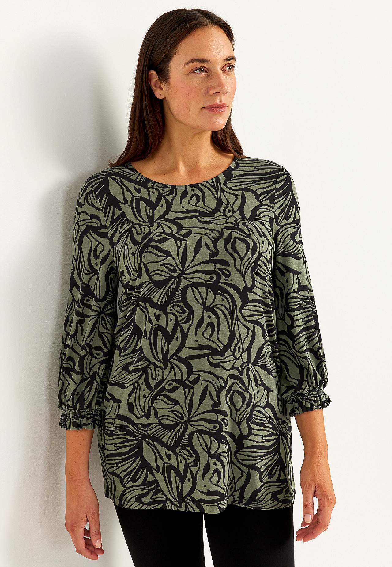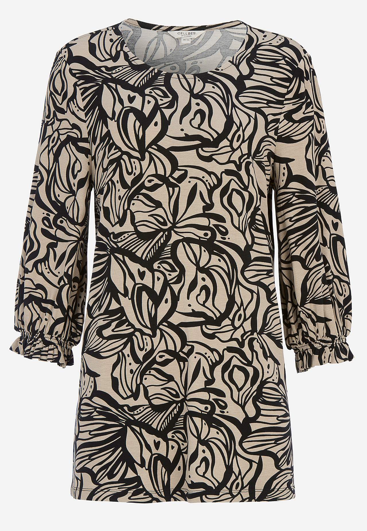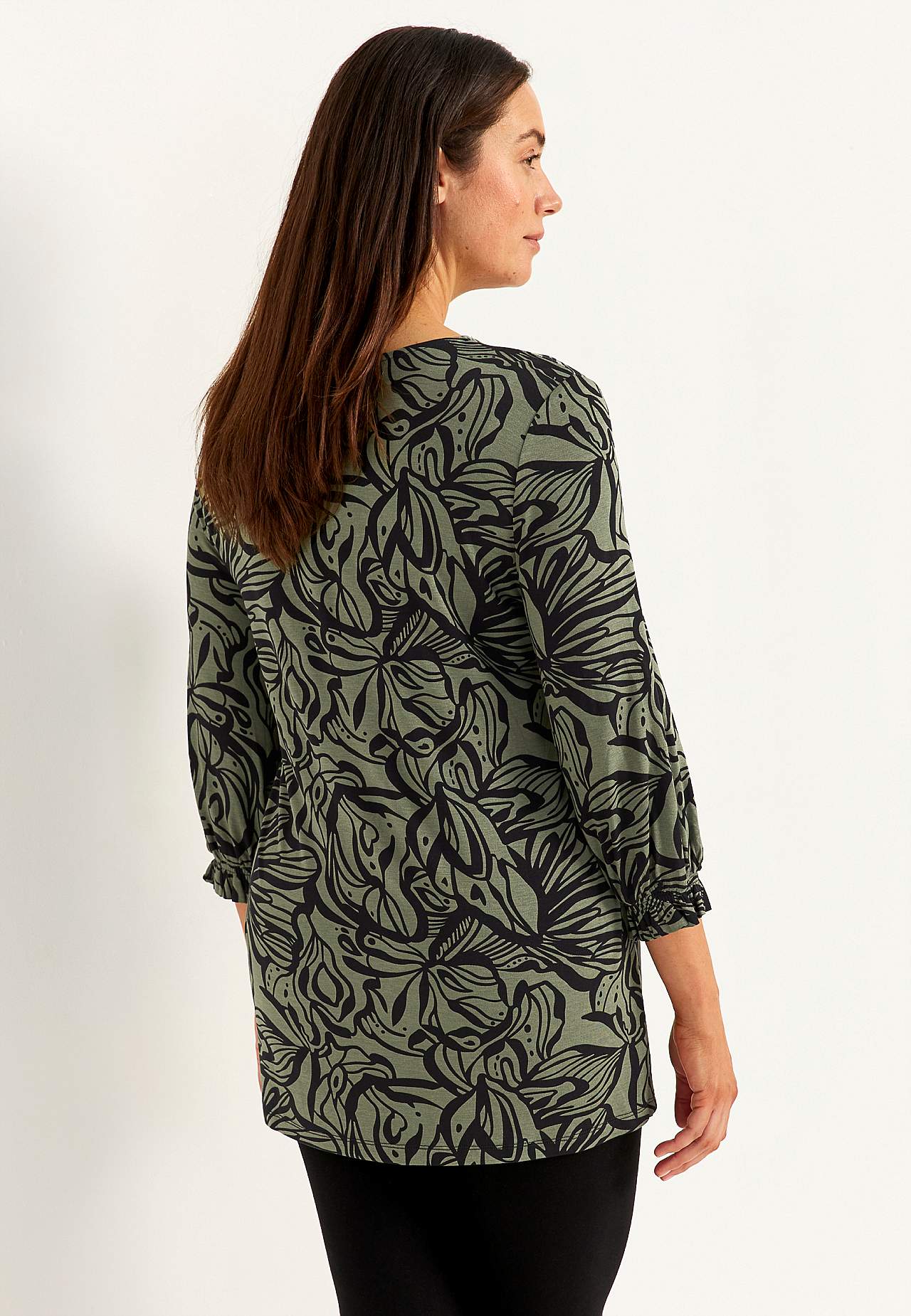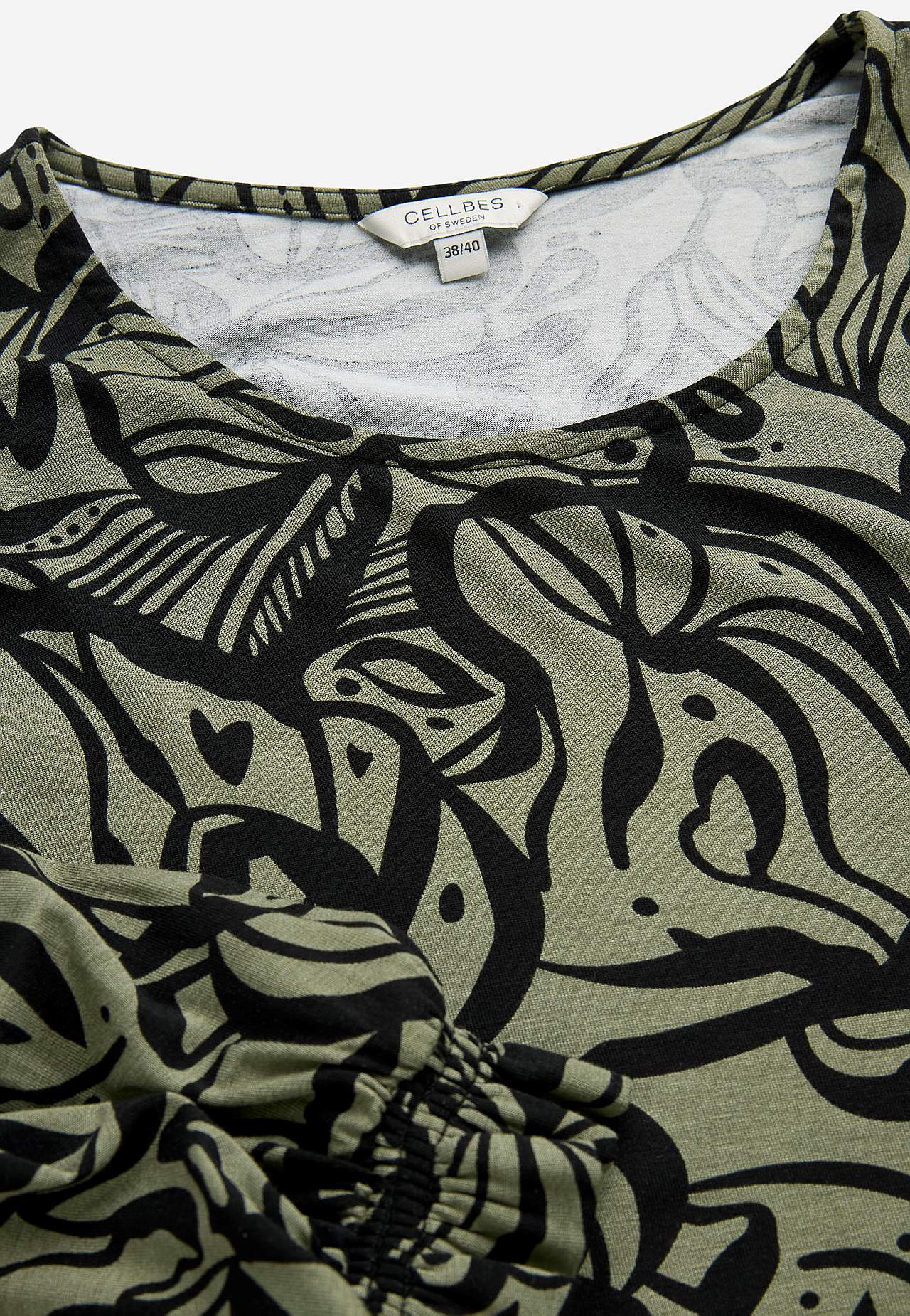 Angenehmer, dicker Faltenwurf. Normale Passform. Runder Ausschnitt. 3/4-lange, breite Ärmel und Smokarbeit an den Manschetten. Die Länge hängt von der Größe ab und beträgt ca. 73-80 cm (von der Schulter gemessen).