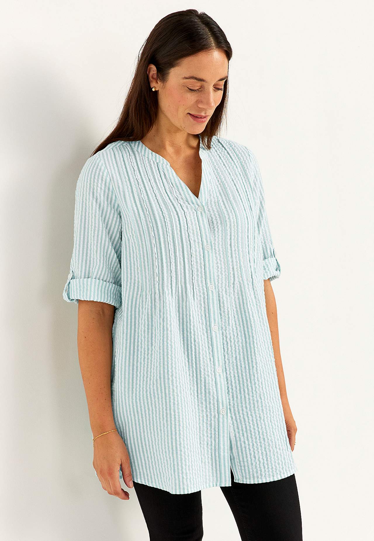 Luftiges langes Hemd mit dekorativer Biese. Süßes Material aus Seersucker. Runder Ausschnitt mit V-förmiger Öffnung. Knopfverschluss. 3/4-langer, breiter Roll-Up-Ärmel mit Knopf. Versteckte Taschen an der Seite. Passe auf der Rückseite mit Kräuselungen. Die Länge hängt von der Größe ab und beträgt ca. 82-94 cm (von der Schu... Mehr erfahren