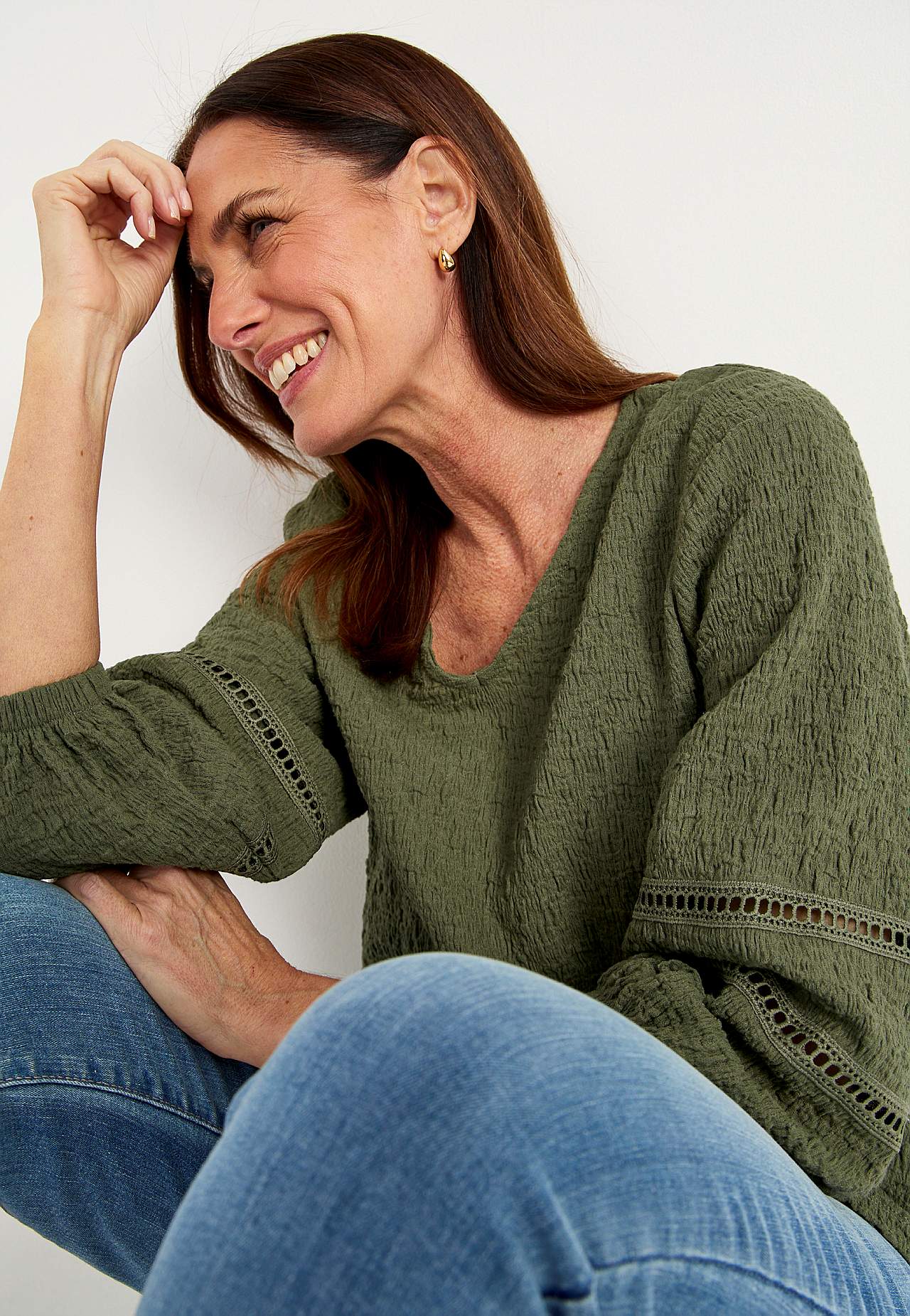 Tunika aus komfortabler, elastischer Baumwollmischung mit Struktur. Nette Details mit Lochmuster an den Ärmeln. Normale Passform mit sanft ausgestelltem Unterteil. Ausschnitt mit einem V-Ausschnitt. 3/4-lange, breite Ärmel mit Gummiband an den Manschetten und Zierstichen mit Lochmuster. Gerader Saum. Die Länge hinten hängt ... Mehr erfahren