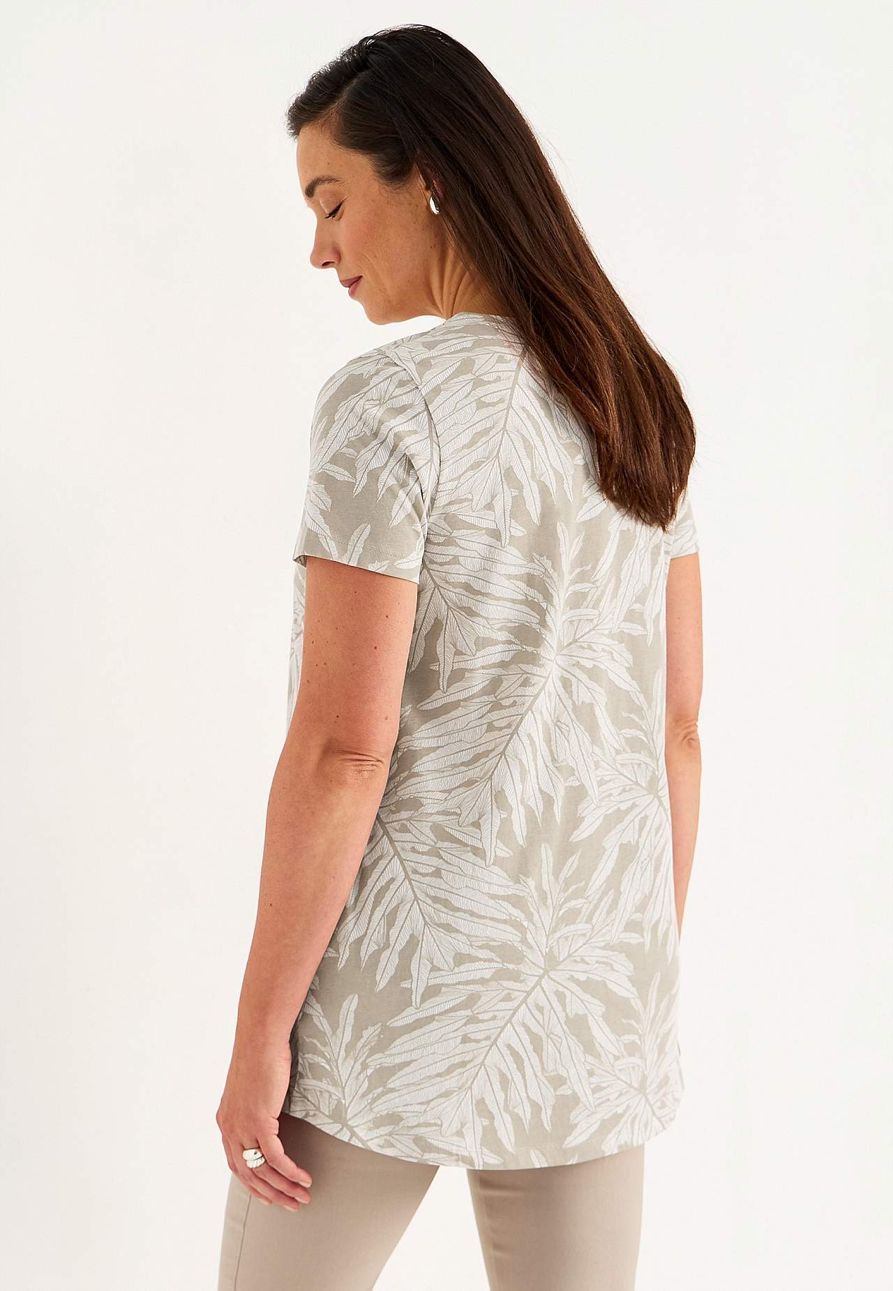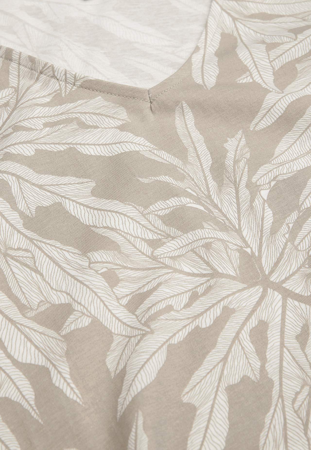 Jersey-Tunika mit angenehmem Blattmuster. Weiche, organische Baumwolle. Etwas enger anliegende Passform in A-Form auf der Oberseite. Ausschnitt mit einem V-Ausschnitt. Kurze Ärmel. Taschen in der Seitennaht. Runder Saum. Die Länge hängt von der Größe ab und beträgt ca. 78-86 cm (von der Schulter nach hinten gemessen).