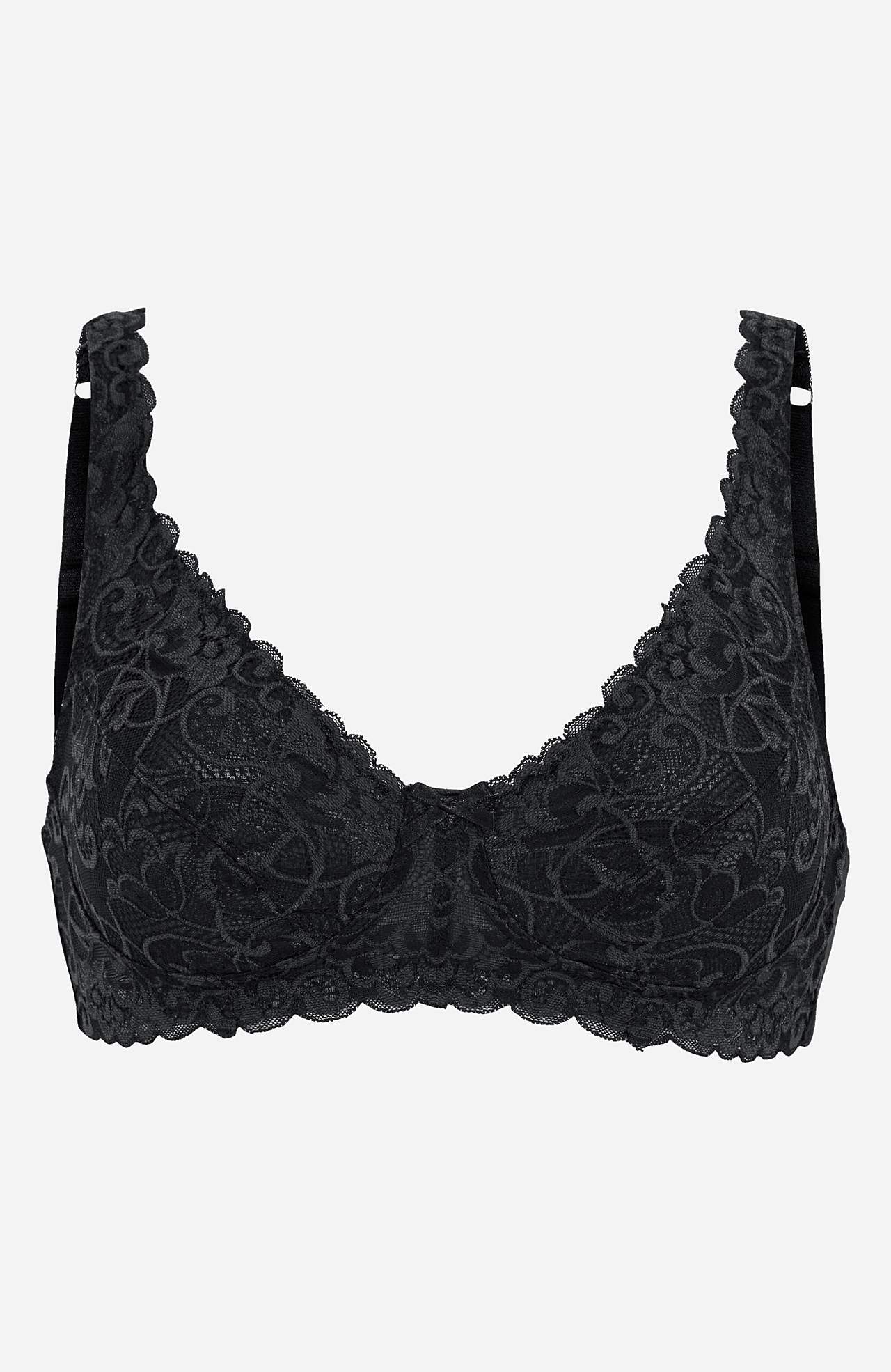 Weicher BH ohne Bügel. Geformte Spitzen-Körbchen mit hauchdünnem Mesh-Design. Rücken aus Mikrofaser. 2-reihige Verschlüsse im Rücken, 3-reihige Verschlüsse in den größeren Größen. Verstellbare Schulterträger.