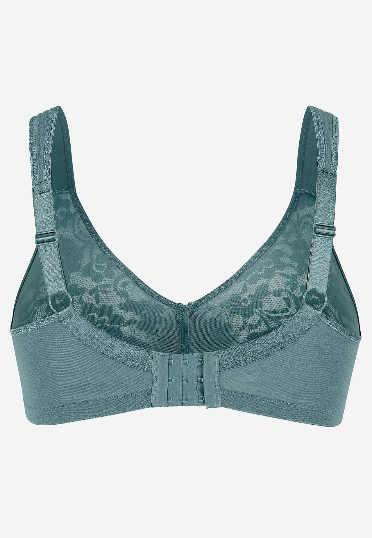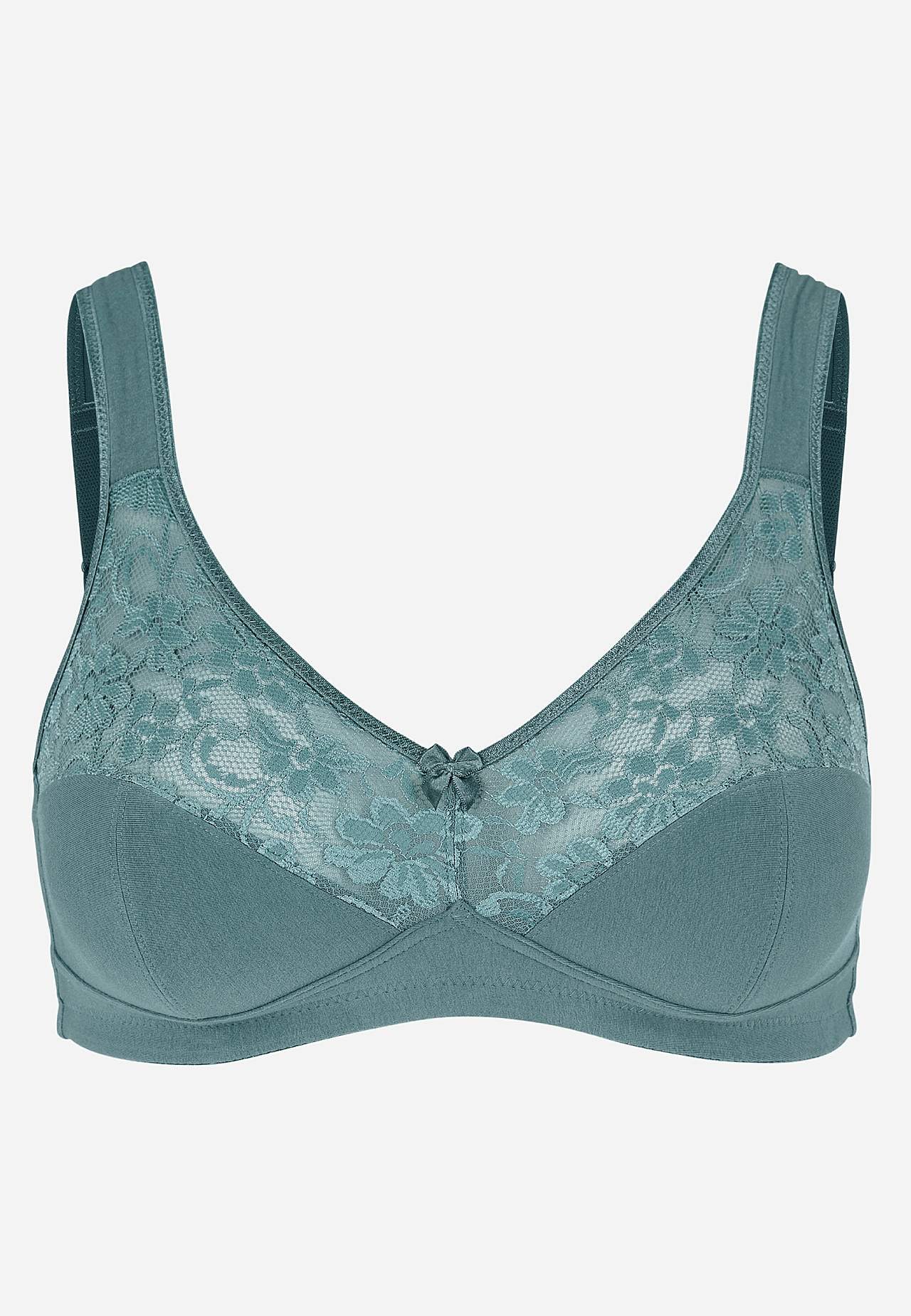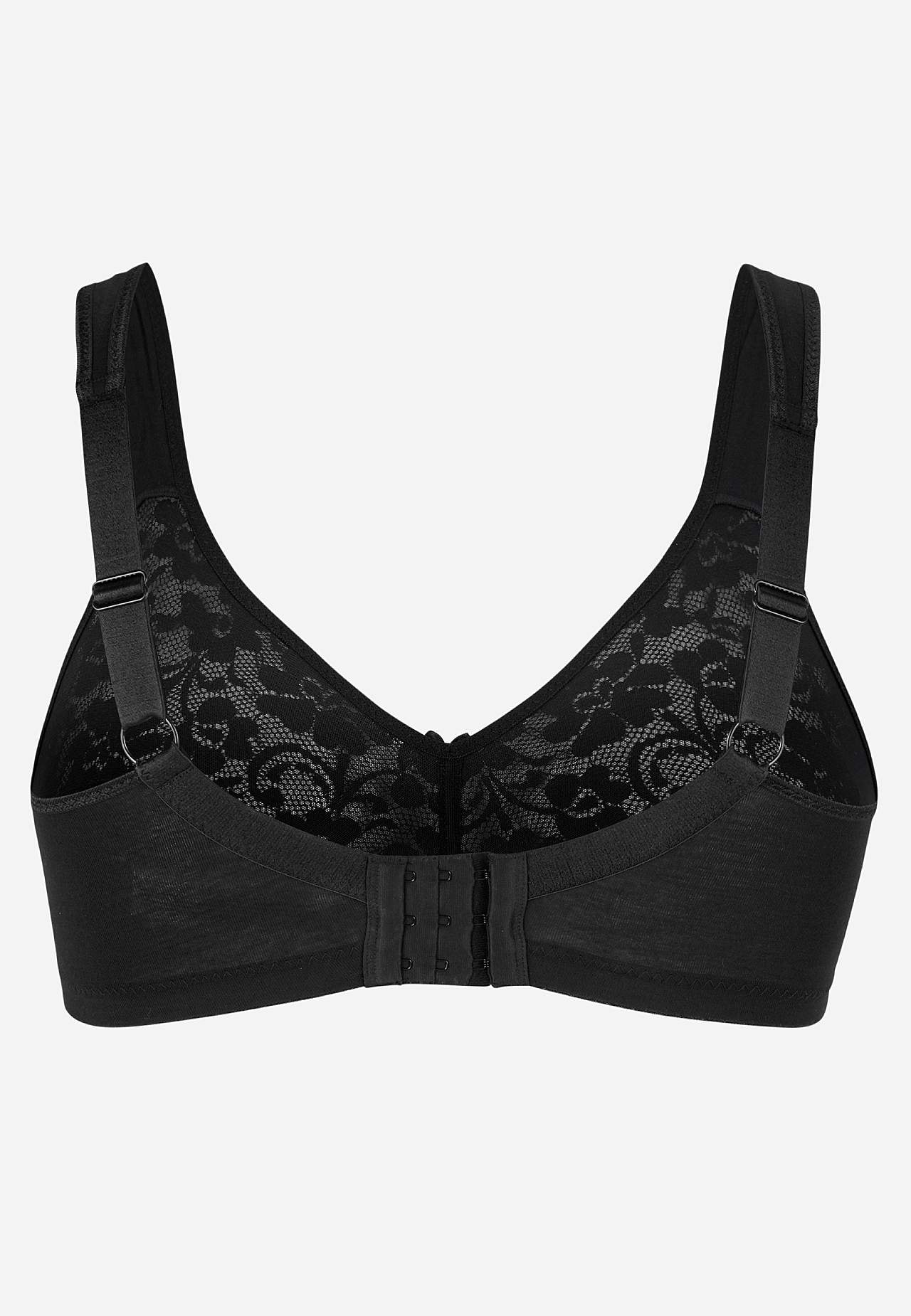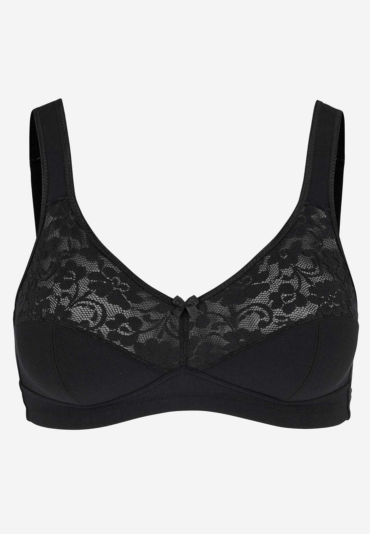 Bügelloser BH mit geformten, ungepolsterten Körbchen. Oberes Teil des Körbchens aus elastischer Spitze. Verstellbare Schultergurte. 2-reihige Verschlüsse im Rücken, 3-reihige Verschlüsse in den größeren Größen. Auch im 1er-Pack erhältlich: 620005.