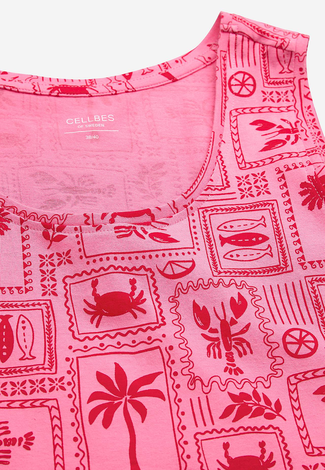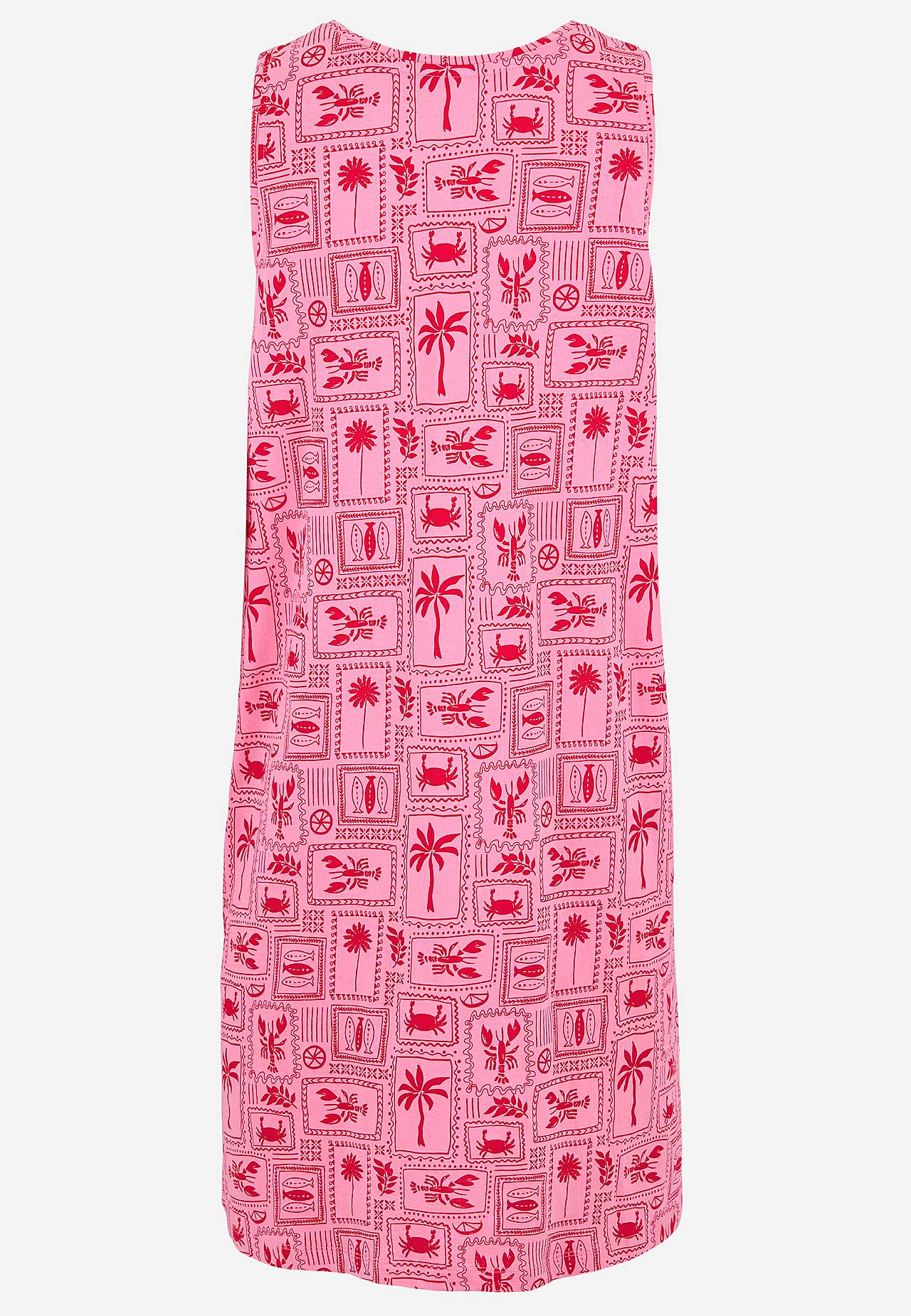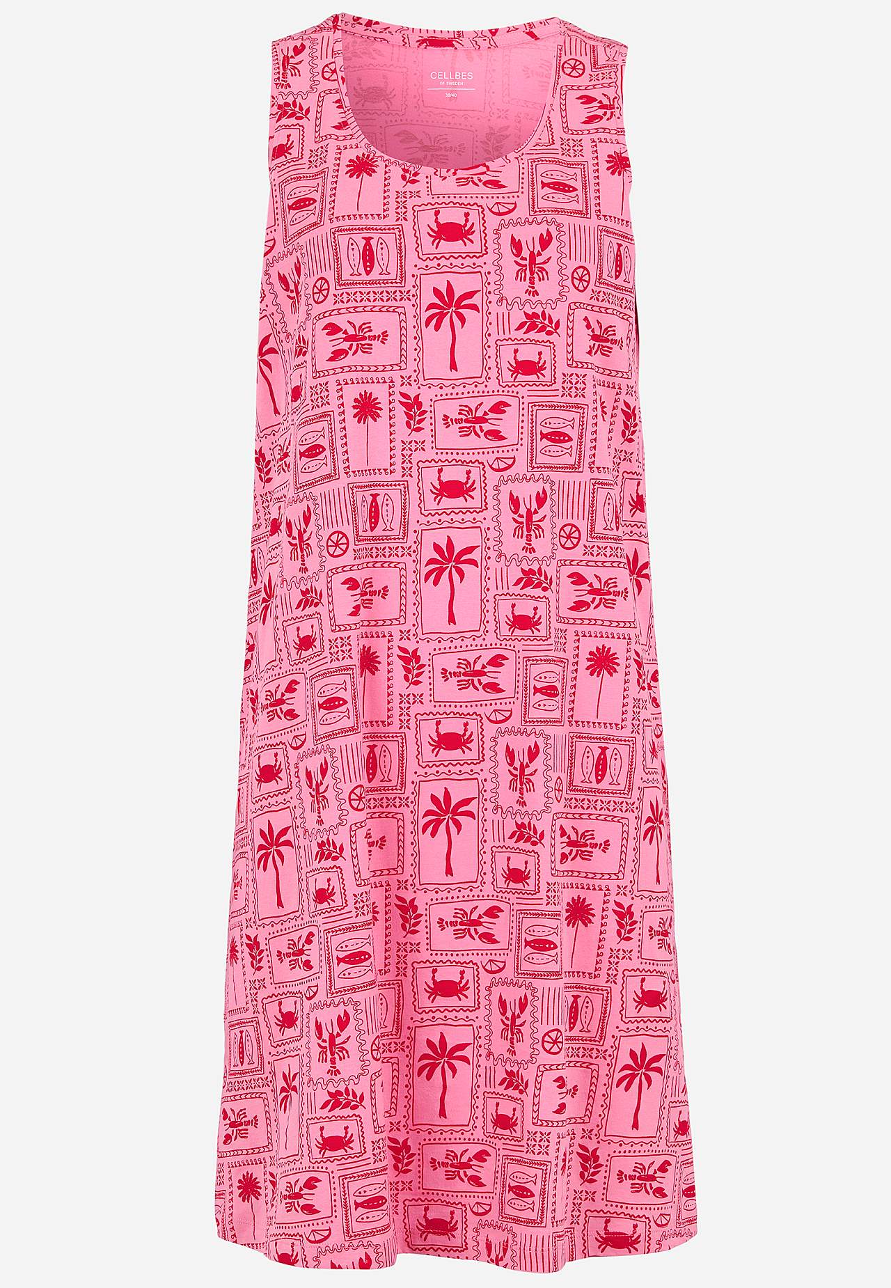 Kurzes, gemustertes Nachtkleid aus weicher Bio-Baumwolle. Lässige Passform. Rundausschnitt. Ärmelloses Modell. Gerader Saum mit Schlitz an den Seiten. Die Länge hängt von der Größe ab und beträgt ca. 94-101 cm (von der Schulter nach hinten gemessen).