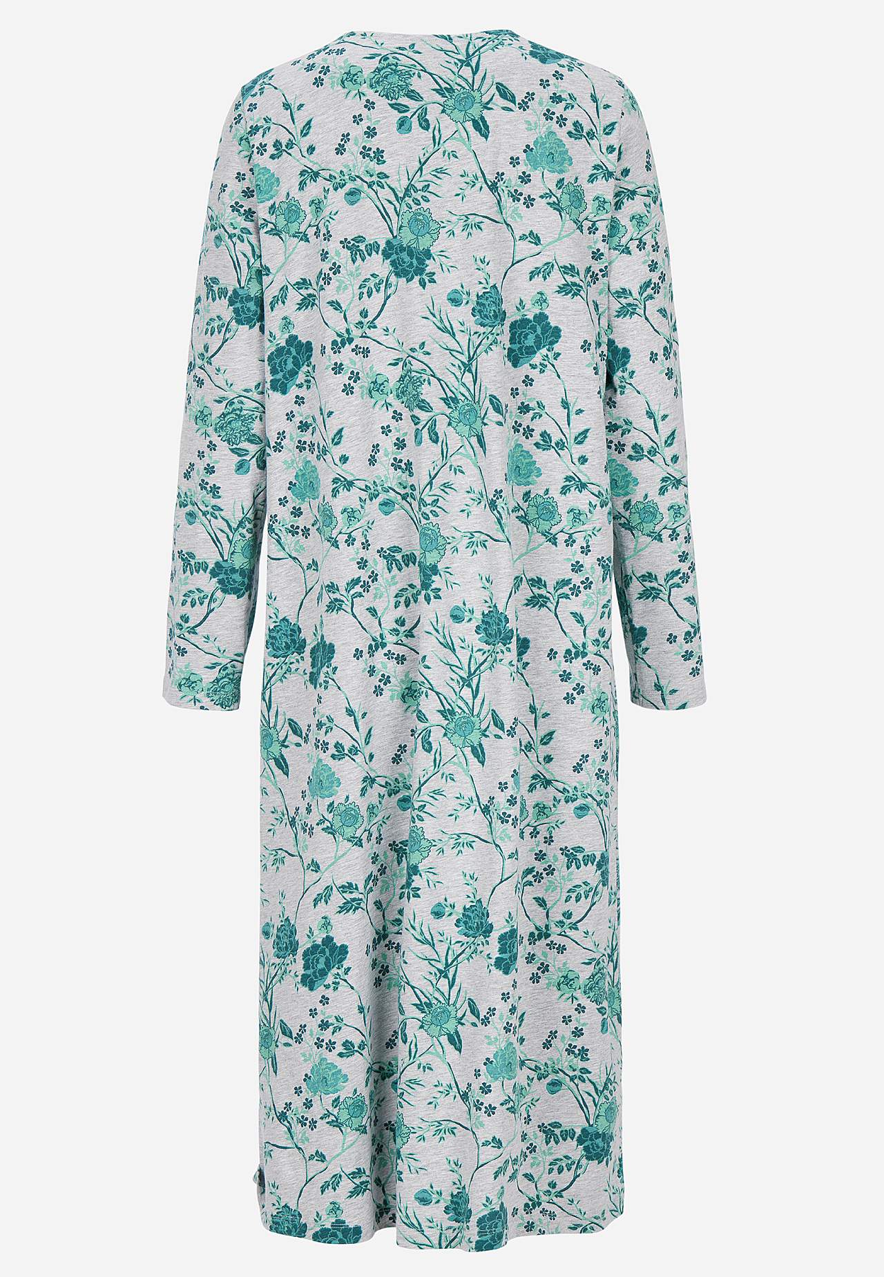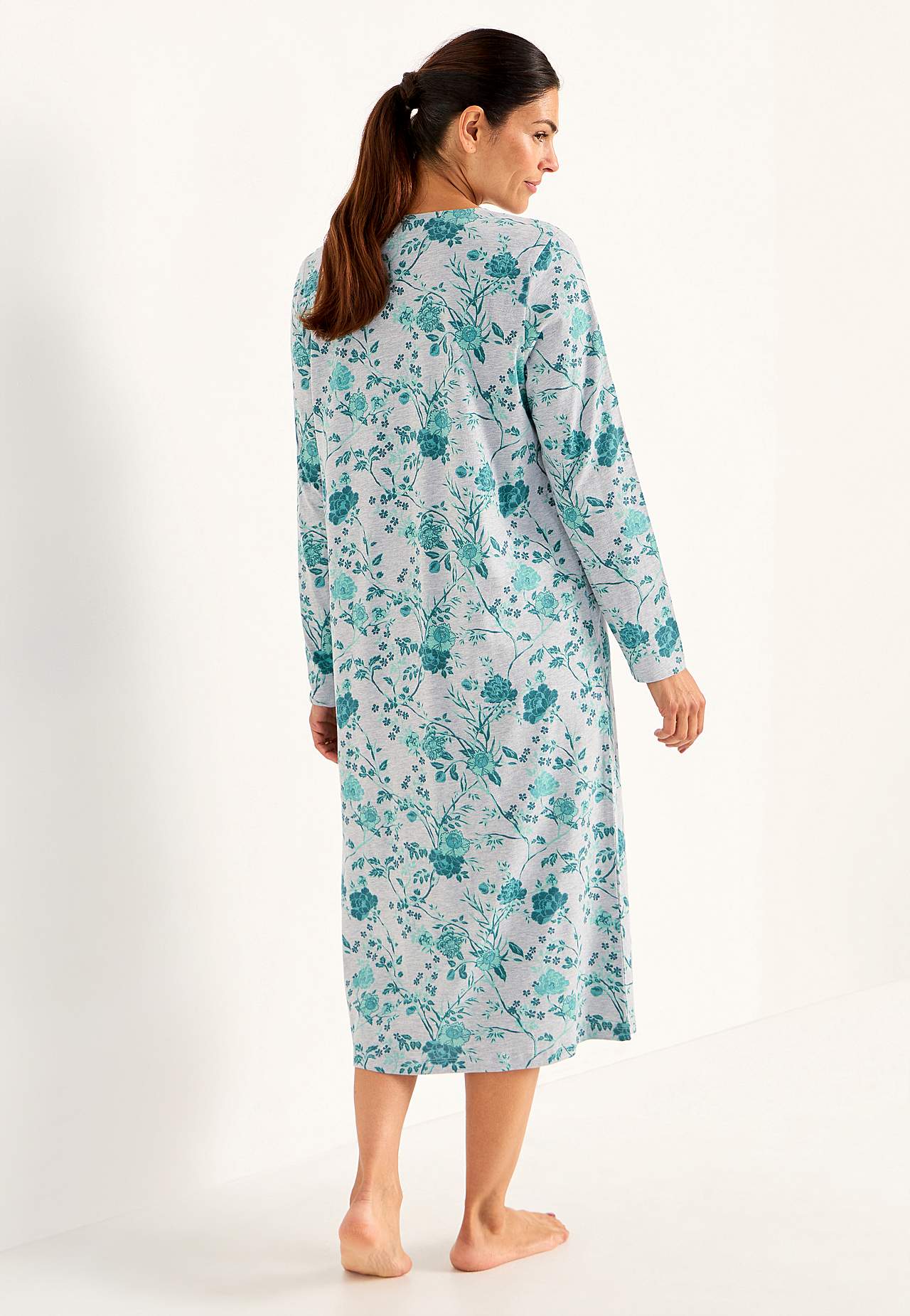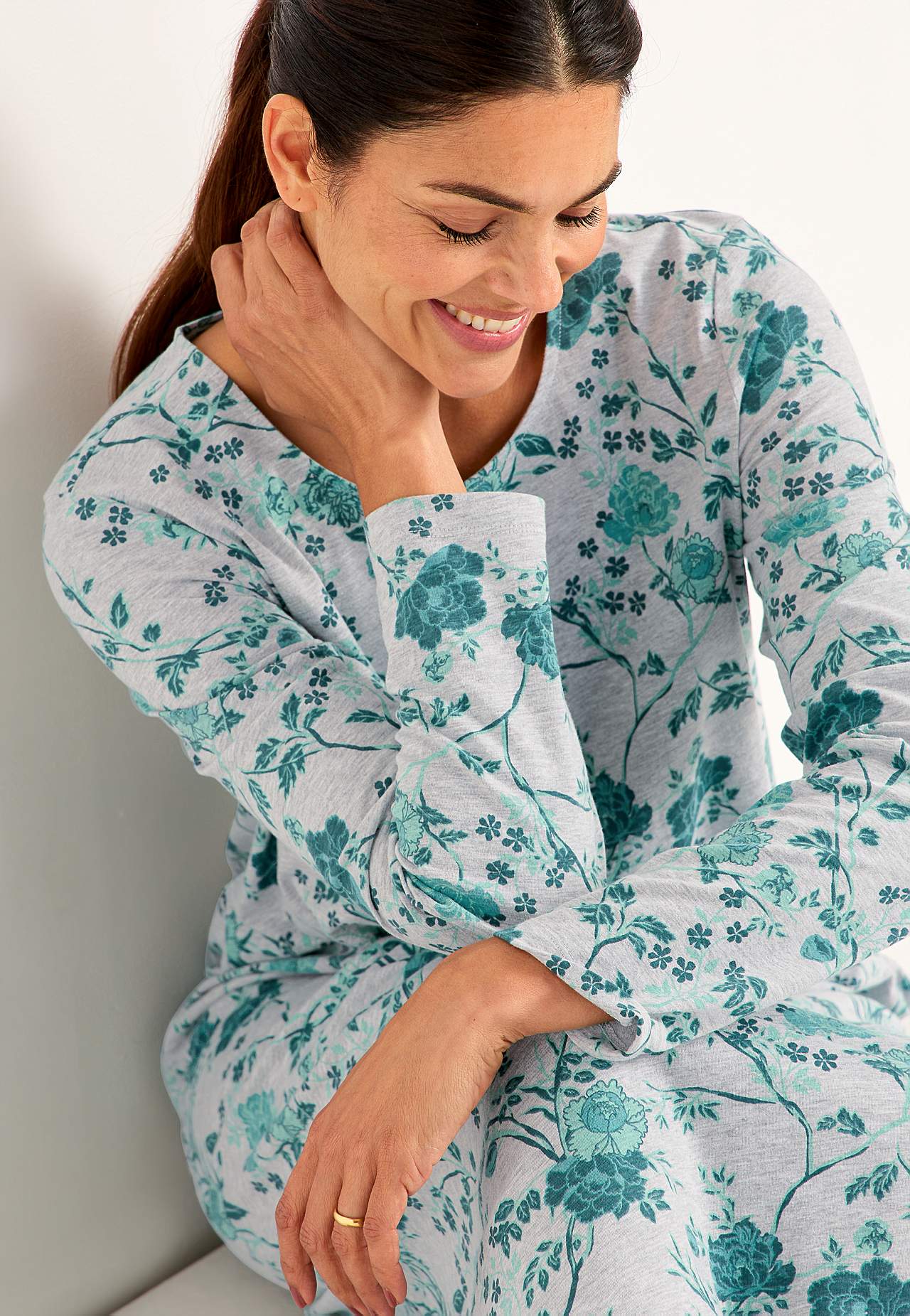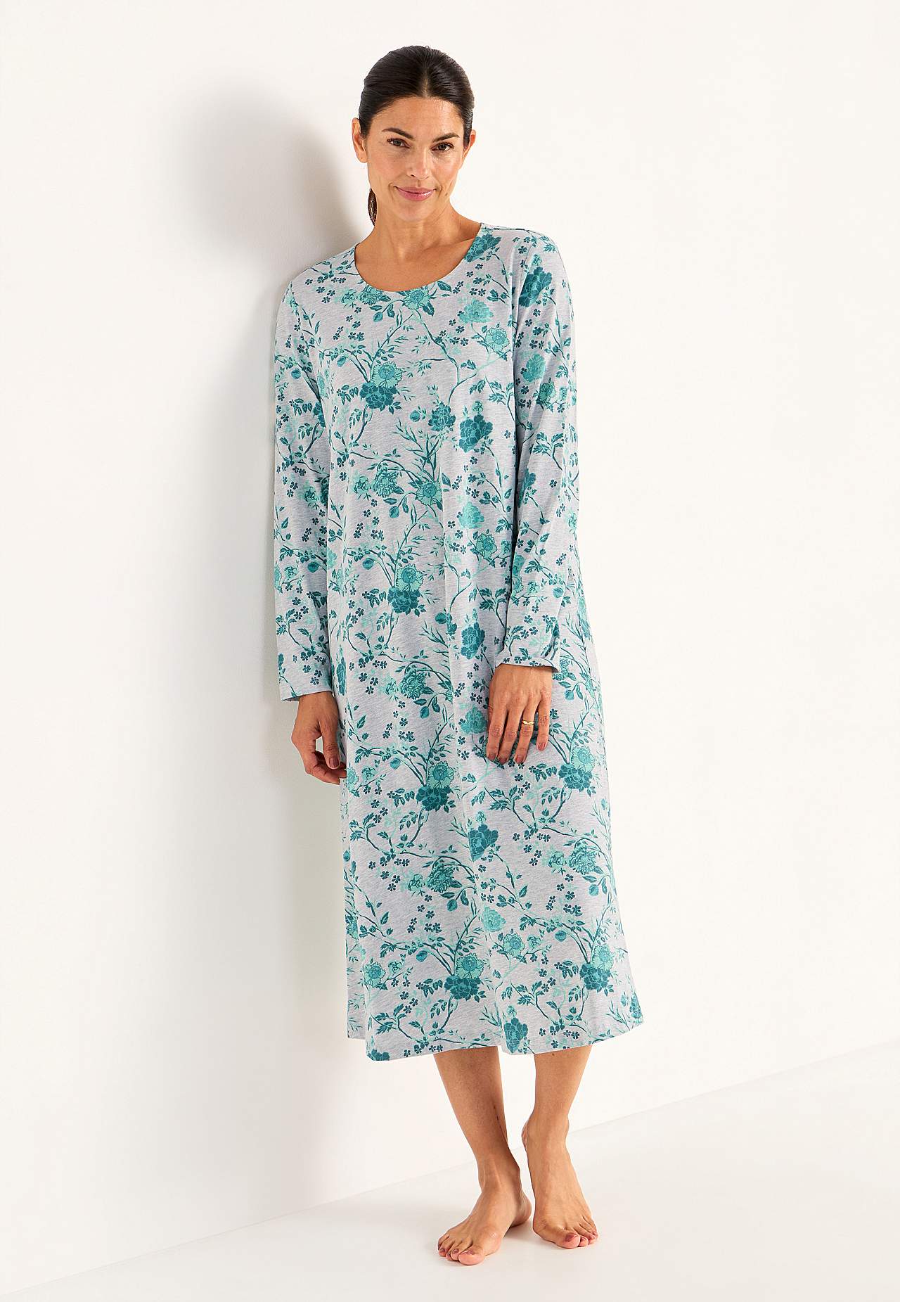 Weiches Nachtkleid aus Bio-Baumwolle. Gerader Schnitt. Rundausschnitt. Lange Ärmel. Gerader Saum. Langes Modell mit gedrucktem Blumenmuster. Länge ab Schulter ca. 119 cm in allen Größen.