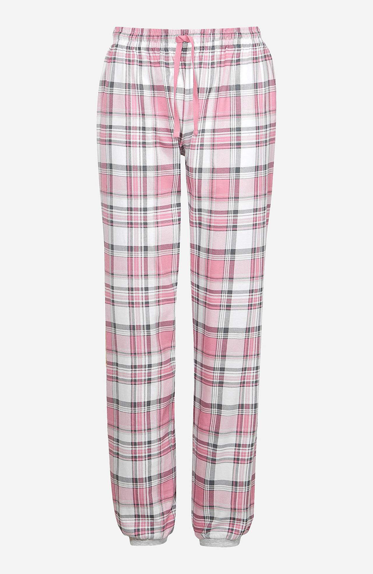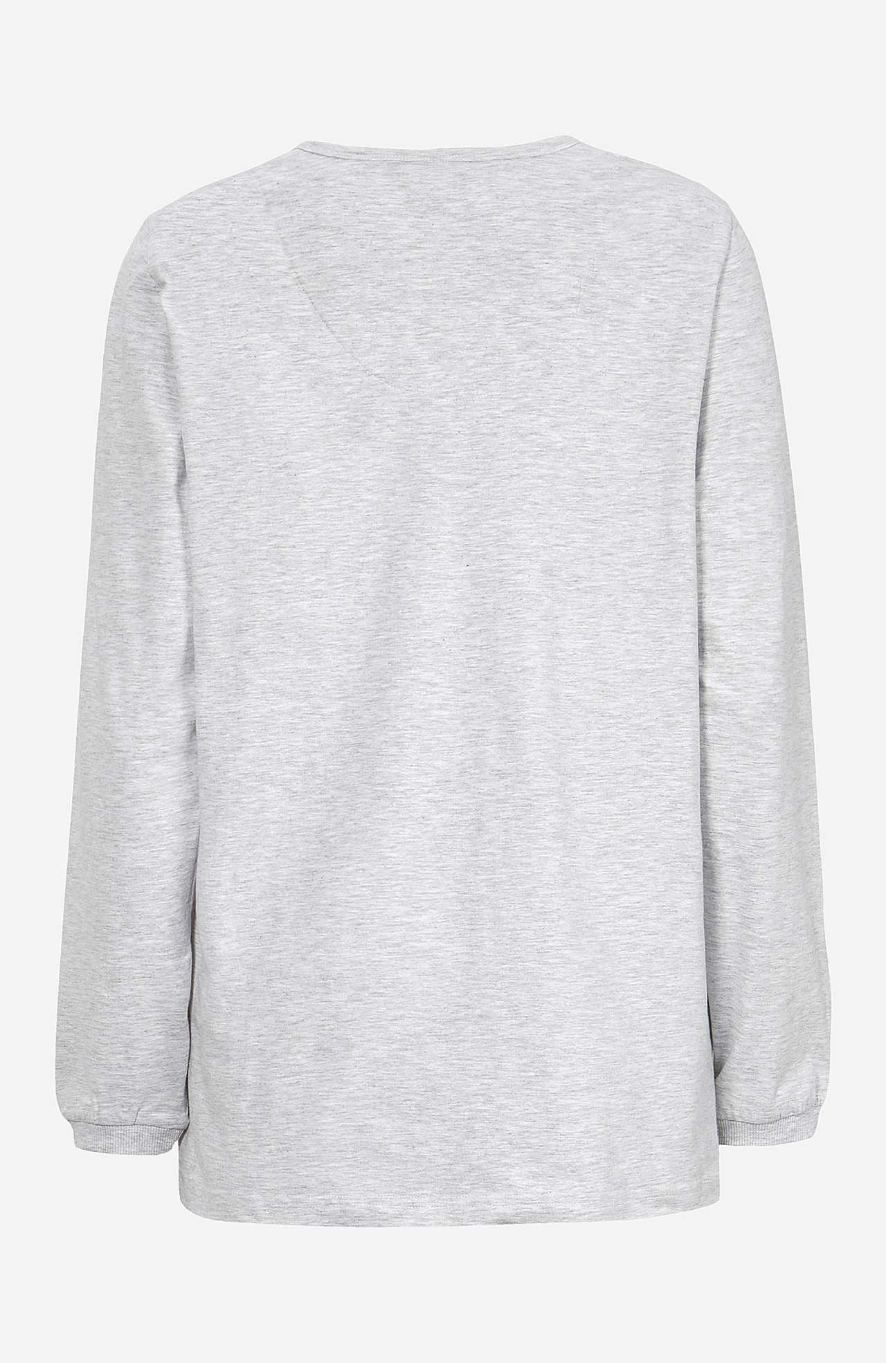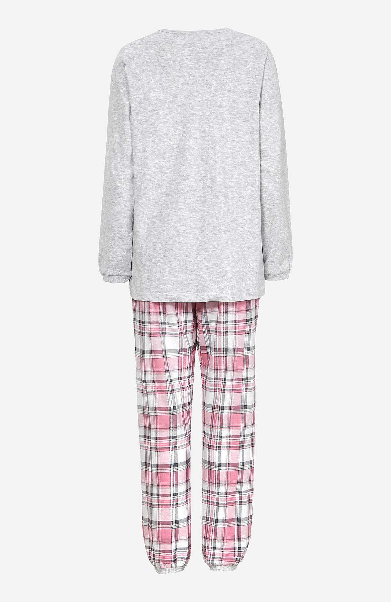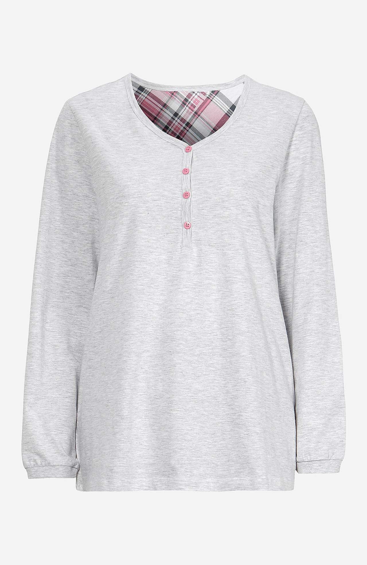 Trikå. Långärmad topp med knappslå. Byxa med resår och dragsko i midjan. Rygglängden följer storleken ca 66-77 cm. Innerbenslängd ca 79 cm i alla storlekar.