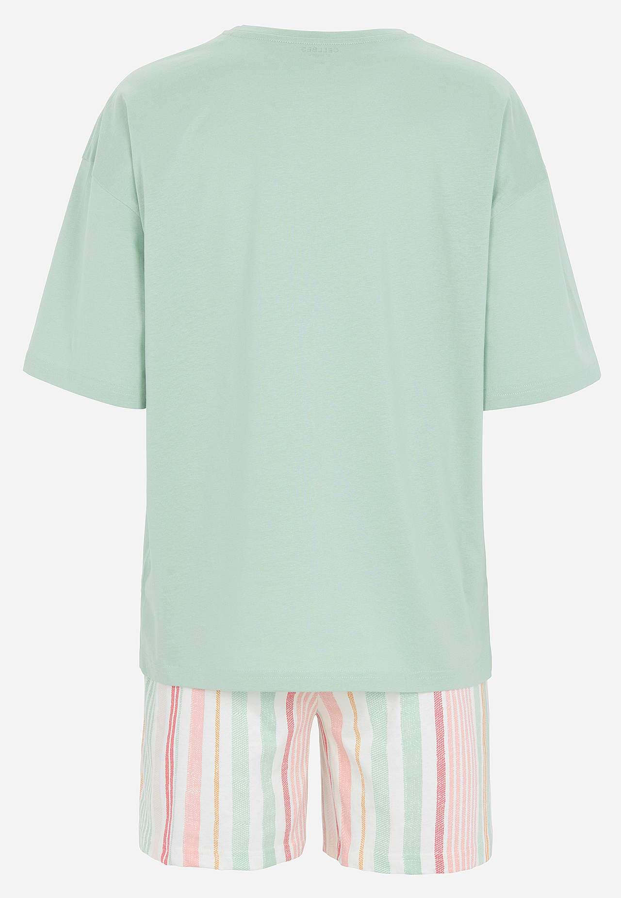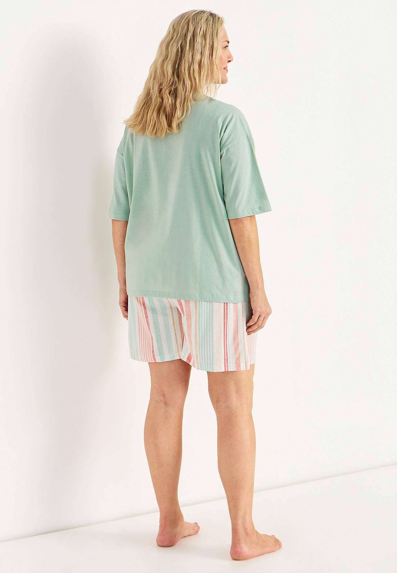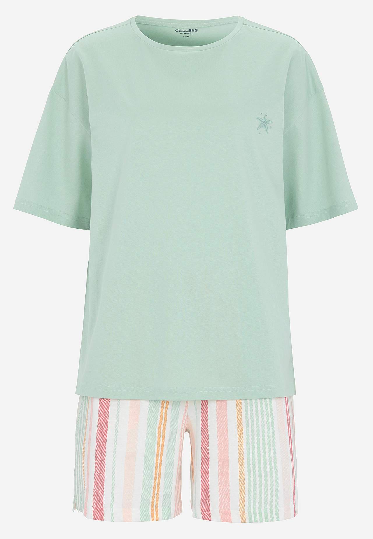 Schlafanzug mit kurzärmeligem Top und einer Shorts. Weiche, organische Baumwolle. Normale Passform. Oberteil: T-Shirt mit leicht überschnittener Schulter. Kleines Stickerei-Detail im gleichen Farbton auf der linken Seite. Kurze Ärmel. Gerader Saum mit Schlitz an den Seiten. Die Länge hinten hängt von der Größe ab und liegt ... Mehr erfahren